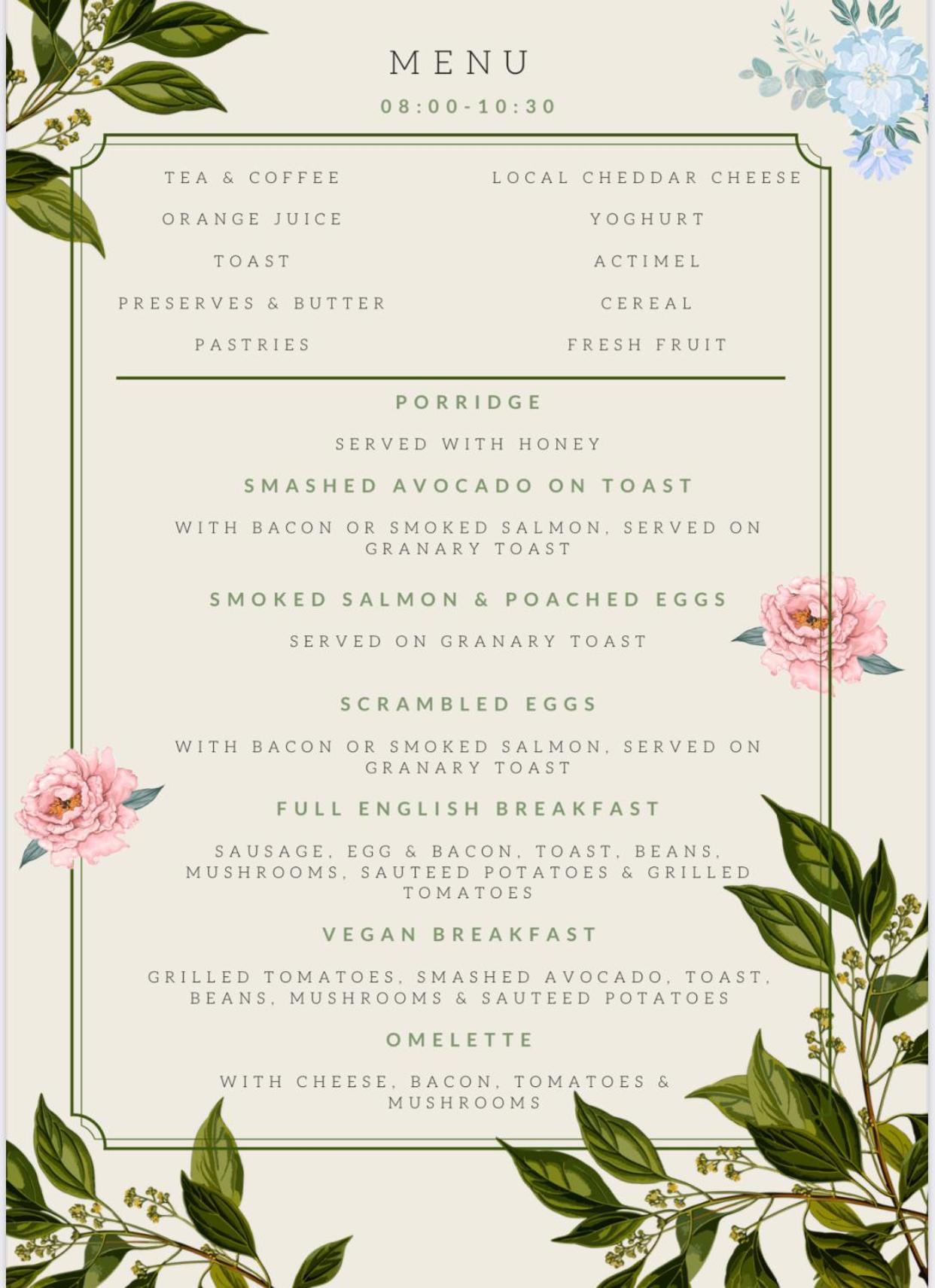 Breakfast is available at the property for all guests, served in either the breakfast lounge, guest bedrooms or the terrace; between 08:00-10:30.