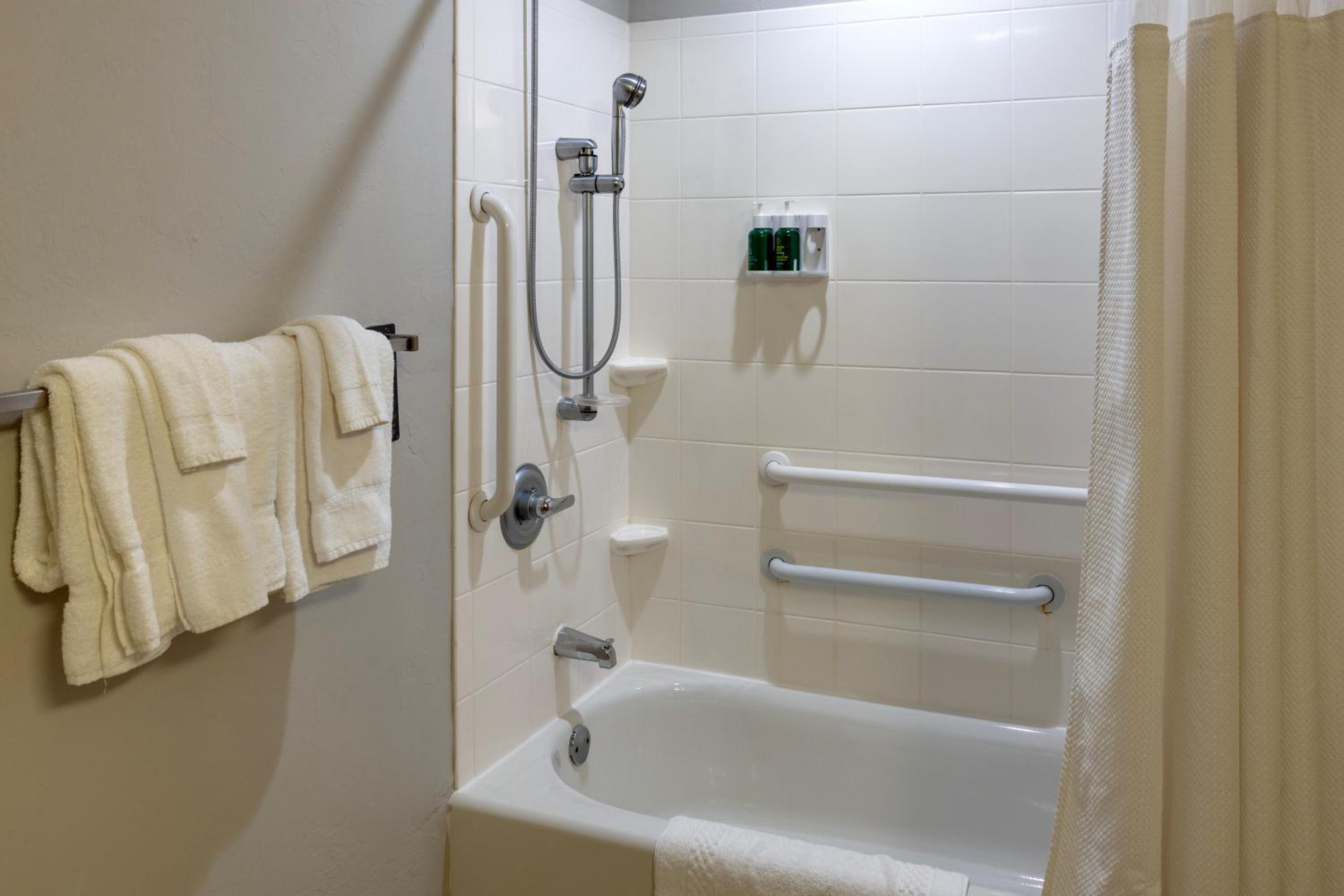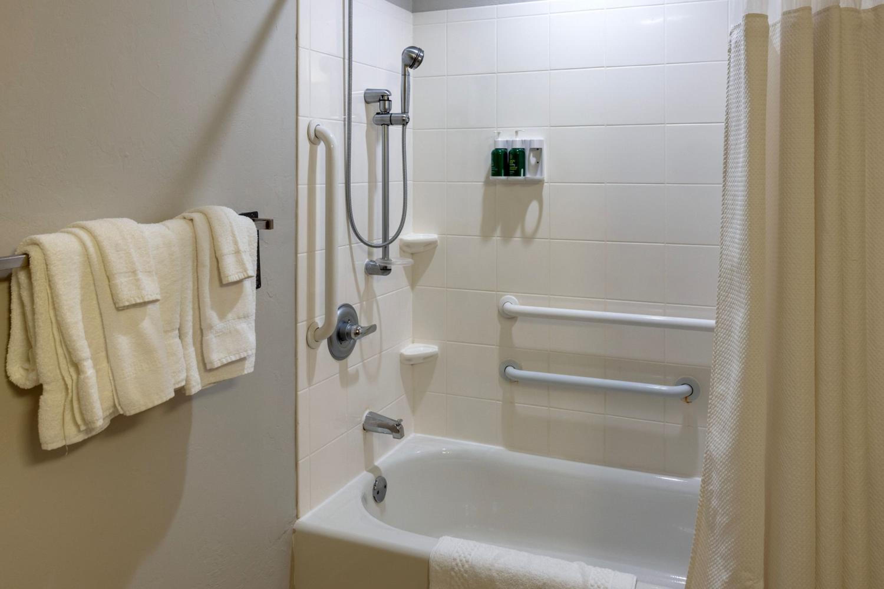Plenty of eating options in the area. First room assigned was right next to elevator and there was a constant noise from that area of the room next to bathroom and adjacent to the bed. Front desk moved us. The bathroom was clean but tub only in fair condition.