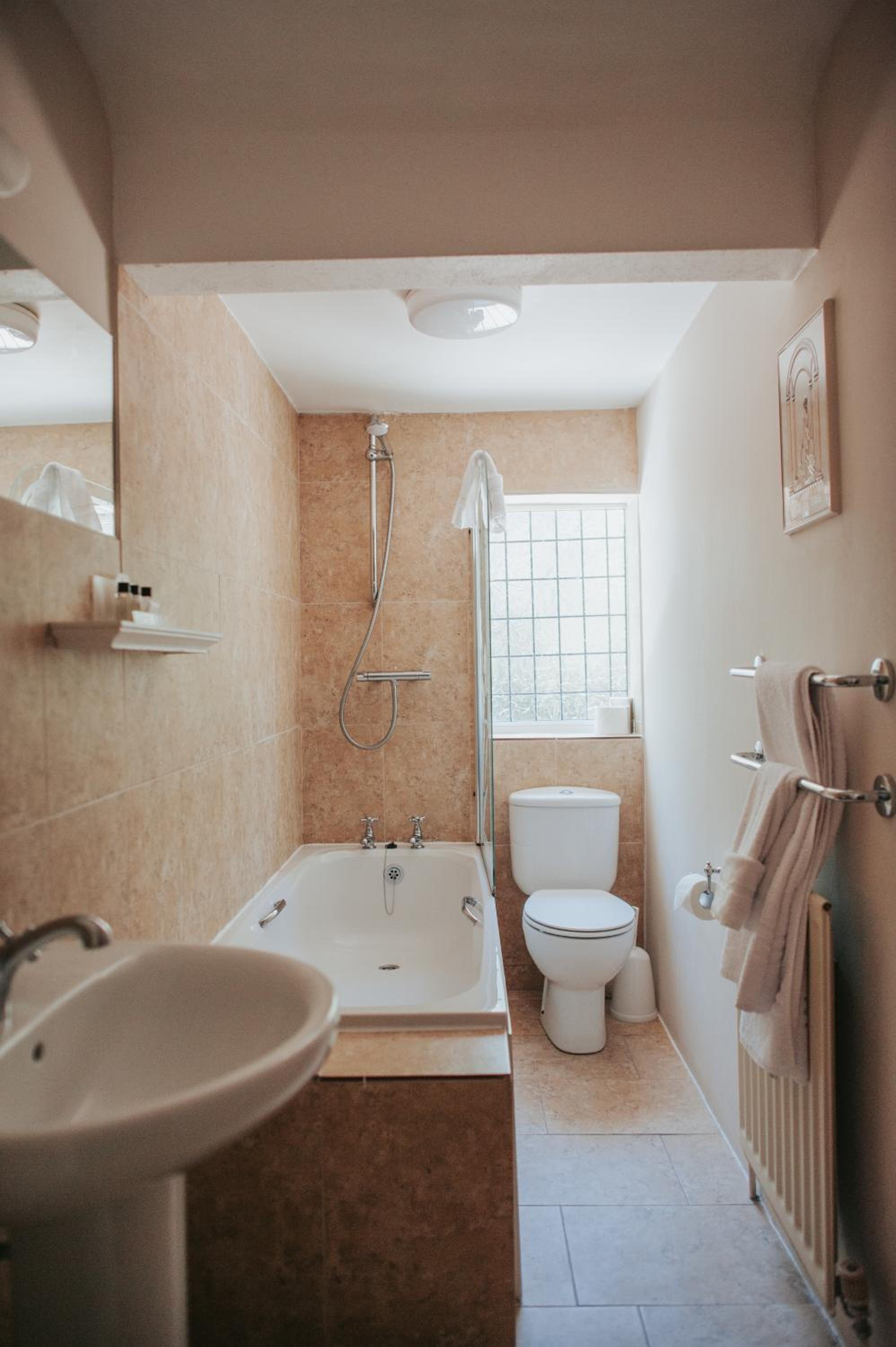 Situated away from the roads, the hotel was peaceful and welcoming. We were made welcome and well informed of breakfast times and directions to our room. The room was a good size with a nice bathroom, shower over bath and a few complementary bottles for washing.
