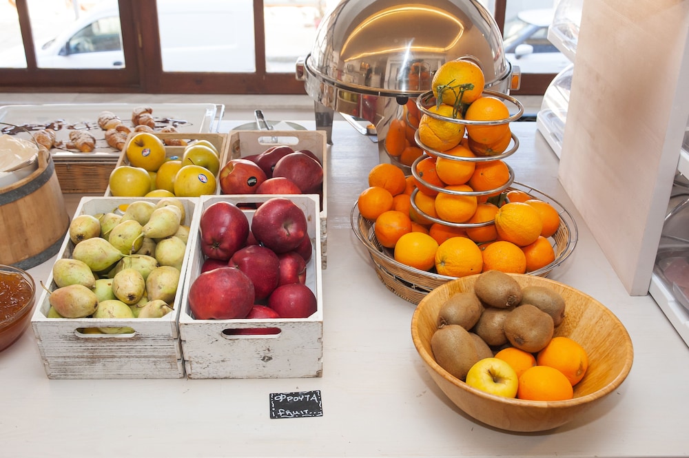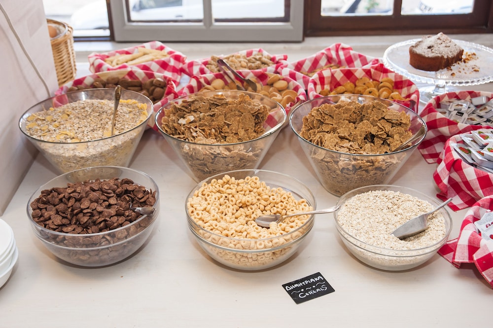 The lobby was quite nice and the room clean and comfortable. Our view was of a run-down building, and showers in Greece seem to have glass that only covers one side, but we had what we needed. We arrived a few hours prior to check-in and were permitted to leave our luggage with the front desk. Reina, who managed the front desk for much of our time there, was lovely and helpful. There is a marble staircase or a small elevator to reach higher floors. Breakfast is served on the first floor (which is above the lobby, or ground, floor) and consists of small pastries, eggs, fresh fruit, Greek yogurt with several fruit jams and honey, cereal, and the like.