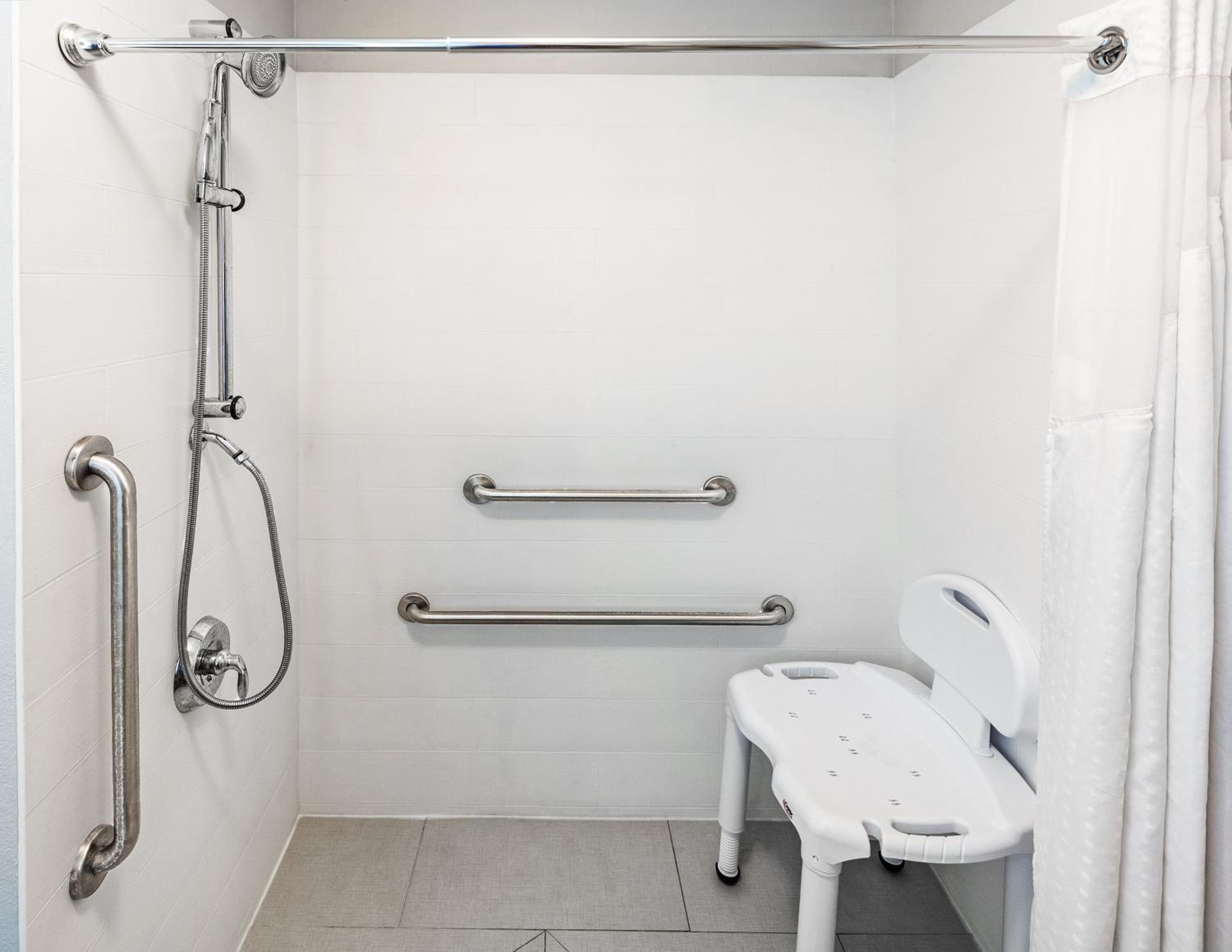 During my stay at the holiday Inn, I was disappointed that after requesting confirmation before booking that the handicap shower chair be fixed and operable, I was giving the same room with the same broken chair again. Additionally, although I was granted a late check out, housekeeping was still knocking on the door at 12:00 even though I did not check out until 2:00. This was rude and very unprofessional.