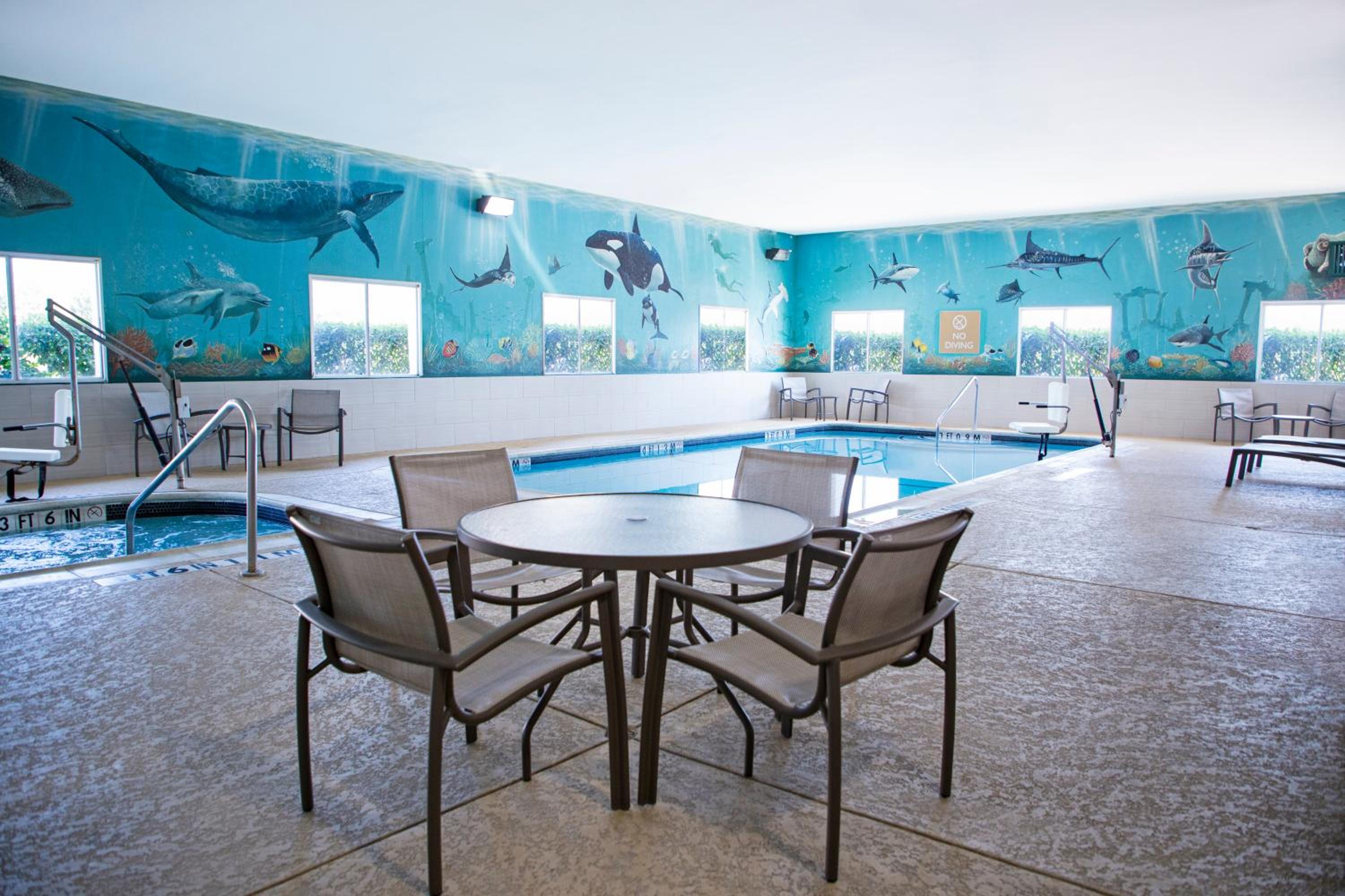 Guests can enjoy modern amenities including free high-speed internet, an indoor heated pool, hot tub, and spacious suites equipped with all the essentials for a comfortable stay, such as 32-inch TVs, microwaves, and work desks.