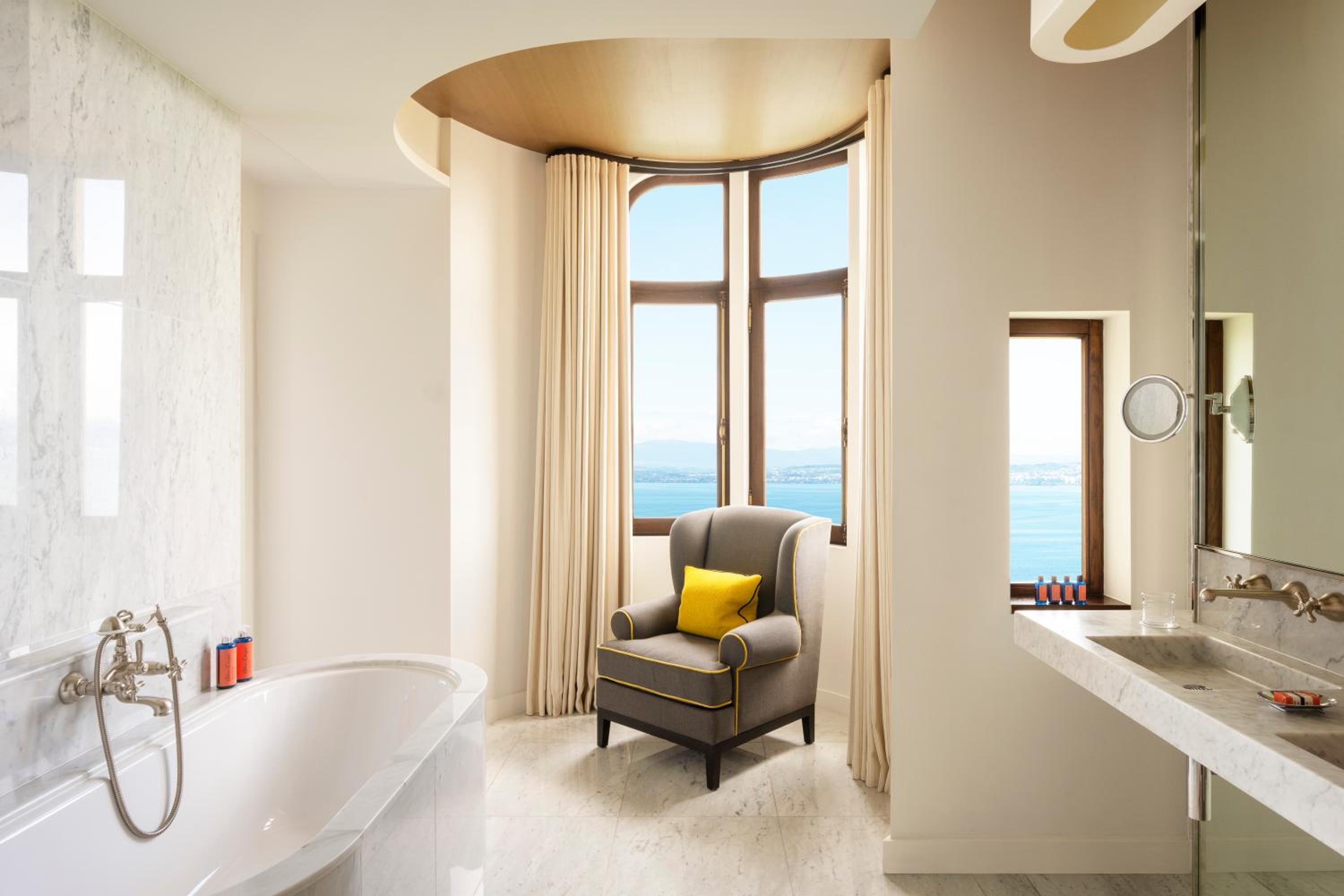 The Hôtel Royal Évian***** boasts 150 rooms and suites that seamlessly blend design and elegance with 5-star comfort, offering incomparable views of Lake Geneva. The prestigious 6th floor suites with private terraces overlooking the lake are simply breathtaking.