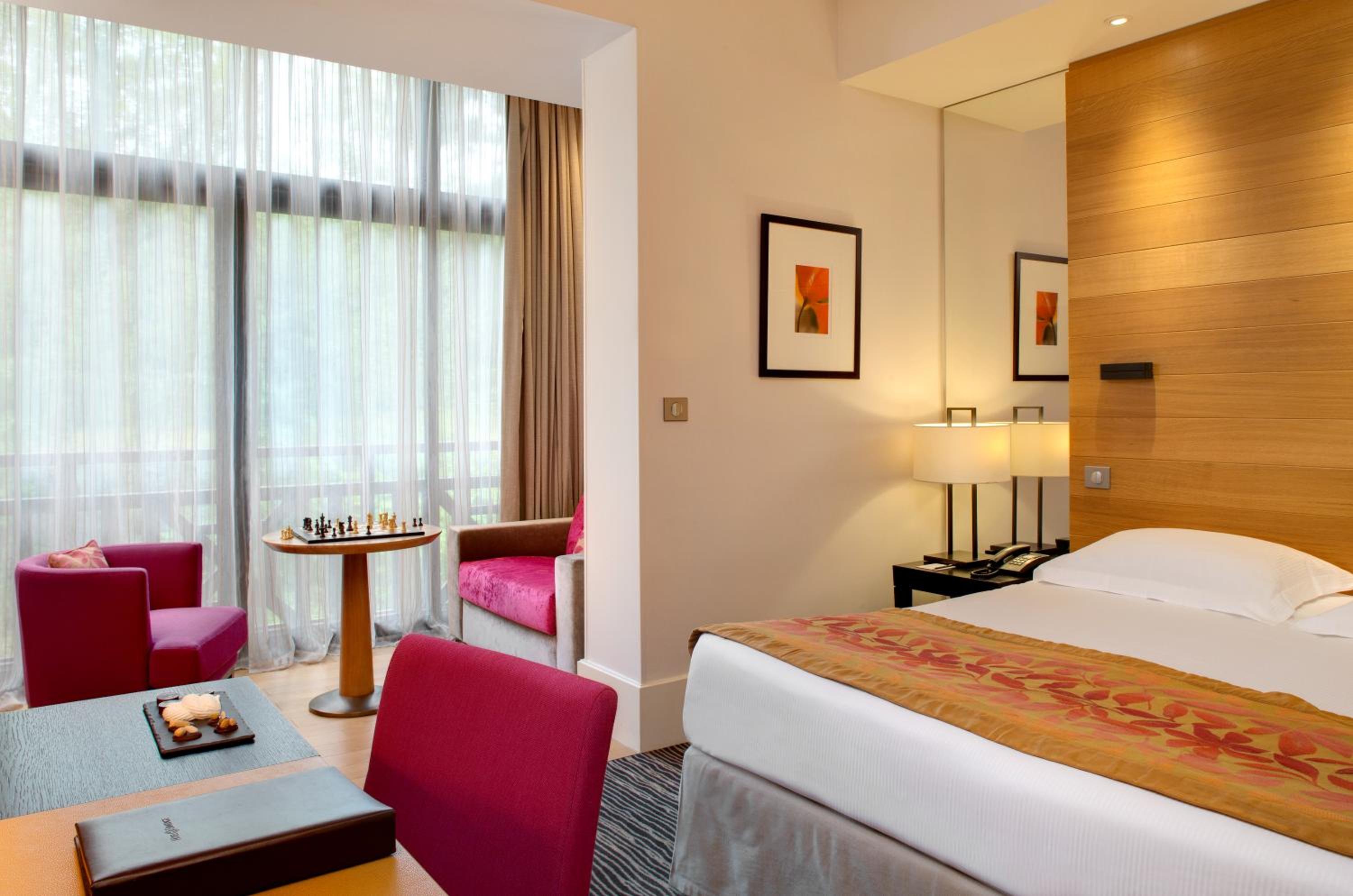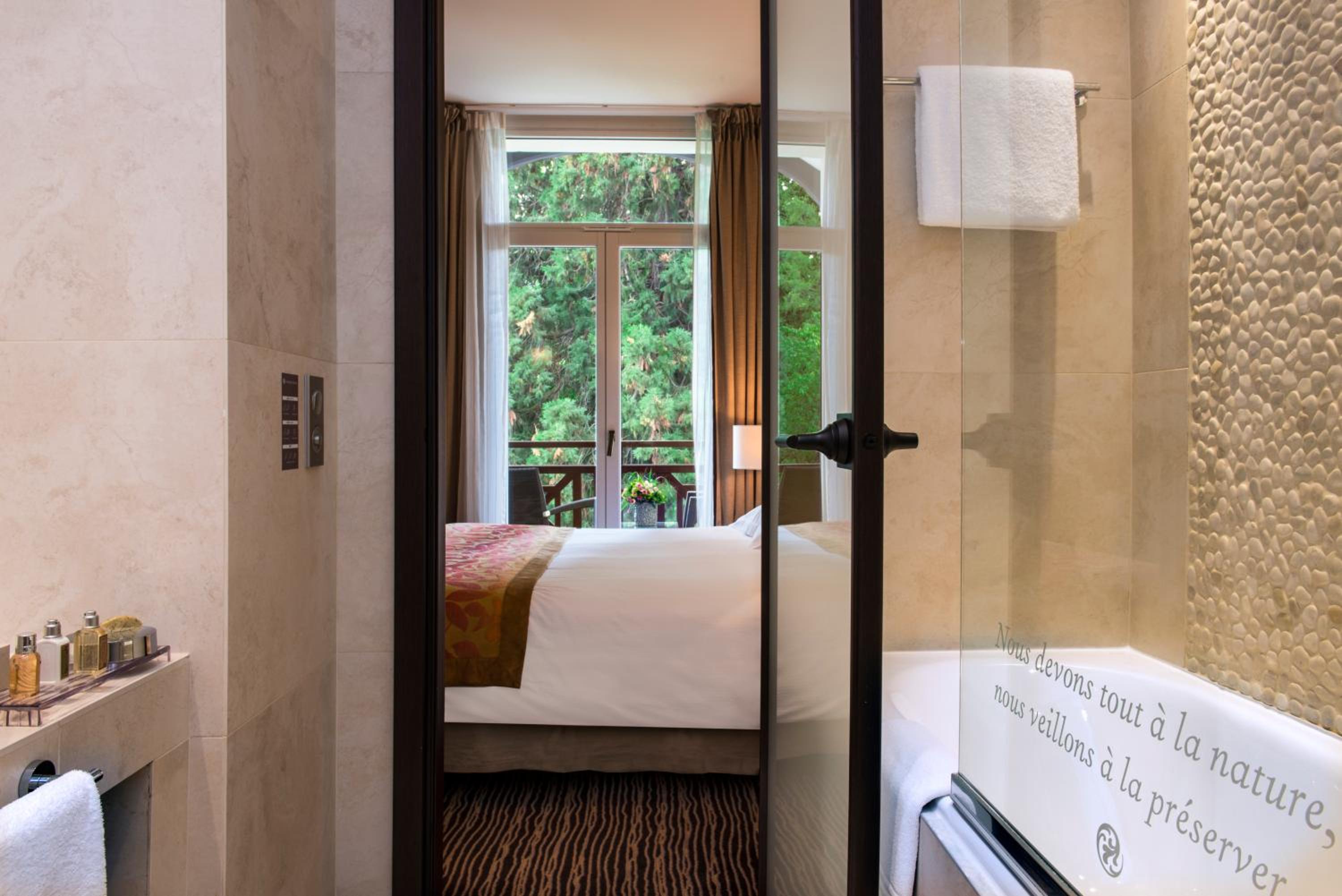 La vue sur le lac et les montagnes de la très belle chambre, les produits L’Occitane, l’offre de service et les équipements, le parc avec l’hôtel Royal est magnifique
