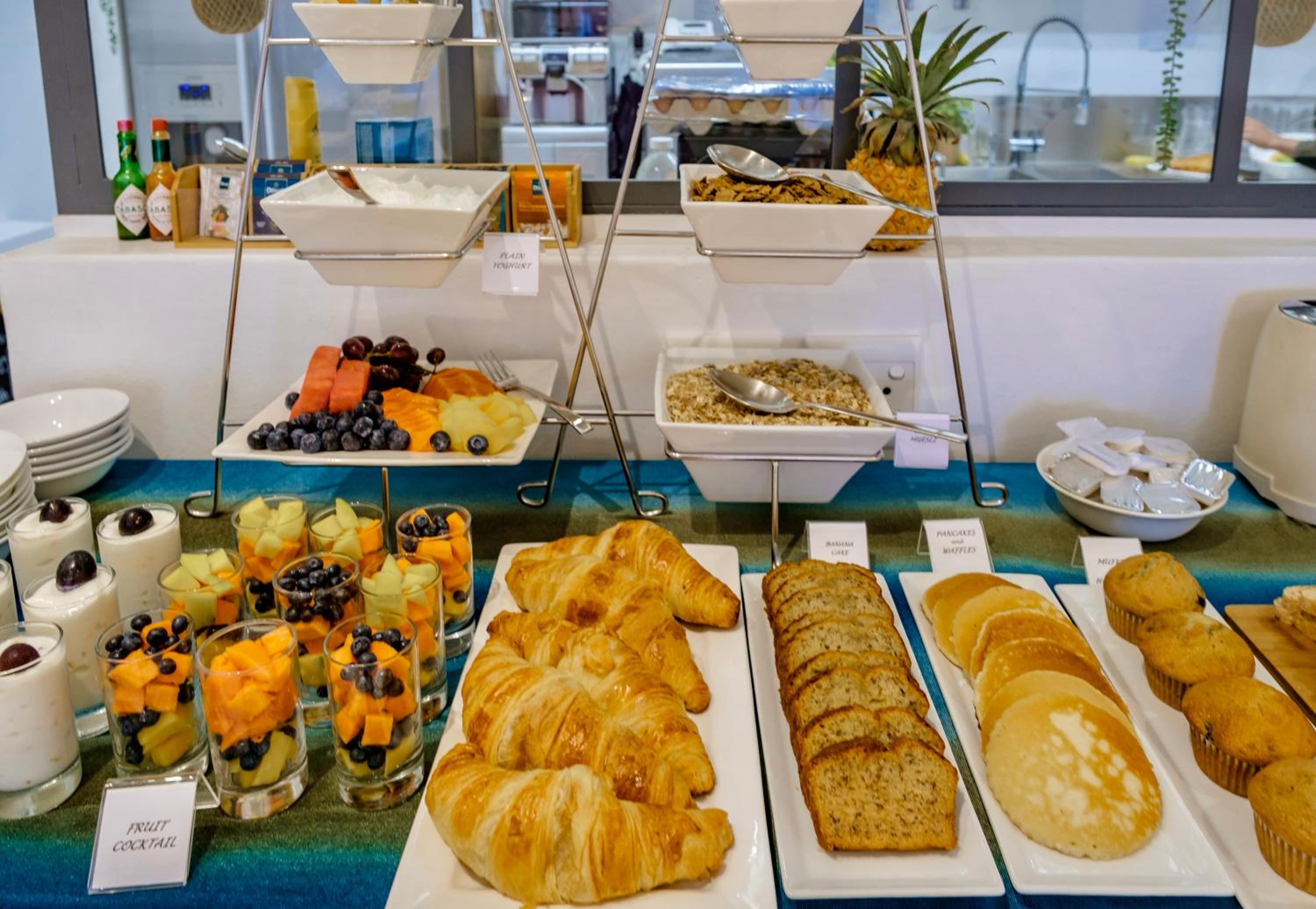 Breakfast buffet tightly laid out. Balancing act to serve oneself.
