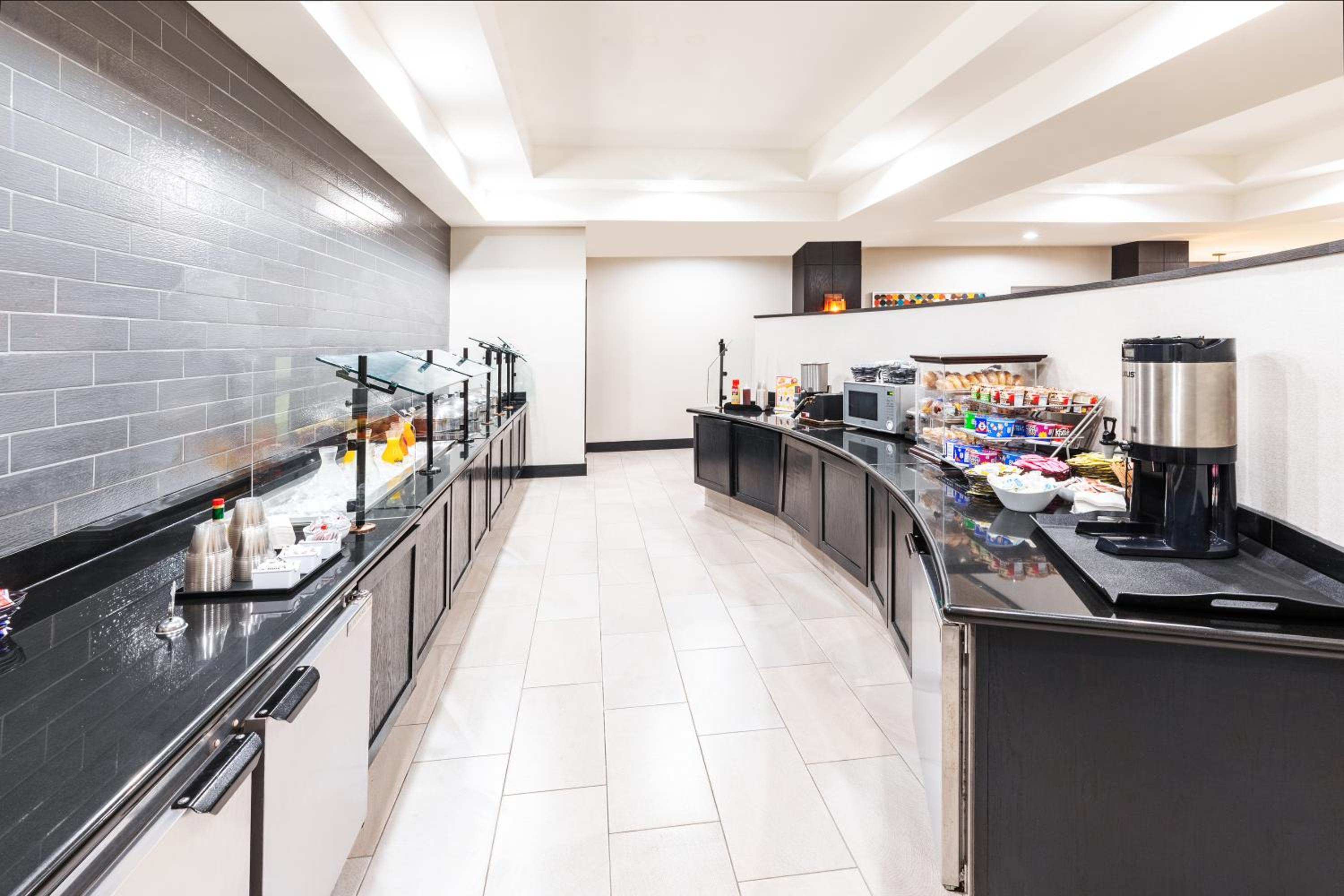 This hotel is a short drive from campus and downtown. It's next to another hotel and a Walmart but overall quiet without traffic noise. Check-in was efficient. There's a large sign saying breakfast buffet was 12.95 which was a bit of a surprise since HIE properties always seem to include free breakfast (while the original HI have restaurants with menus). Options include an OnCue gas station with a grill across the street, Walmart, or a short drive to Sonic or Braum's (and further down the typical fast food places).