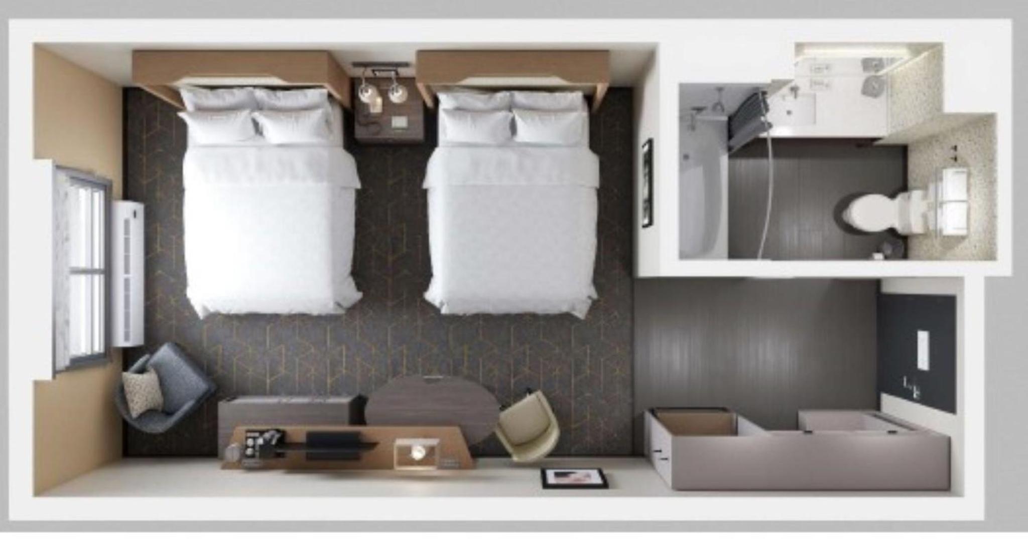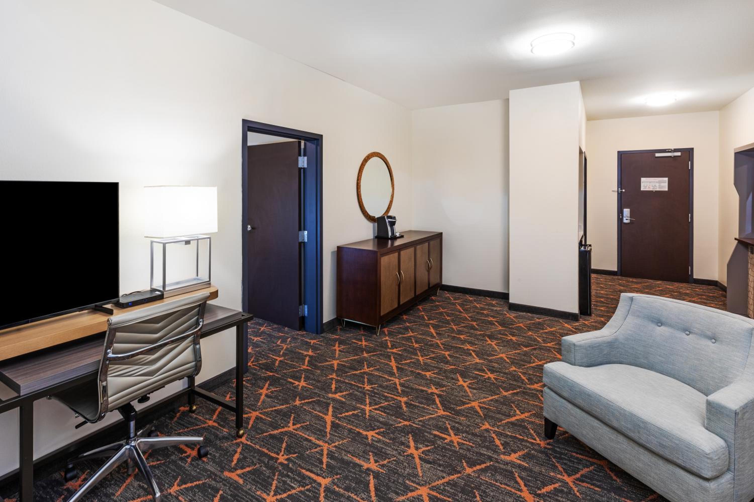 I was in a suite which included a front sitting area with a TV, bathroom and fridge/micro in the middle, and bedroom with another TV in the back. A design flaw is that the thermostat is in the front room while the HVAC unit is in the back. So adjusting the heat or A/C means a noisy blast of hot or cold air next to the bed instead of where you want it in the front area.