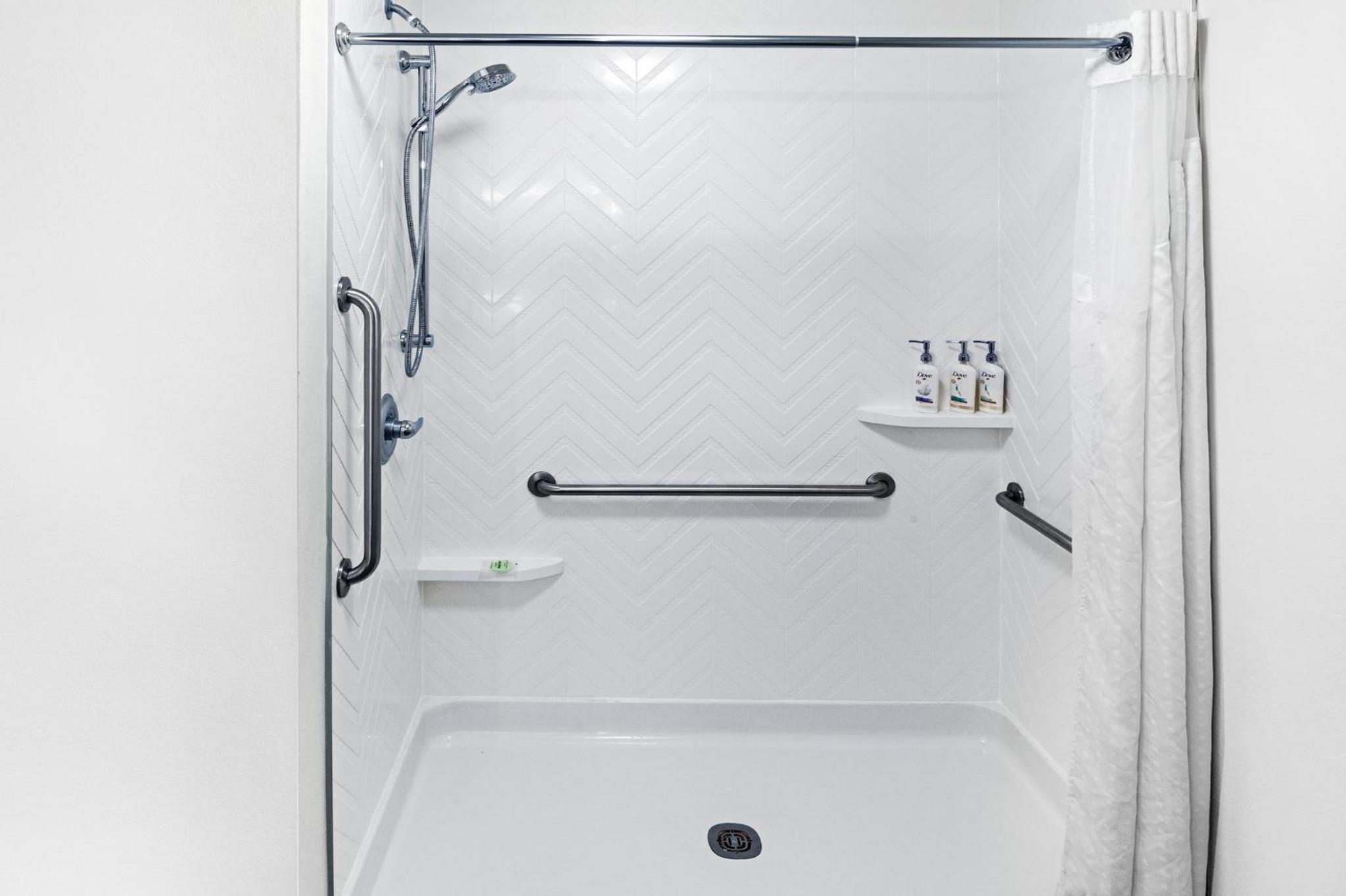 The bathroom was fine with a good shower head and water pressure. Towels were small and thin. Housekeeping was nonexistent my first 3 nights. On the 4th night the used towels were replaced. The Dove products in pump bottles are quite good but not as convenient as bar soap on the sink.