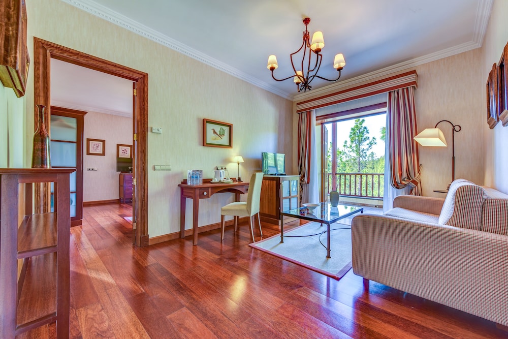 Great mountain retreat. A really excellent 4* hotel and spa outside the highest village of vilaflor in tenerife. With a few tweeks it could easily have been a 5* experience. Easy car parking on cul de sac road but no help with luggage, just one person on duty at all times. We had a terrace room with a hot tub which included a good-sized bedroom and a sitting room. The bathroom was big, twin basins, with a shower over a jacuzzi bath. With the amount of room, it would have been nice to have had a separate walk-in shower, and the taps on the bath didn't enable it to be used by two people. Surprisingly, the bathroom was not supplied with shampoo or conditioner nor any tablet soap. There wasn't anywhere to hang robes and towels near the hot tub or jacuzzi, and the shelves had not been dusted. The sitting area had a TV, a fridge with bottled water, nespresso coffee, and a kettle.