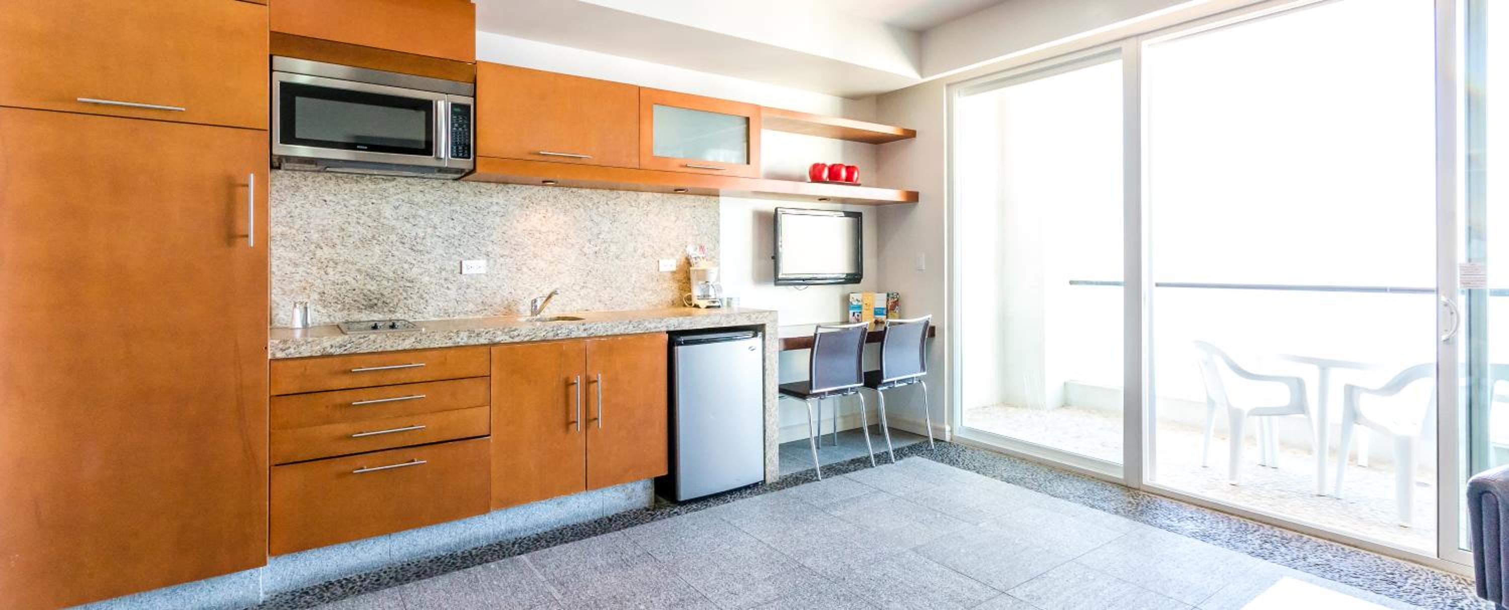 Great location on the beach. Beautiful views of the ocean. The room was terrible. A mini kitchen was available, however they only supplied 2 old butter knives and 1 tables spoon. They supplied no dish soap, paper towels, or dish towels. The accommodations were ancient. The bedding was old and dingy. The sheets were no longer white. They were yellow. Our room was right by the elevator where people congregated and were loud. The wind howled through the breezeway and shook the window all night. It was not a pleasant experience overall.