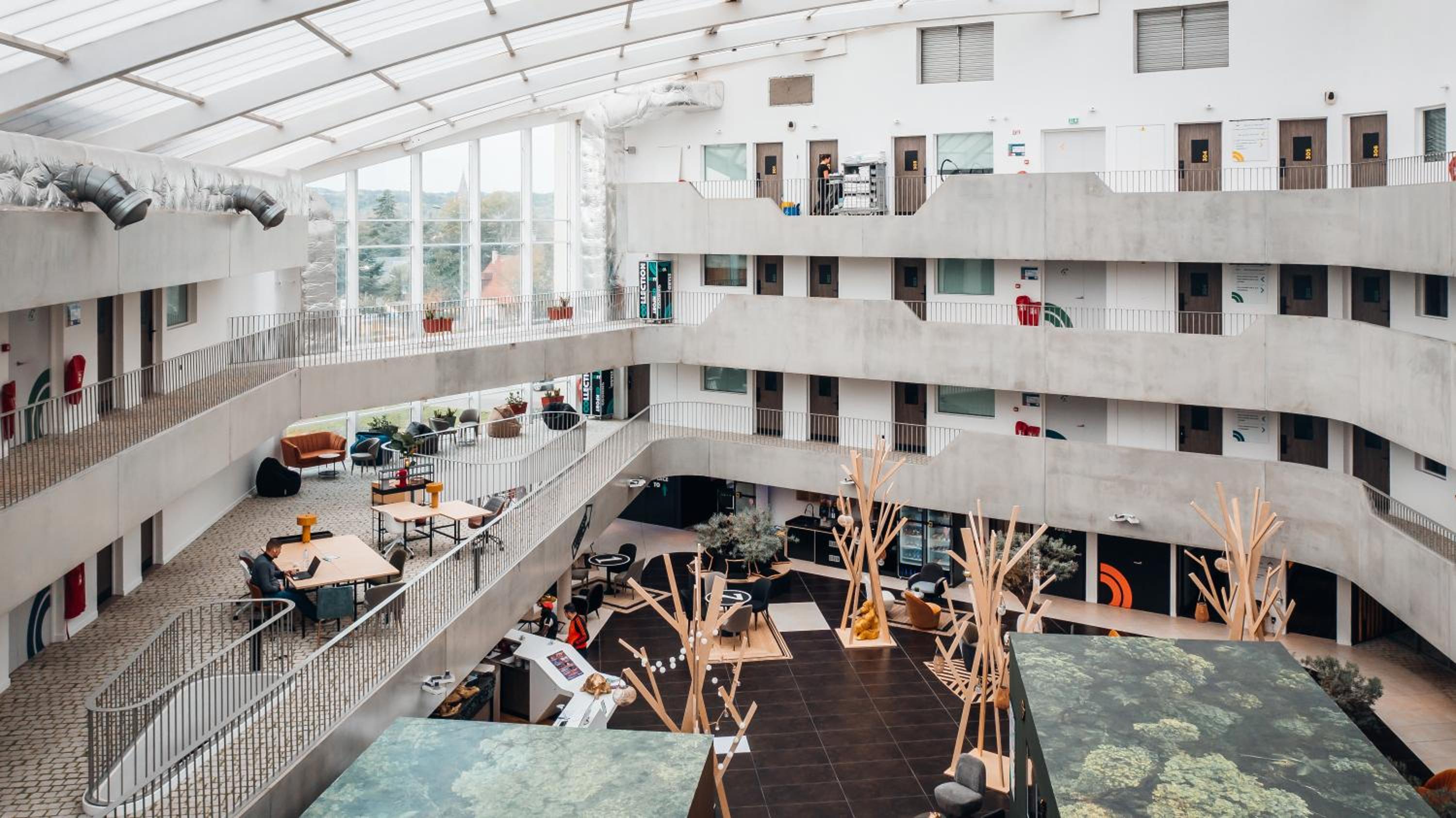 Discover COWOOL Cergy, a modern building offering unique studio and 1-bedroom apartments surrounding a stunning atrium filled with real olive trees. Enjoy the convenience of a fitness room on-site and the vibrant city of Paris just a stone's throw away.
