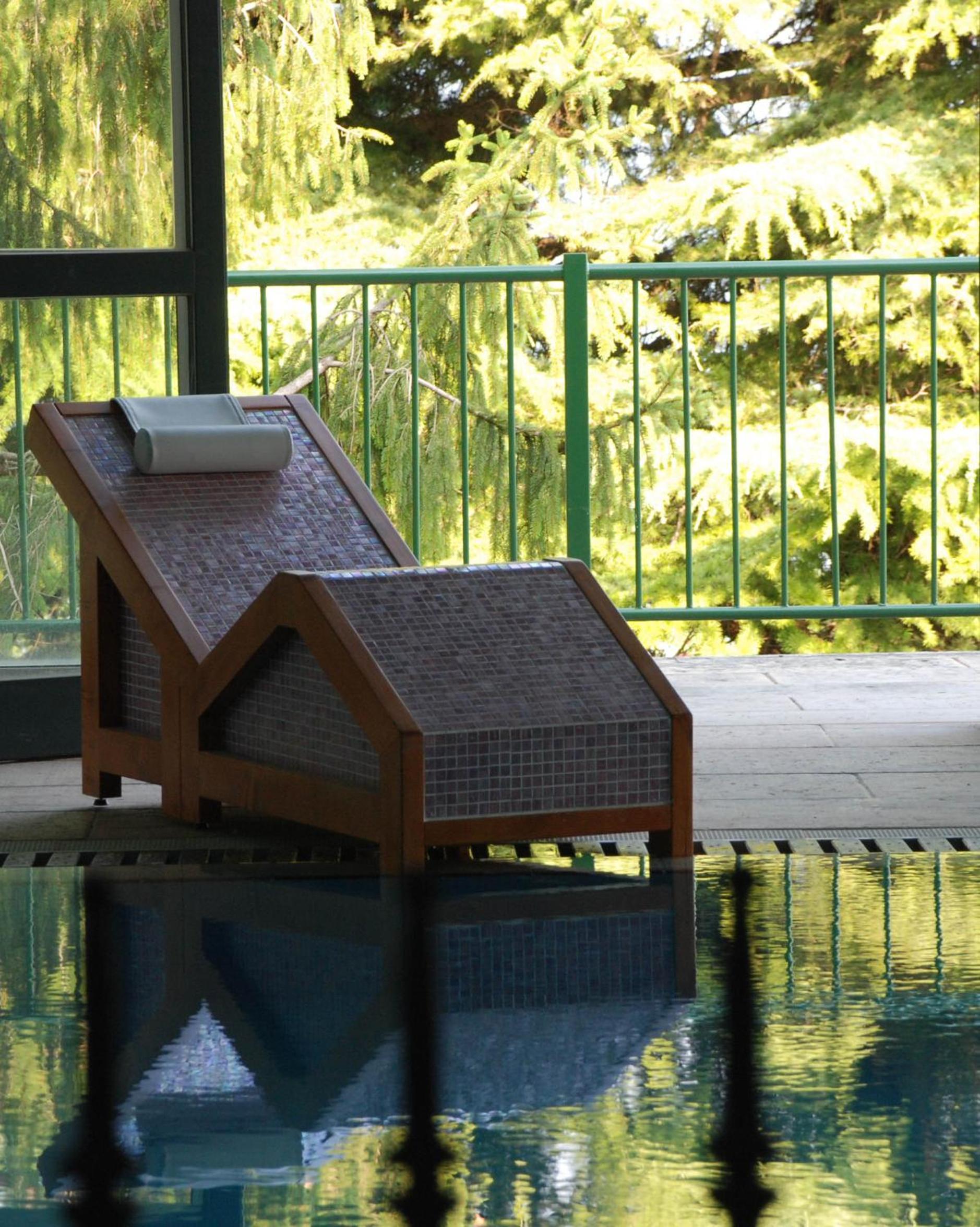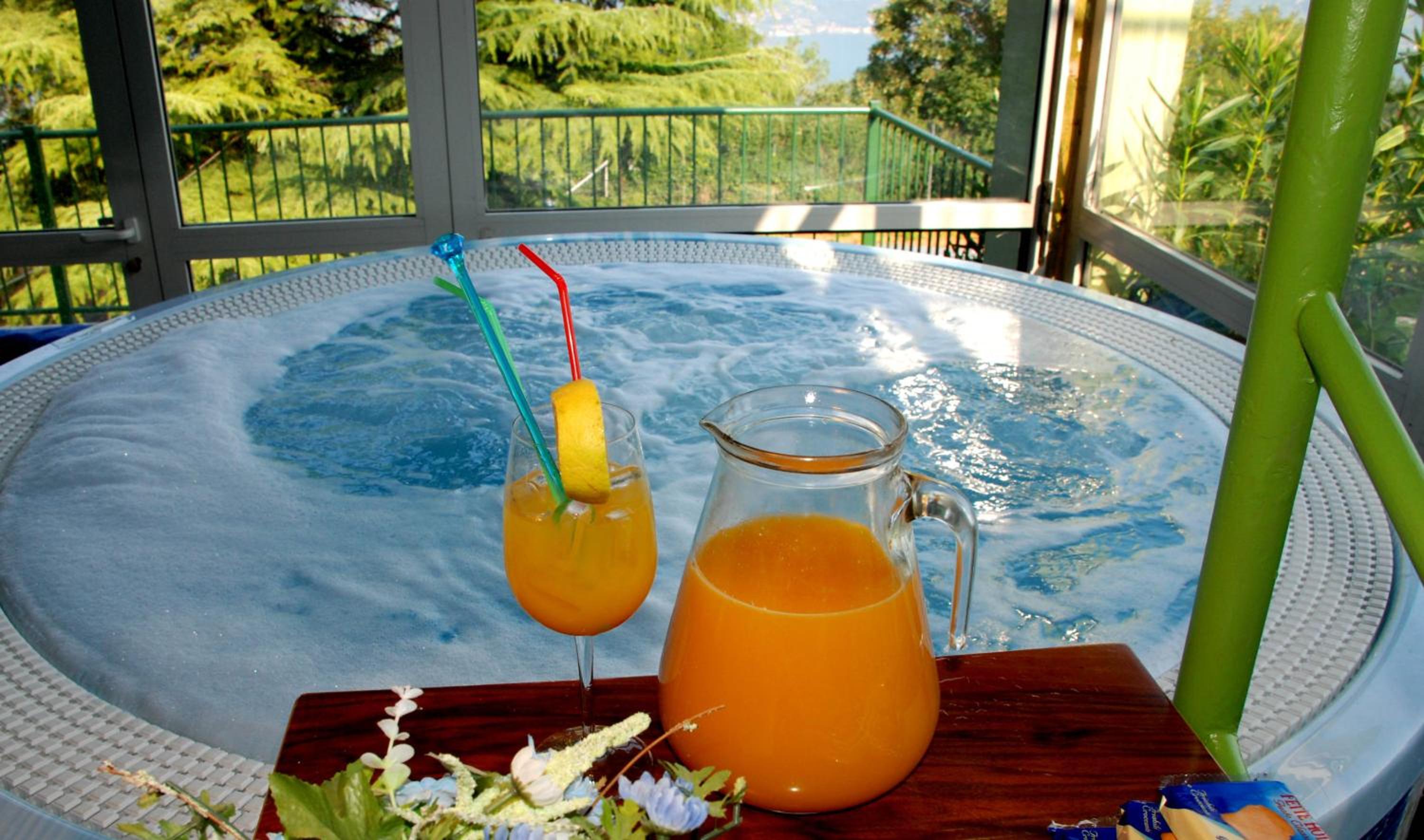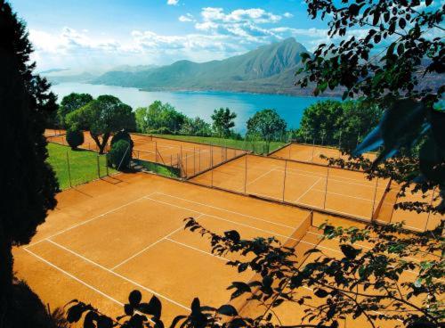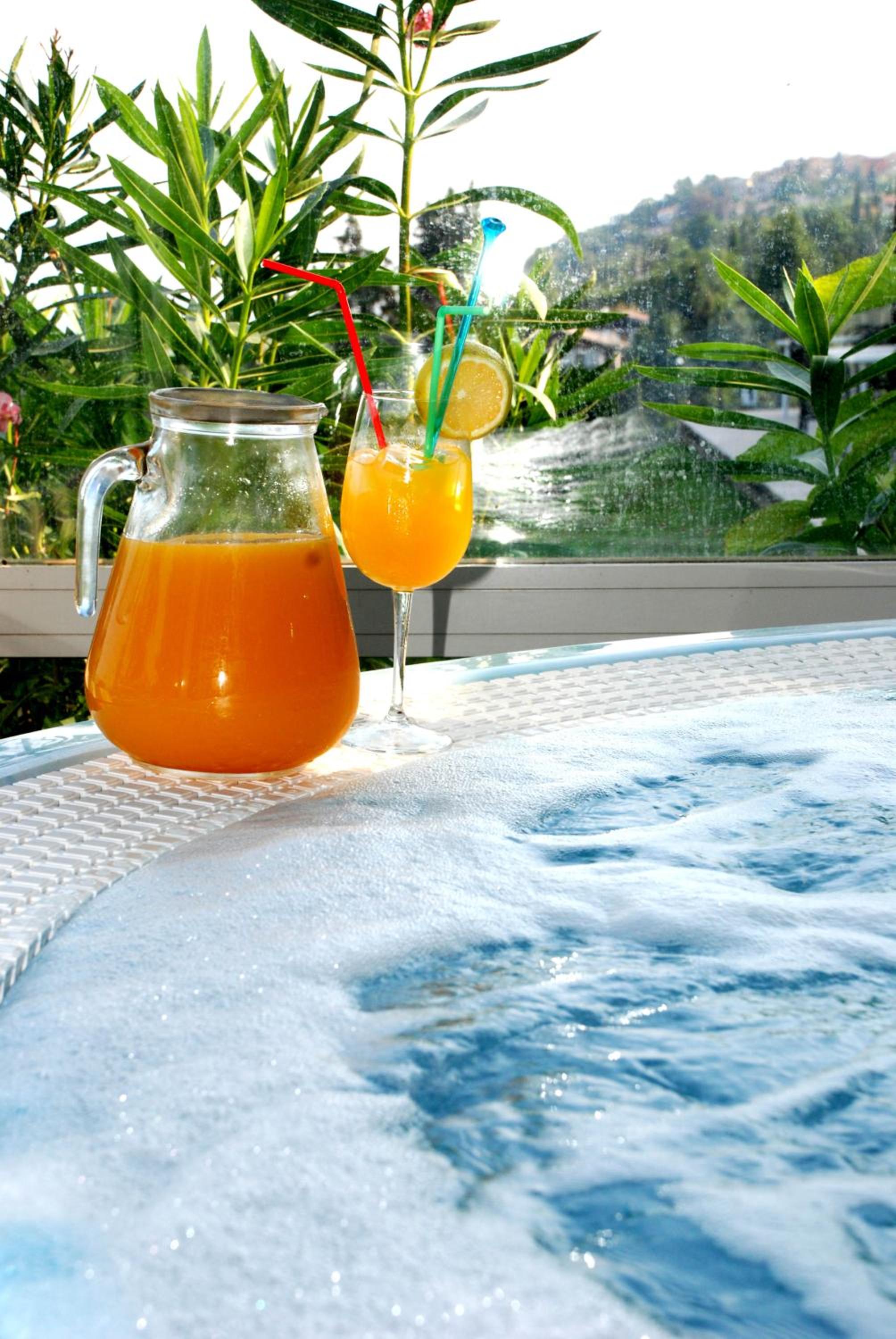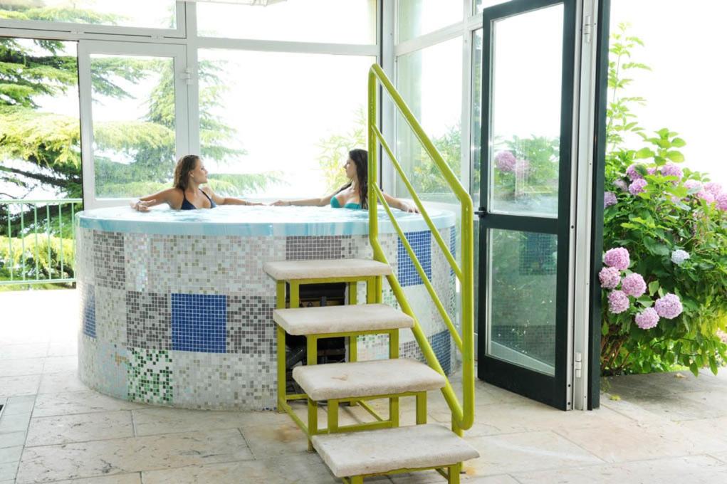 Oltre la piscina interna con spa , all' esterno c'è un bel giardino dotato di lettini dove si può prendere il sole o stare semplicemente all' ombra degli alberi, con una bella vista del lago