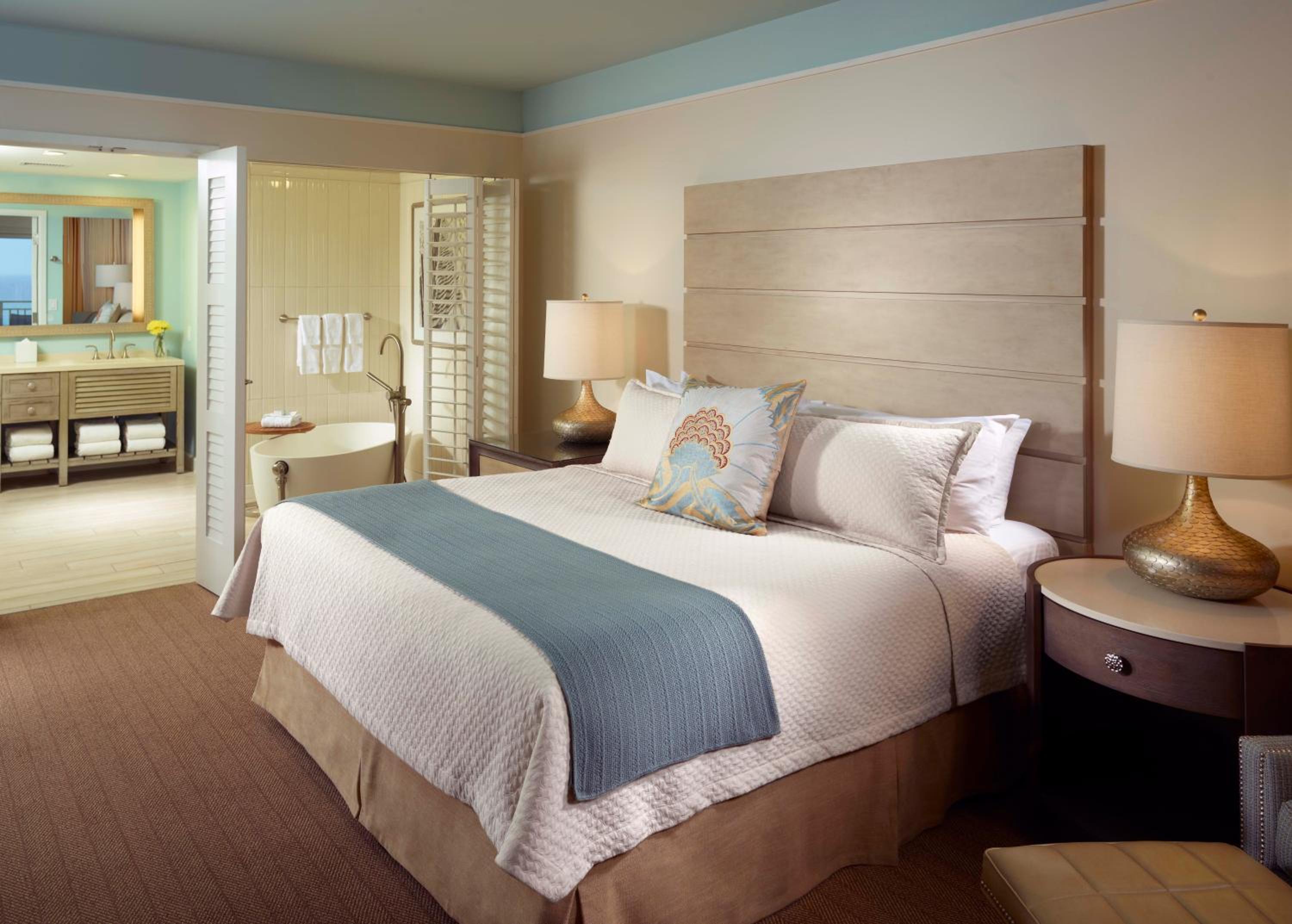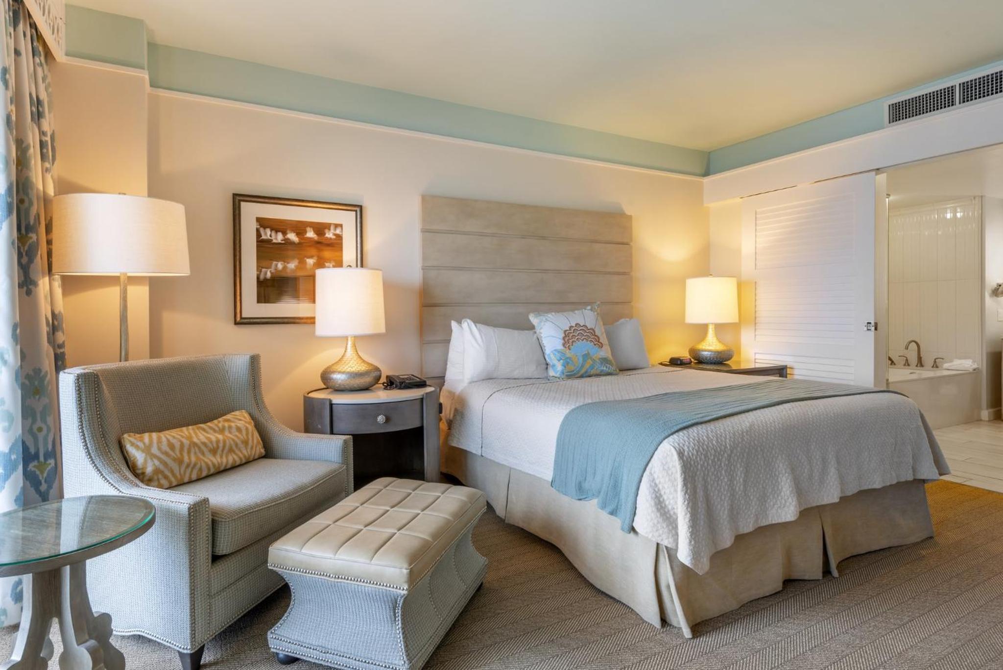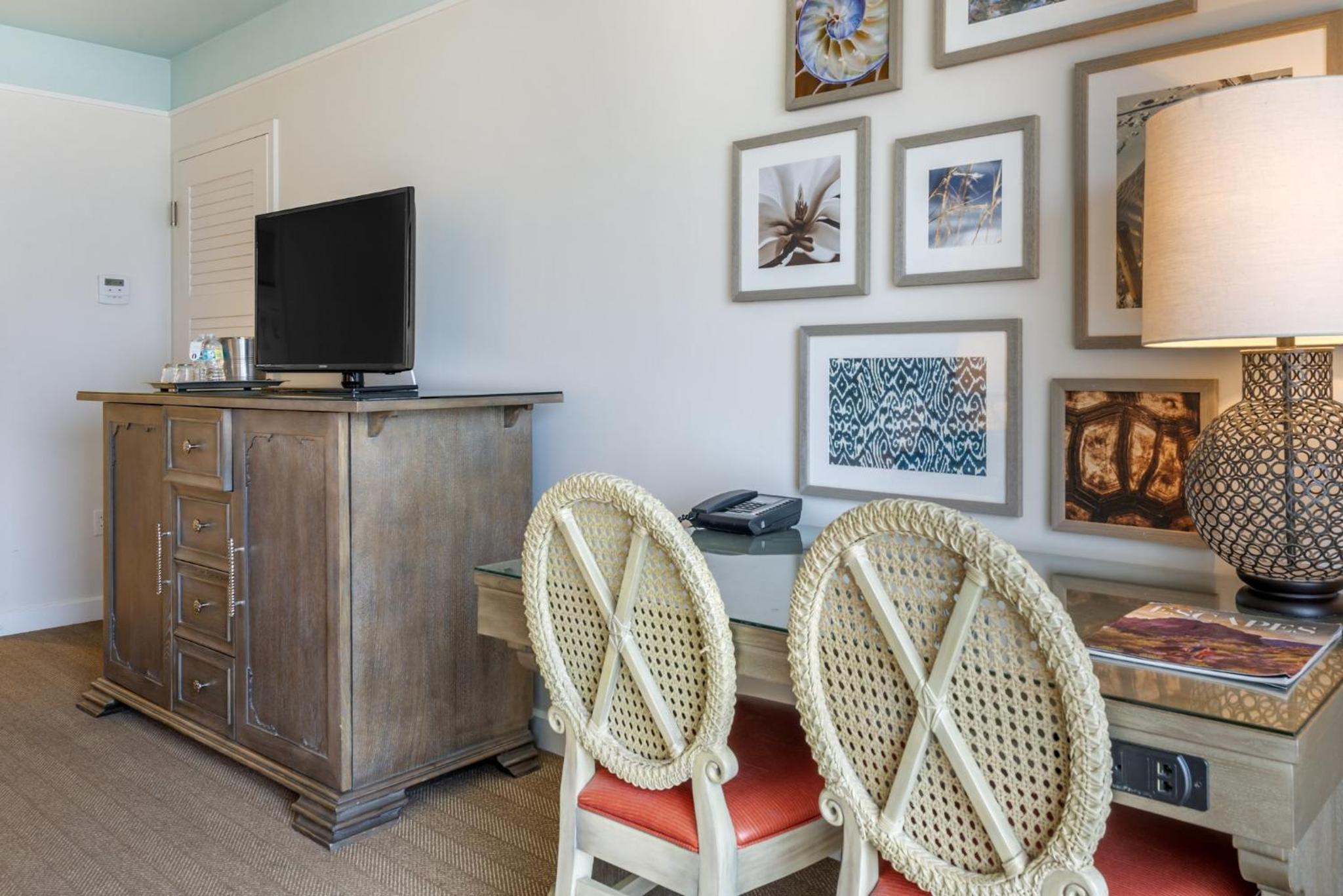 Each room at the resort is equipped with modern amenities including a flat-screen cable TV, work desk, and a private balcony or patio. Guests can enjoy the comfort of Egyptian cotton linens and upgraded features like spa baths and kitchens in select rooms.