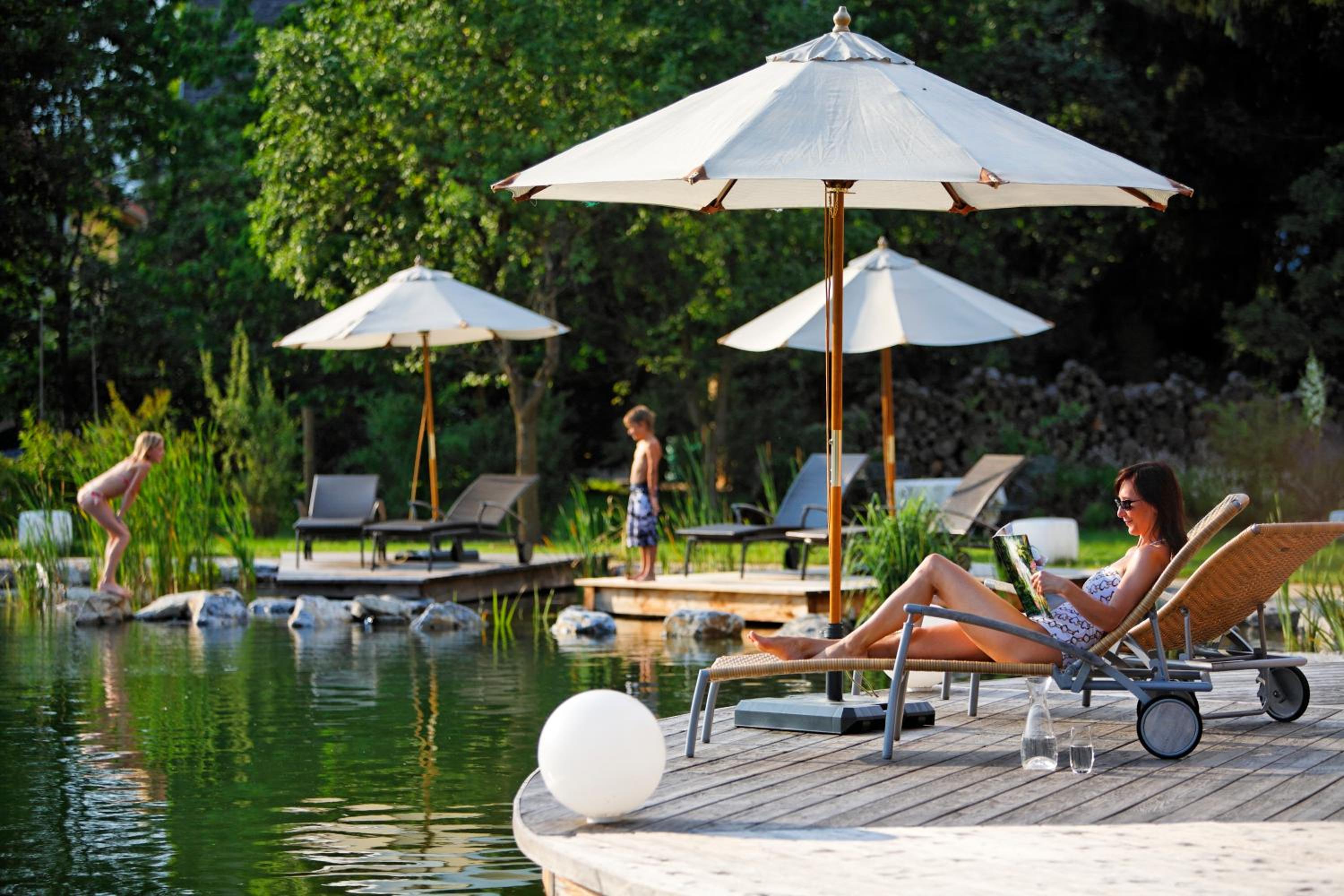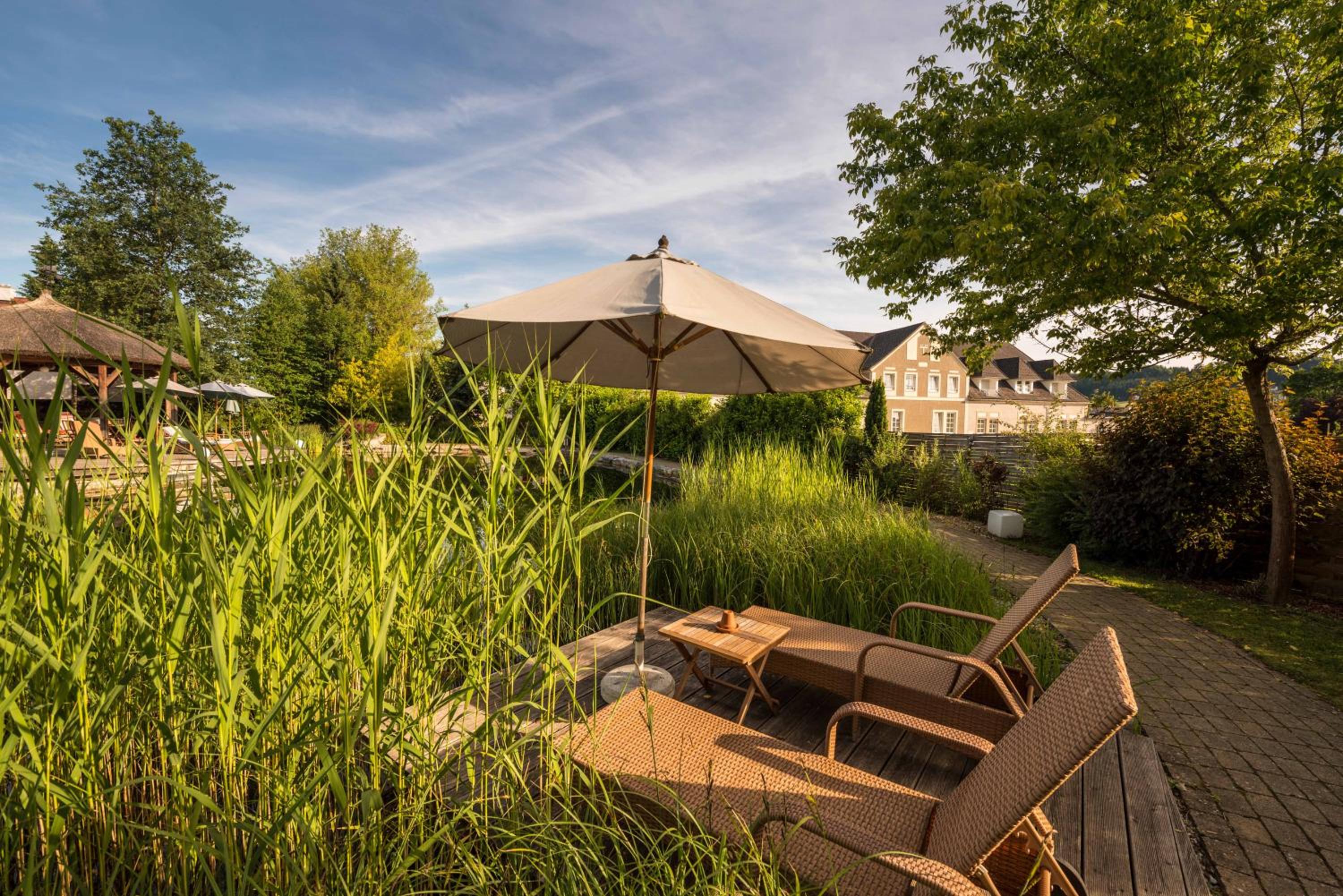 Unwind in the hotel's garden featuring a swimming pond, relaxation pavilion, Kneipp course, fitness room, and a relaxation room with waterbeds. Pamper yourself with a range of massage and beauty treatments available on-site.