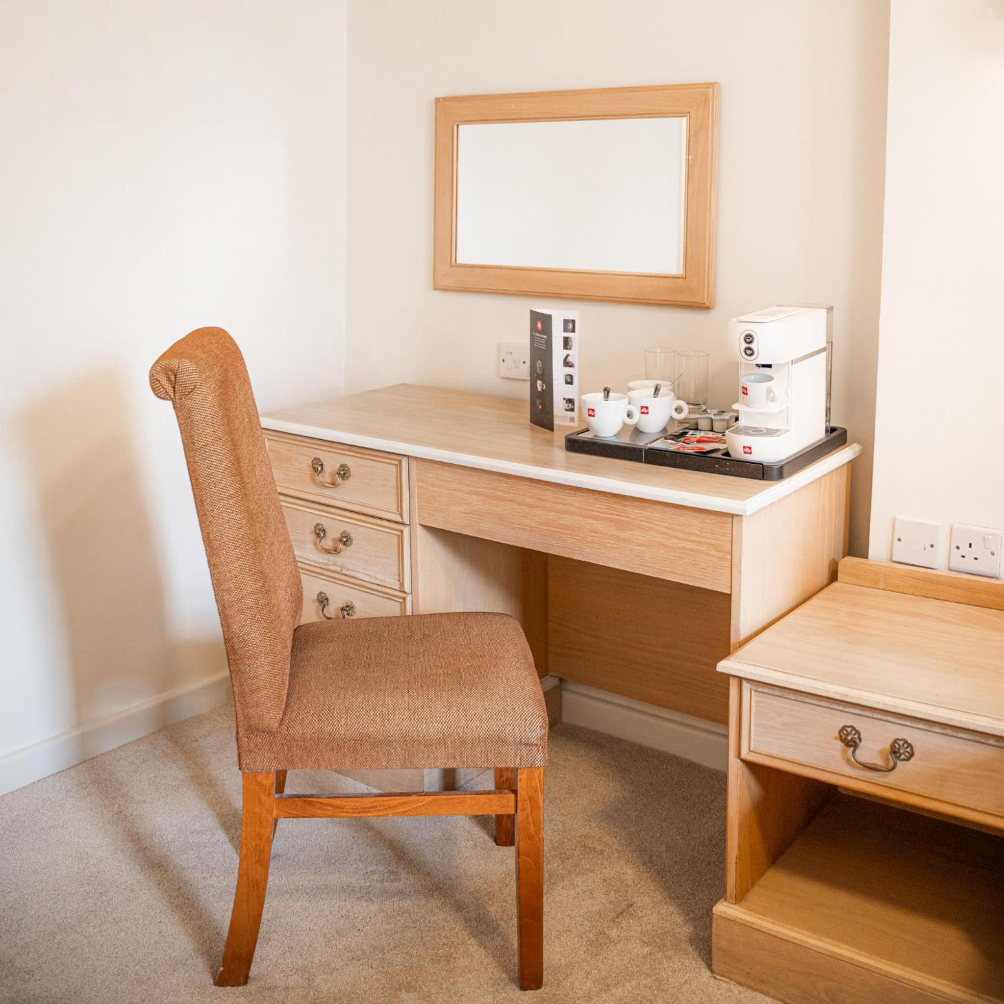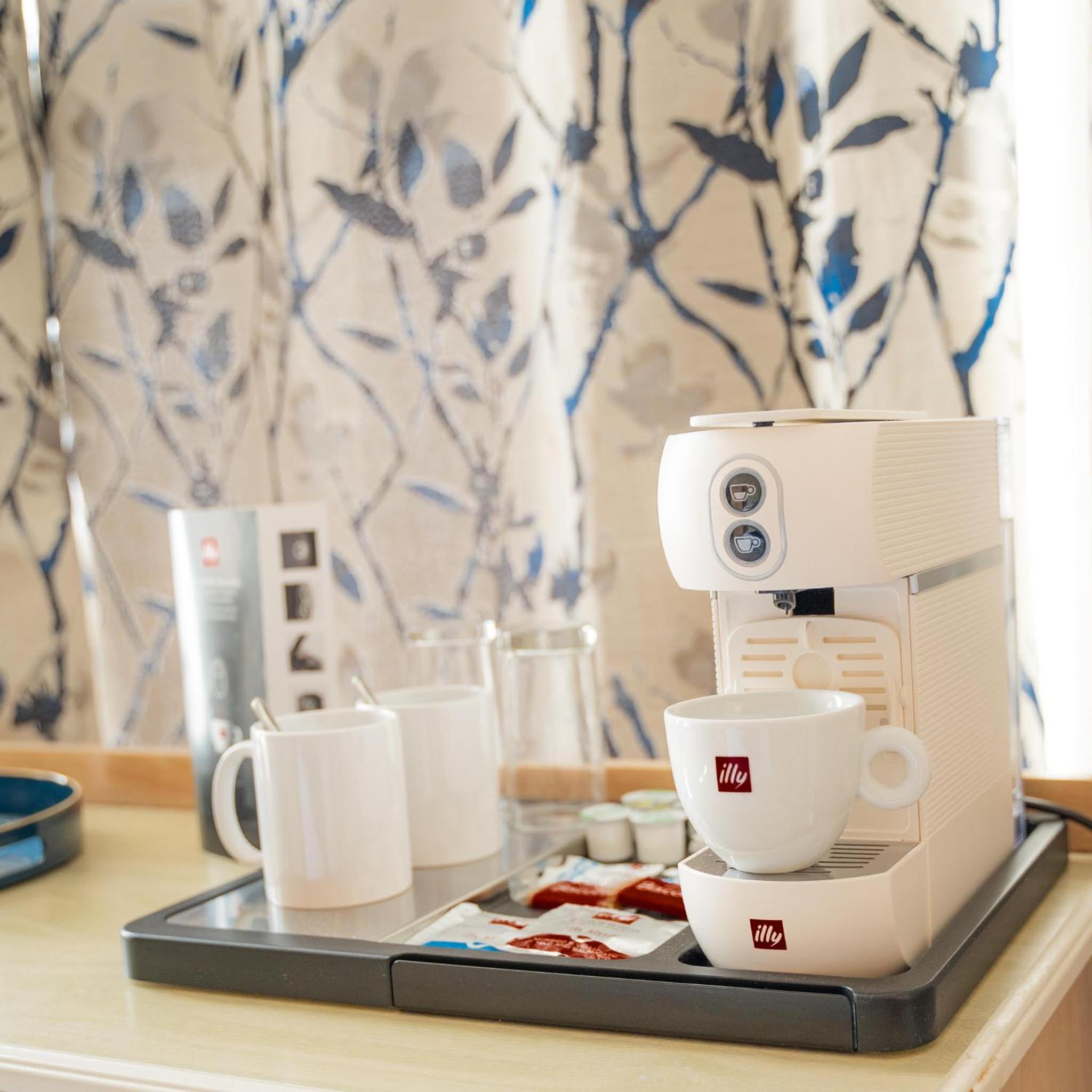Good location. Coffee machine in room.