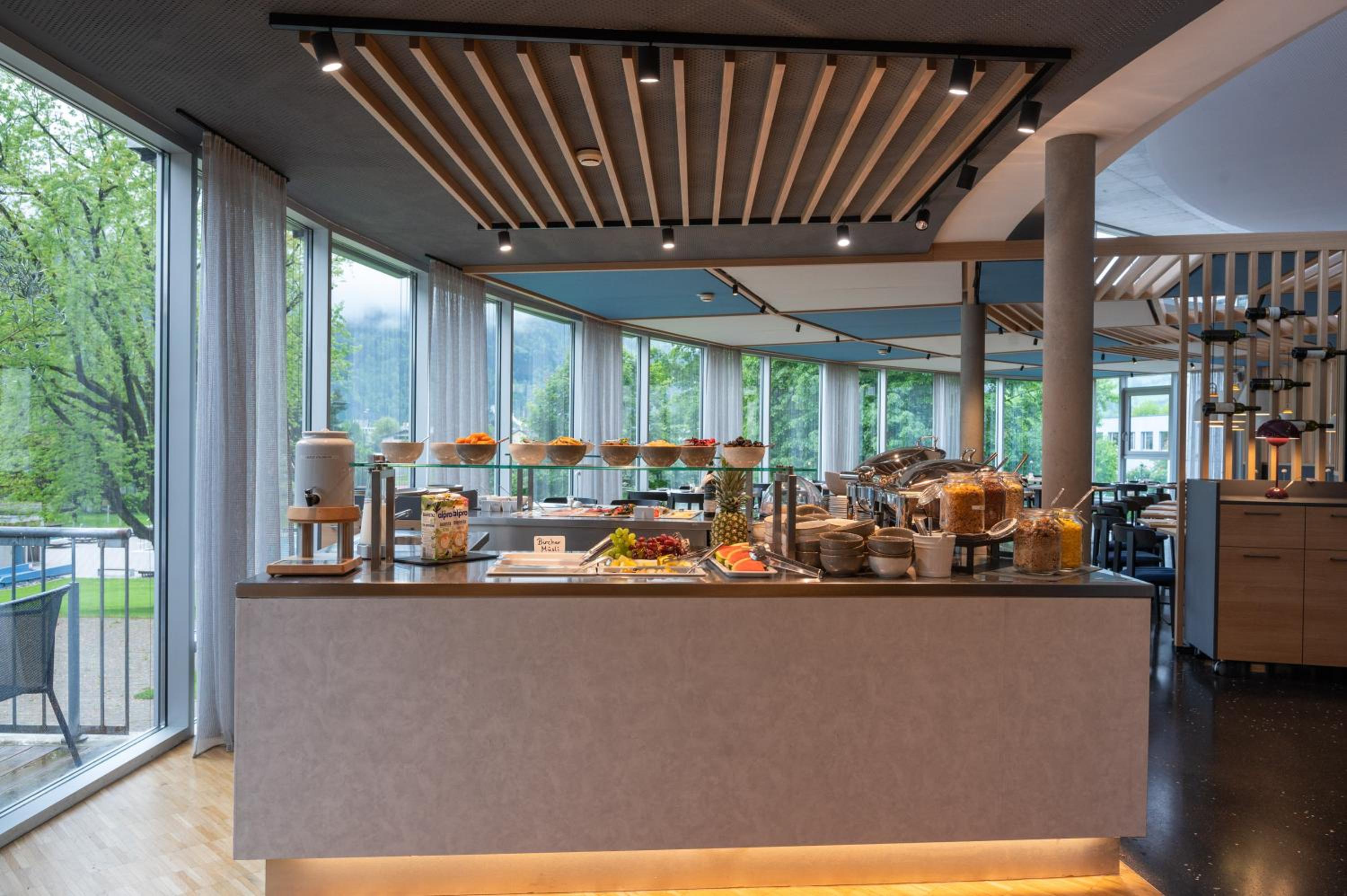 The hotel's minimalistic design, natural materials, and innovative architecture complement the stunning mountain views. The culinary offerings are diverse, with quick and uncomplicated options like salad variations, Val Blu specials, schnitzel, pasta, and snacks.