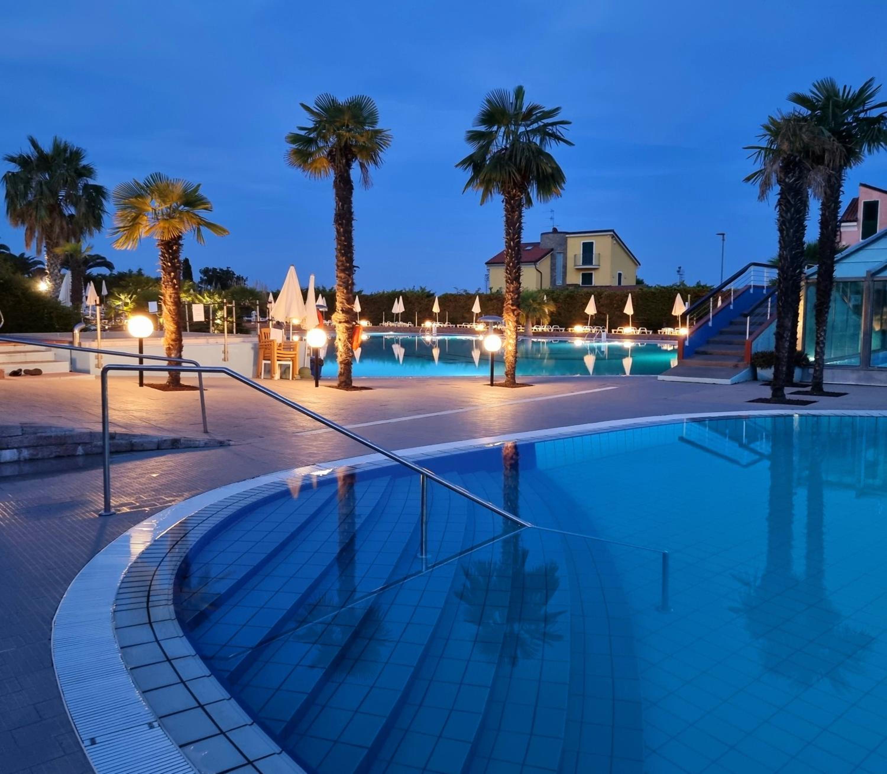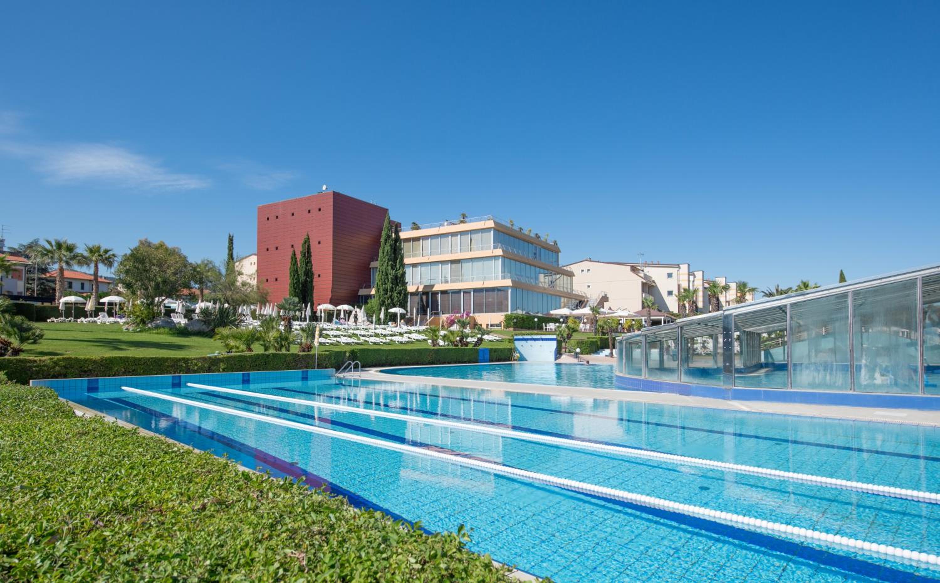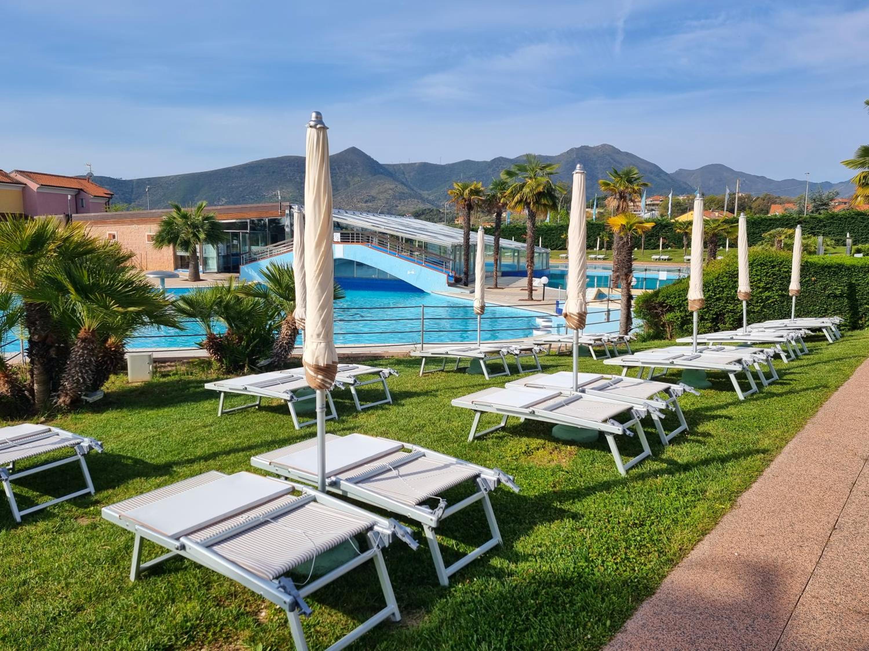 Il parcheggio, le piscine, il giardino ben tenuto.