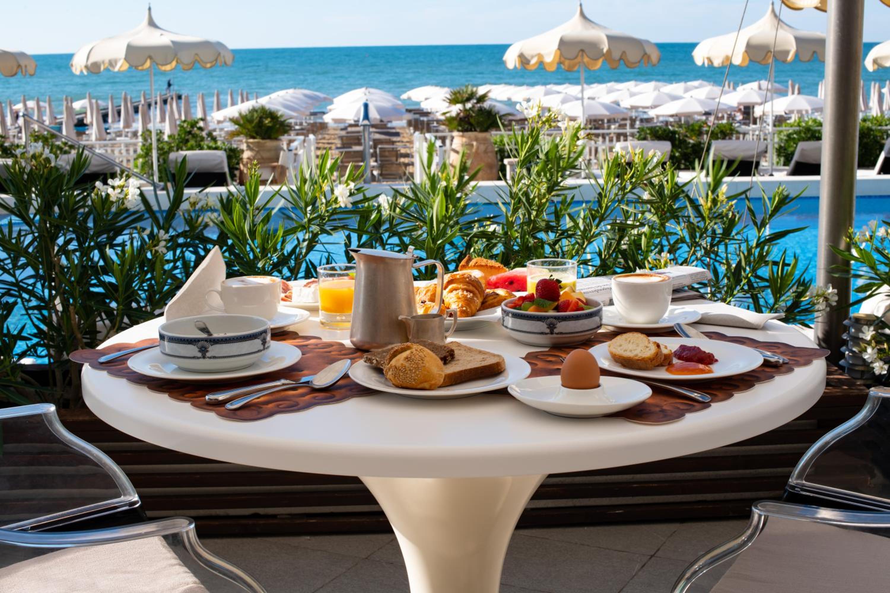 Indulge in our heated swimming pool and exclusive beach services with private sun beds and umbrellas for a relaxing day by the sea.