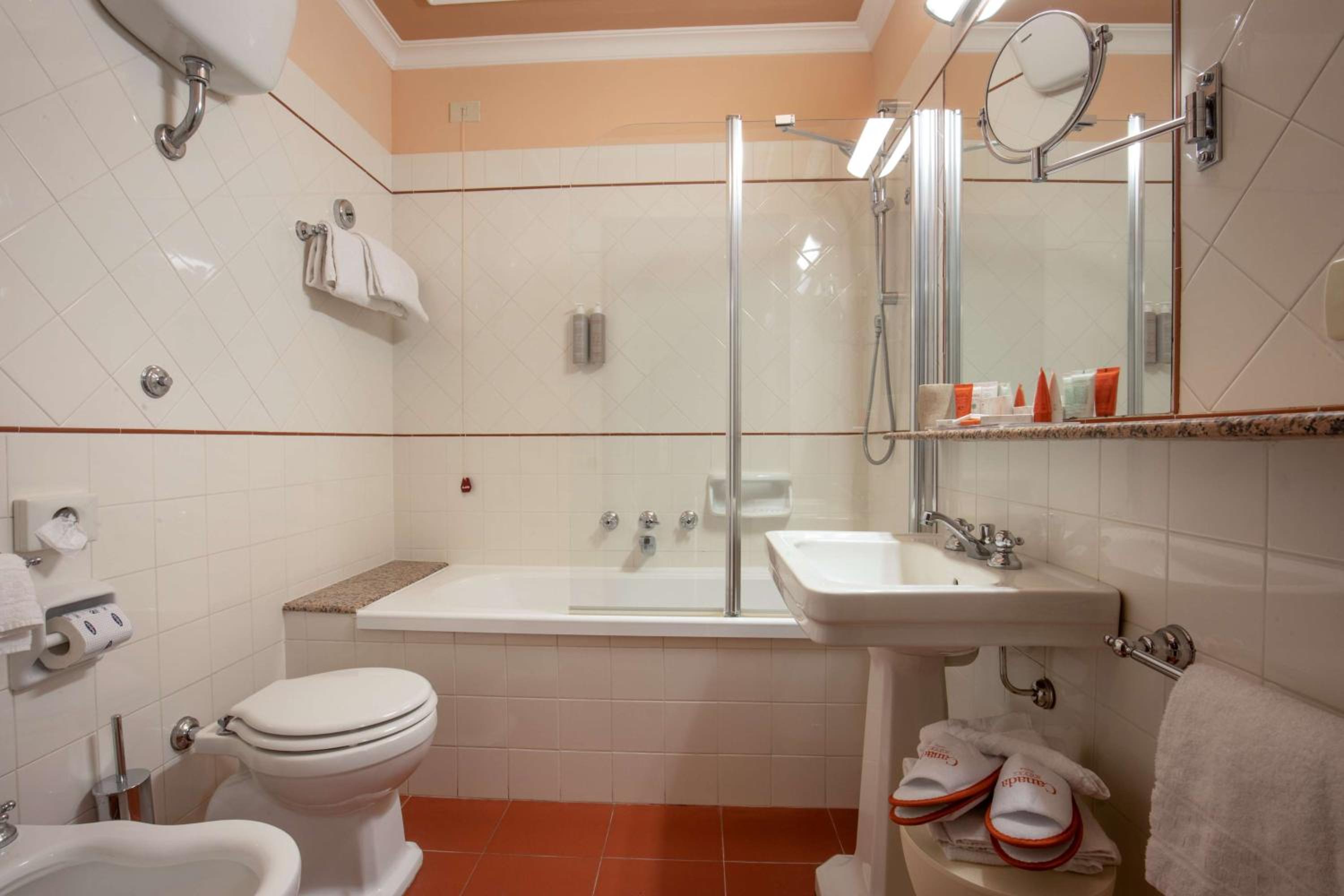 Canada is not a big fancy hotel. There's a small bar, breakfast room, and comfortable lounge area. There is no restaurant for evening meals, but there are plenty of decent places (Bramble is good) just minutes walk away. Guest bedrooms have high ceilings, are comfortable, old fashioned in a nice way, and absolutely adequate. There is good TV with some English channels. Good WiFi. Kettle with tea/coffee, and USB charging points. Although some areas around Termini station have a reputation for being a bit dodgy, we were never uncomfortable and the hotel area is safe.