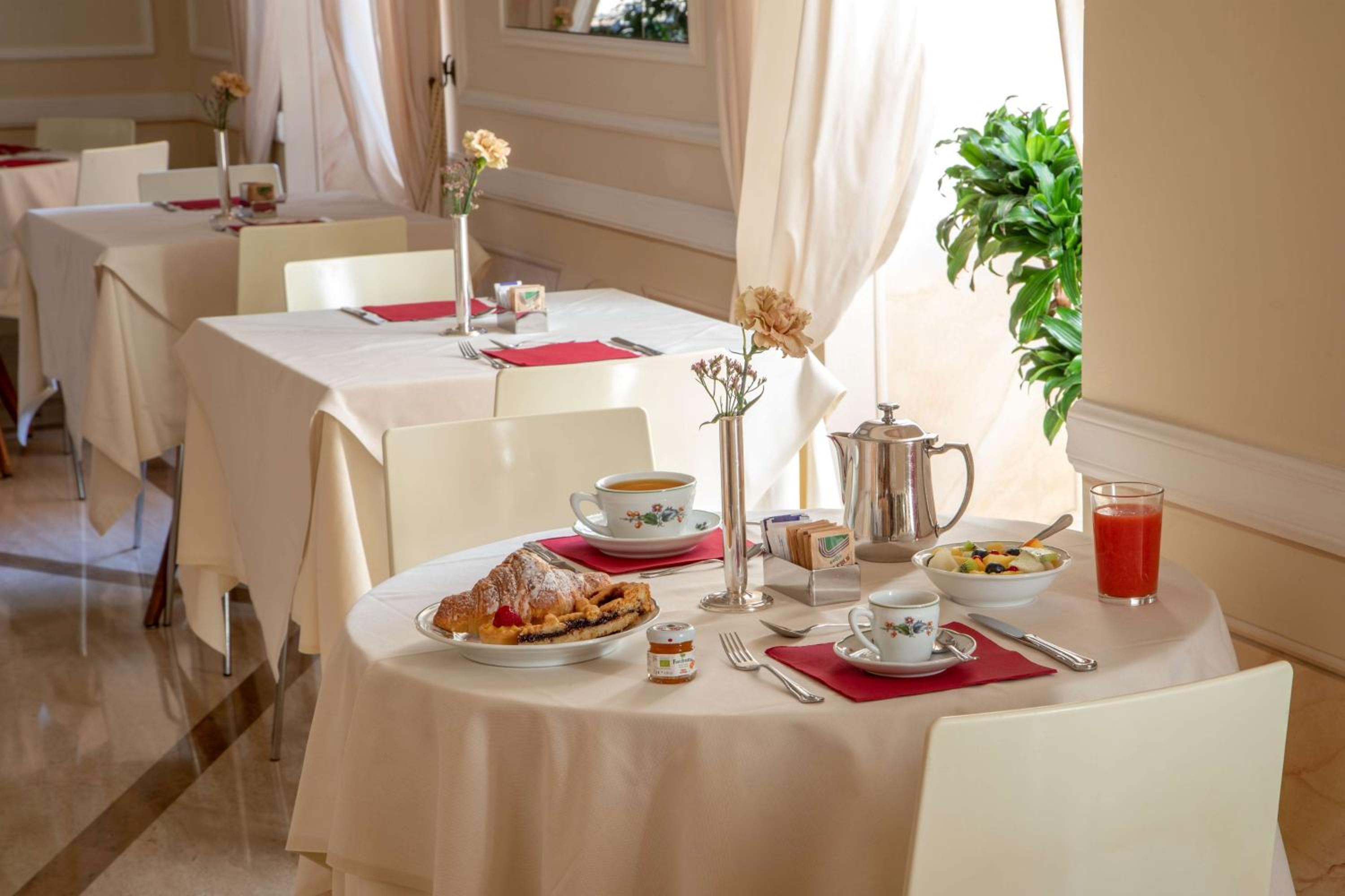 Breakfast consisted of a wide choice of continental food. We enjoyed a few drinks at the small bar which at times was busy but staff coped well. Drinks were reasonably priced which was a pleasant surprise compared to other hotels we have used in Rome.