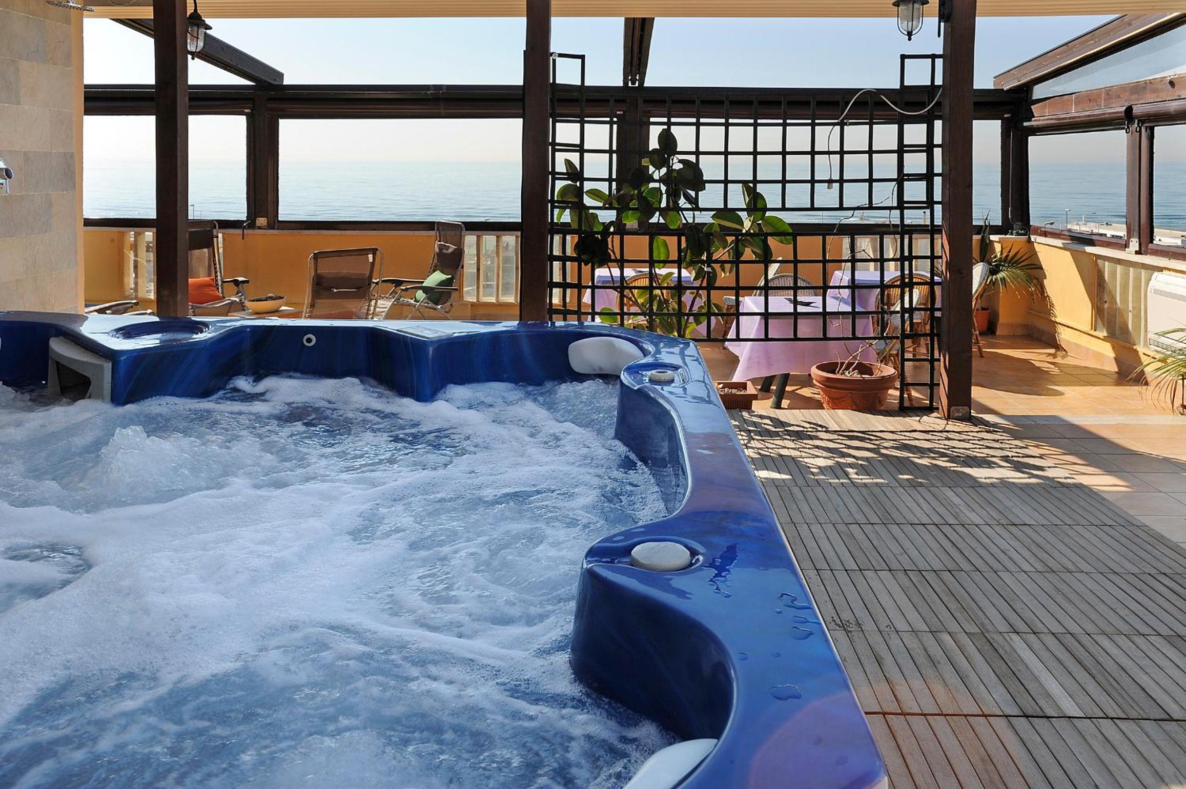 Indulge in the terrace's sun loungers and hydromassage tub, and savor breakfast at the adjacent Hotel Bellavista. The garden café offers a delightful array of snacks, cocktails, and light meals for your enjoyment.