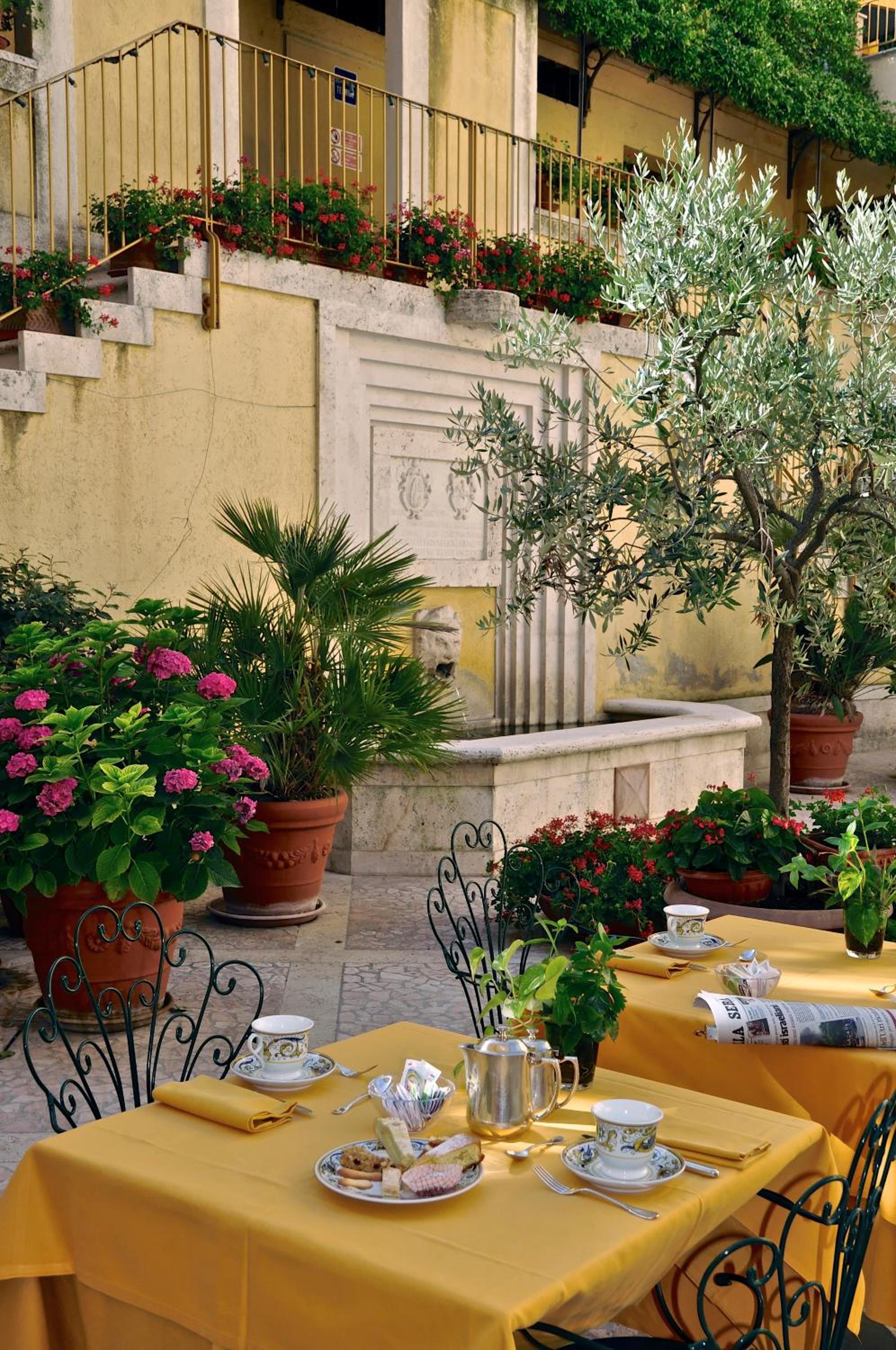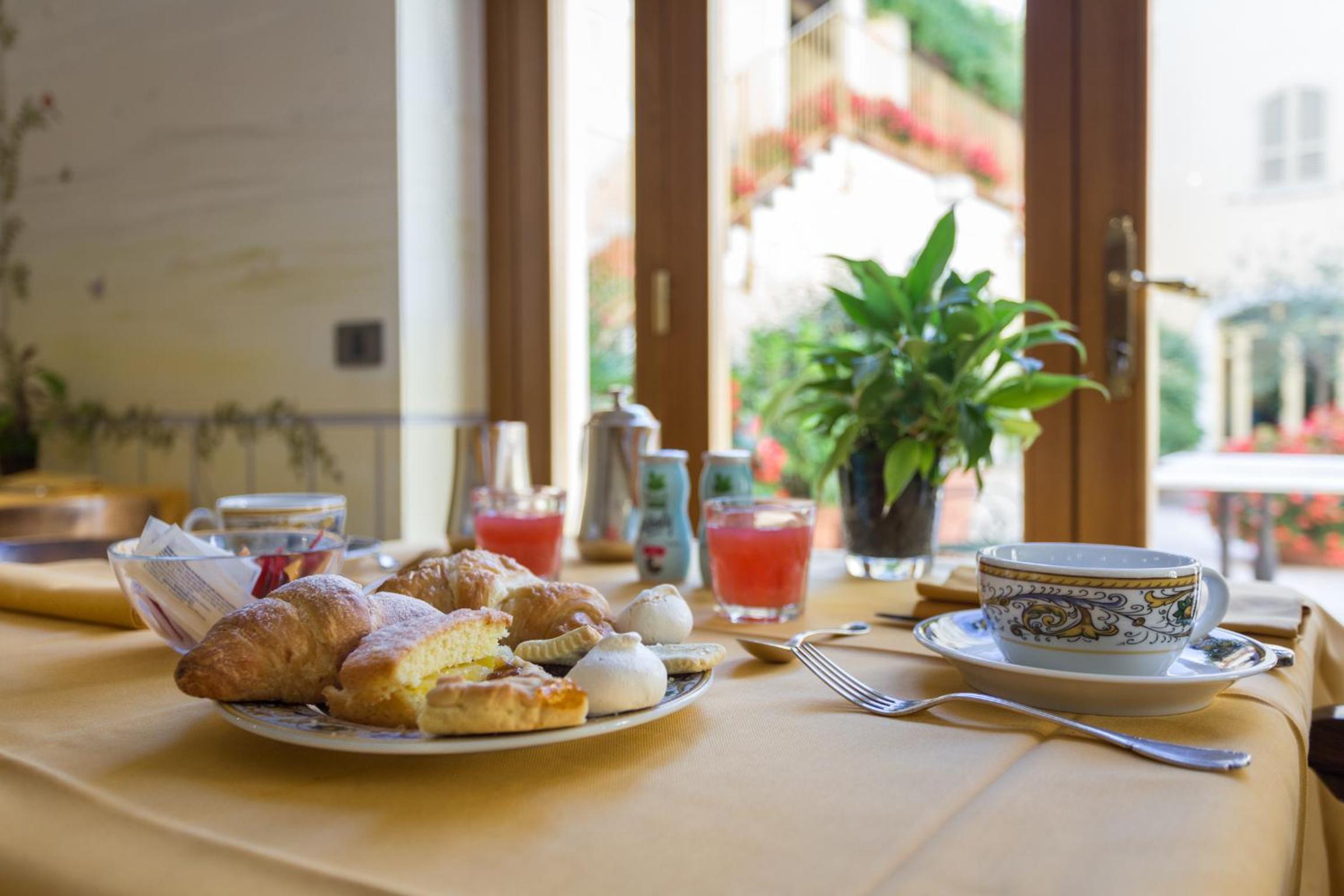 Buffet Breakfast in a Floral Courtyard: Start your day with a delicious buffet featuring homemade cakes, served in a picturesque courtyard during the summer months.