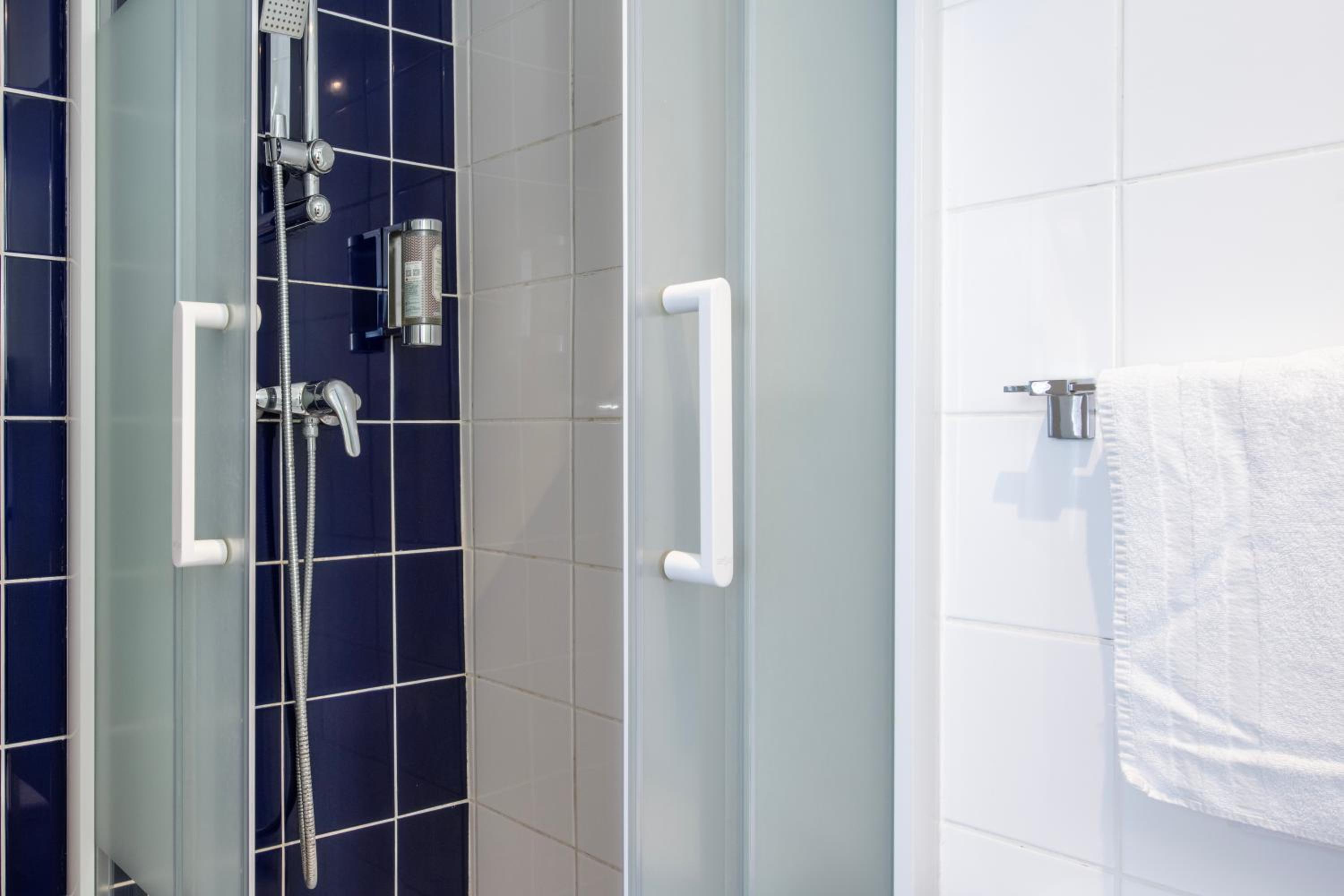 Dusch och toalett var lite trång för oss större svenskar. Svårt att ställa in lagom temperatur i duschen. Wifi:et svajade och inga utländska kanaler på TV:n. Lite trist med gamla slitna och smutsiga mattor i korridorerna.