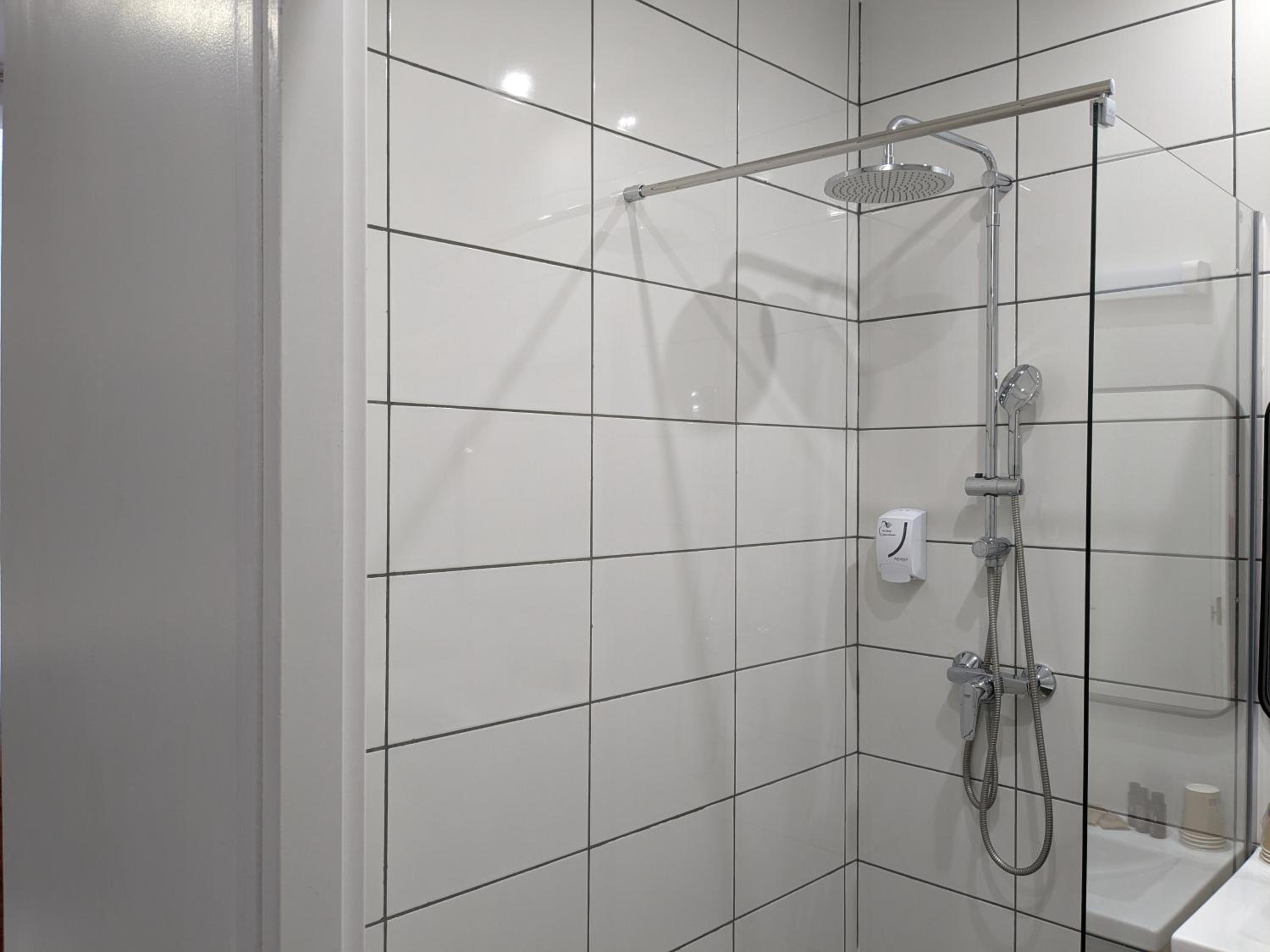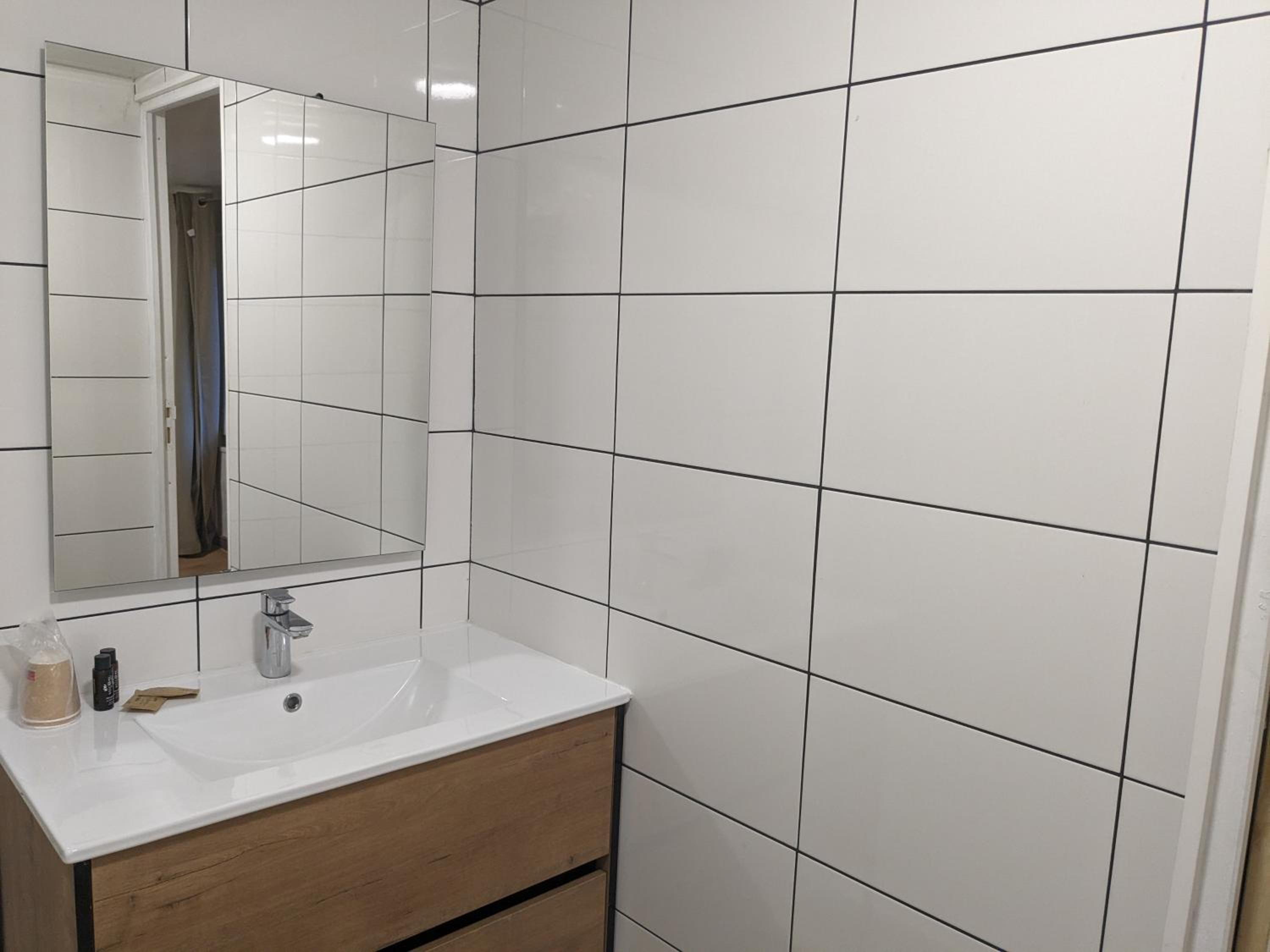 La salle de douche n’a pas de séparation entre douche et le reste (pas de bac de douche) donc on inonde vite le sol
