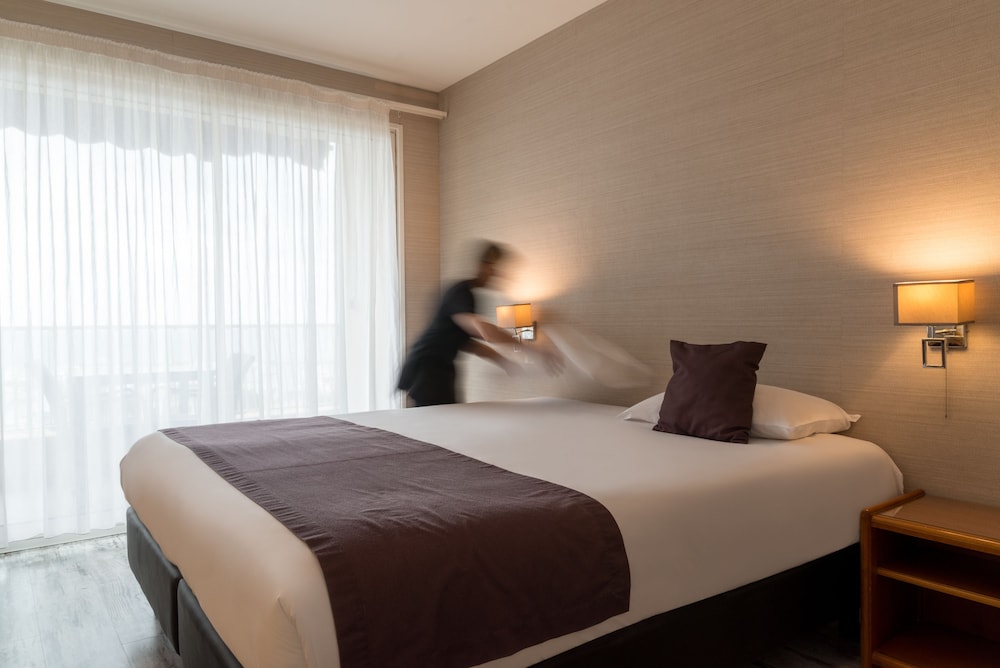 The middle aged ladies at the front desks were not welcoming at all to non French speakers. I had booked a 2 twin sized bed room, but when we arrived we got a queen sized bed and was told that the hotel is fully booked. Those ladies told us to use the sofa bed, if we wanted separate beds that badly. The men who were working there during the night were very nice on the other hand. The room was big and spacious which we enjoyed but the AC does not work.