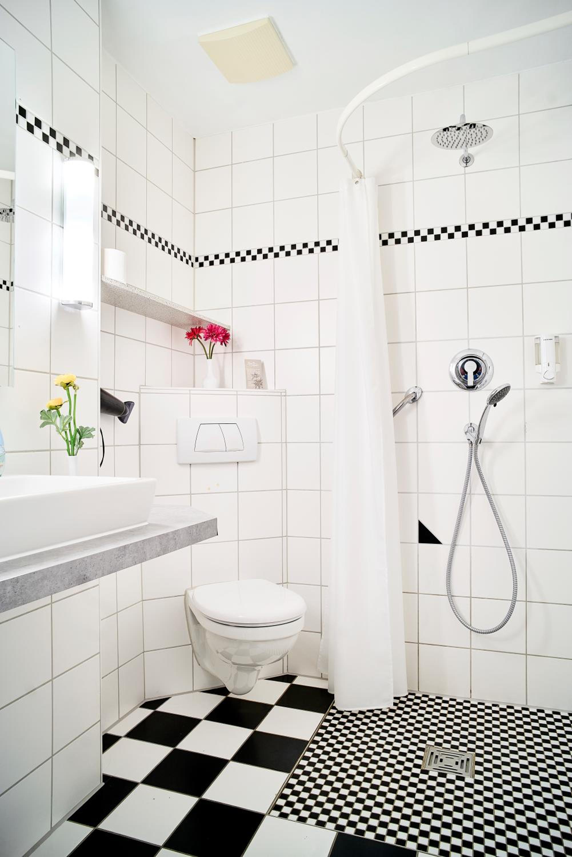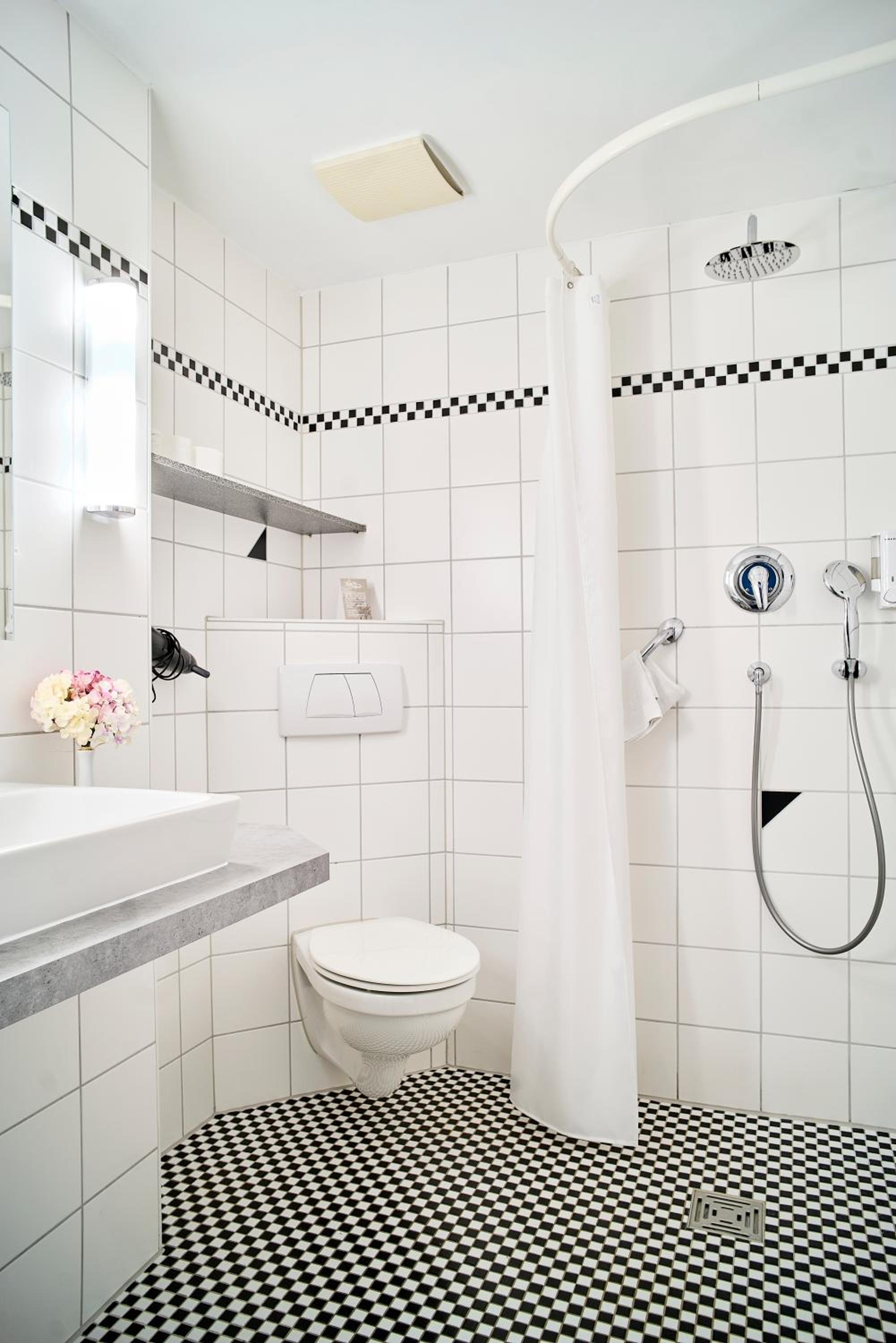 Bad: Dusche mit Vorhang im Eck beim WC - man konnte nach dem Duschen das WC nicht trockenen Fusses nutzen