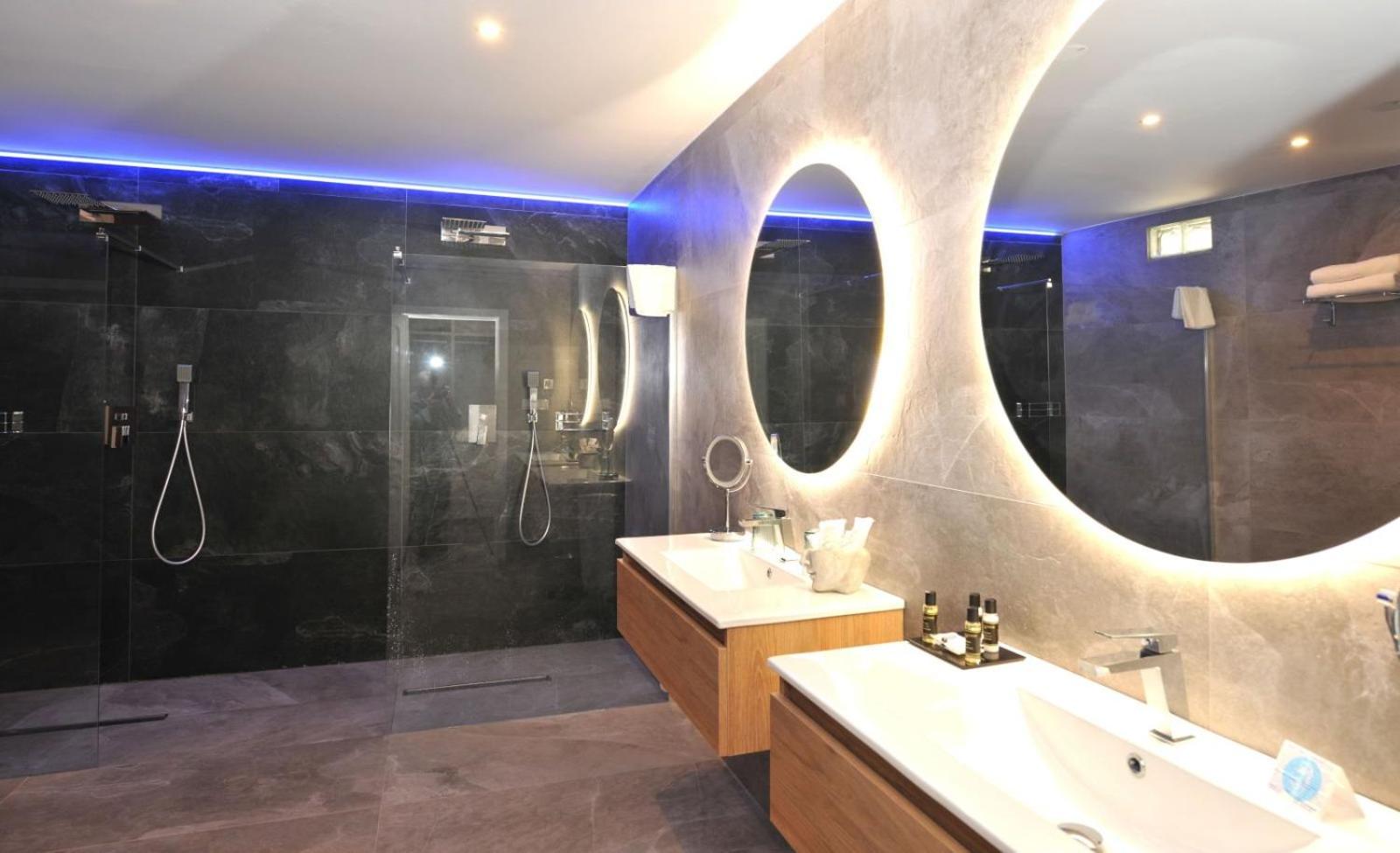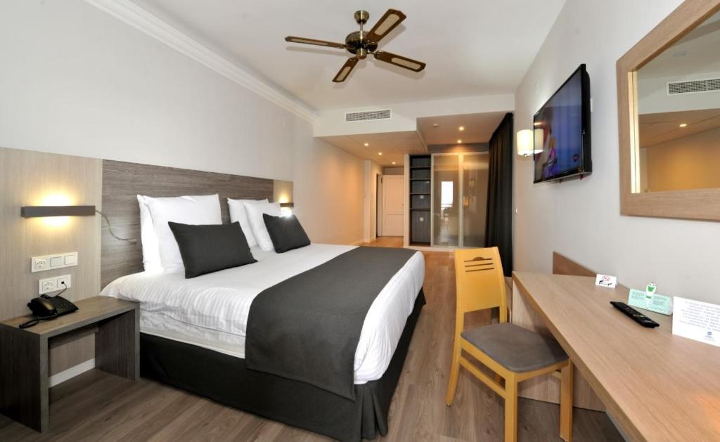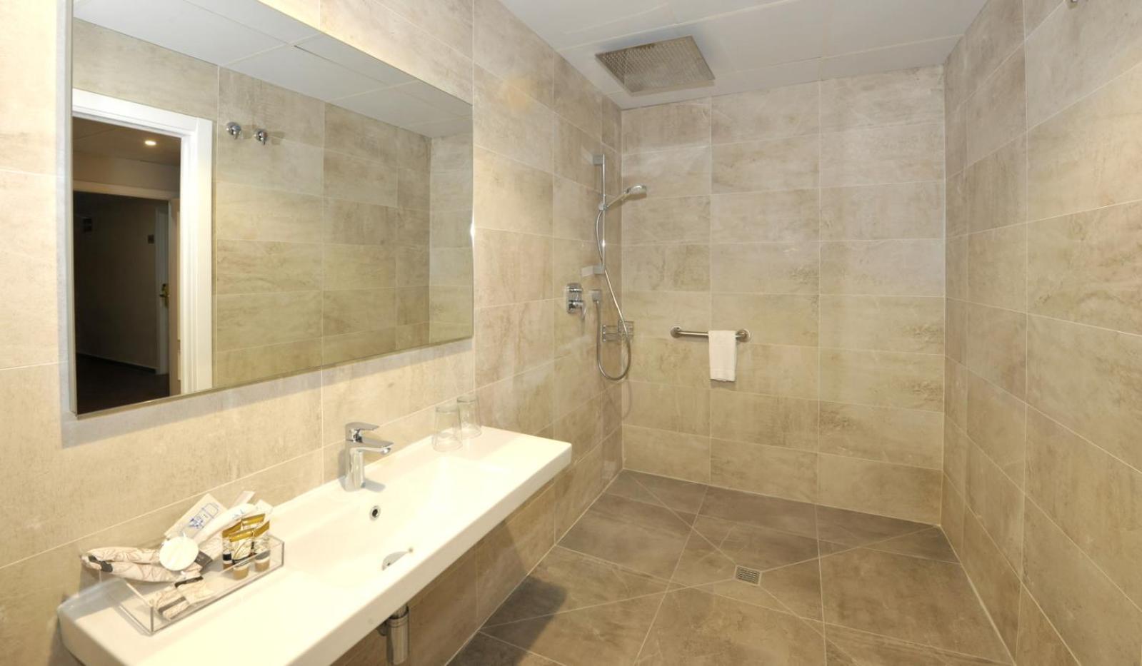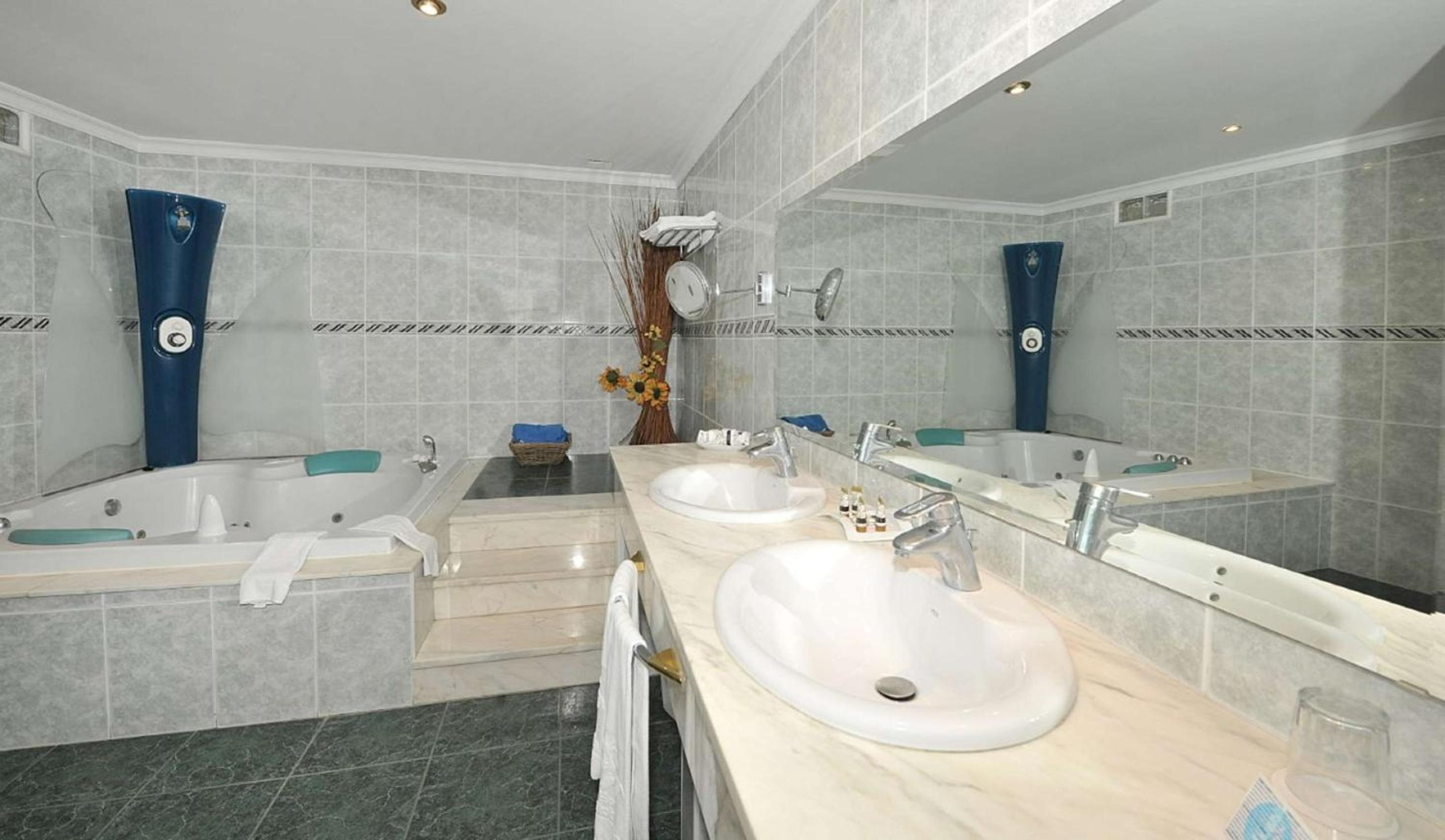 We kregen een upgrade naar een grotere kamer met zicht op zee met een leuk balkon met een tafel en 2 stoeltjes. De kamer was ruim, zag er luxe uit en ook de badkamer was prettig. Het is een enorm complex, met een groot zwembad, grote ruimtes met ergens een gigagroot beelscherm met banken eromheen en het straalde allemaal luxe uit. We waren er buiten het seizoen en het was redelijk rustig, maar ik kan me voorstellen dat het in de zomer superdruk is. Het was fijn dat we gratis op het terrein konden parkeren