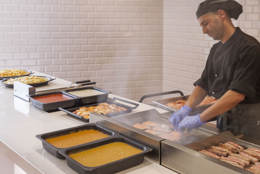 Food, savoury, plenty of choice , but some of the meat a bit over cooked on the grill. Unfortunately the hot food was barely warm from the sever , I found myself using a microwave to warm it up. Sweet and pudding iffy , with very sweet creamy items ! Plenty of fresh fruit. Drinks served at our table with bottled water , and water and coffee machines. The restaurant did get very very busy at times as it filled up towards the weekend. Patience was required 😂