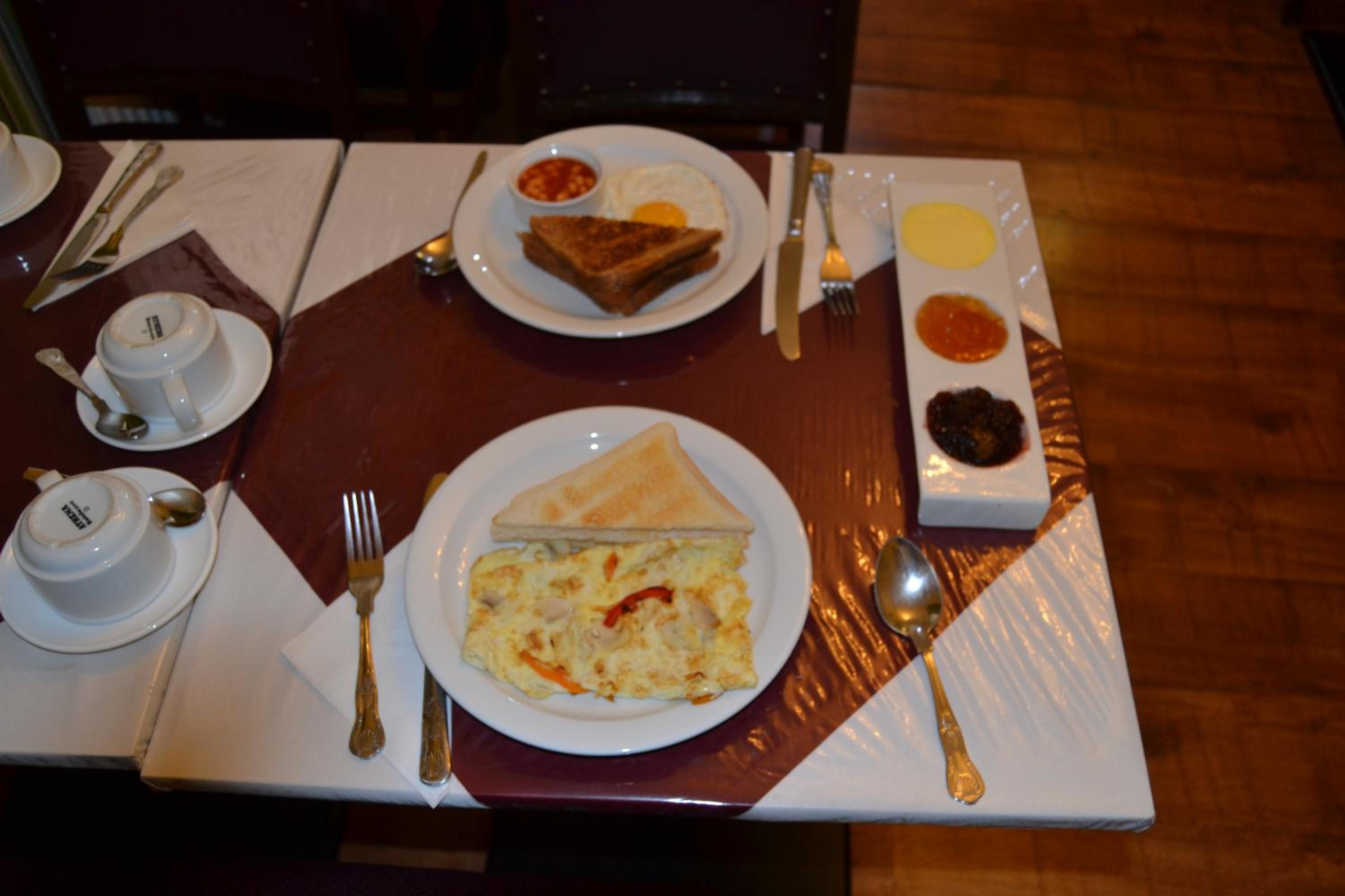 They swerved nearly no cooked food only scrambled eggs. The room was filthy and we had to clean it ourselves. Everything in the room was broken ie wardrobe, draws, switches, doors. Kettle was filthy it was the worst hotel I’ve ever stayed in and I’ve booked some really bad ones in my time