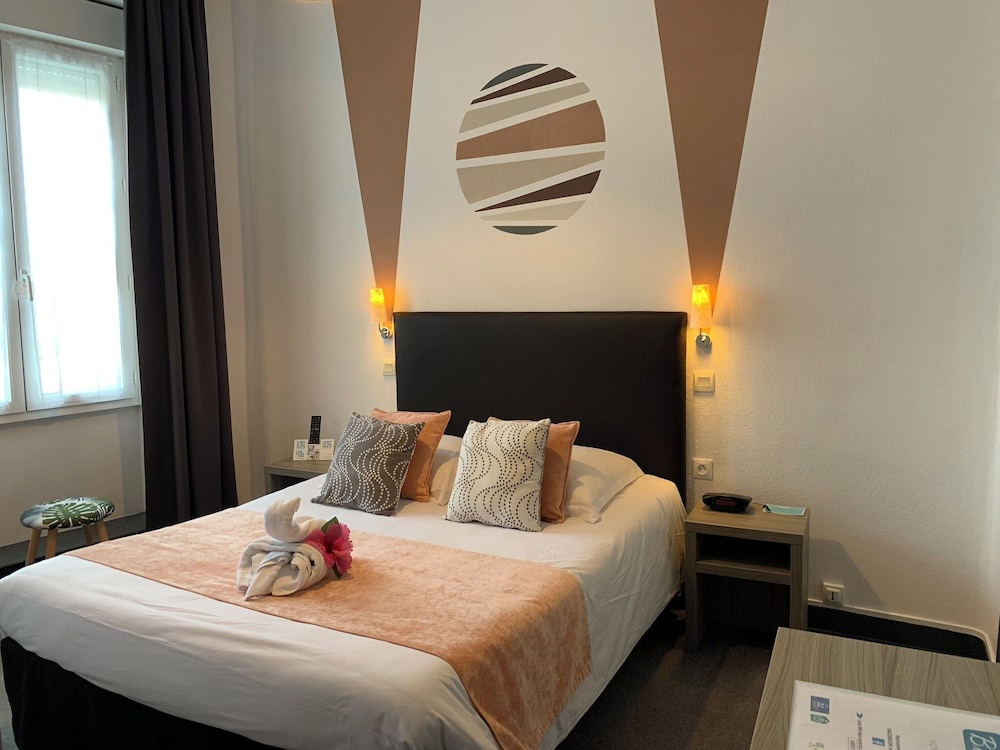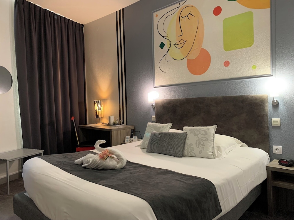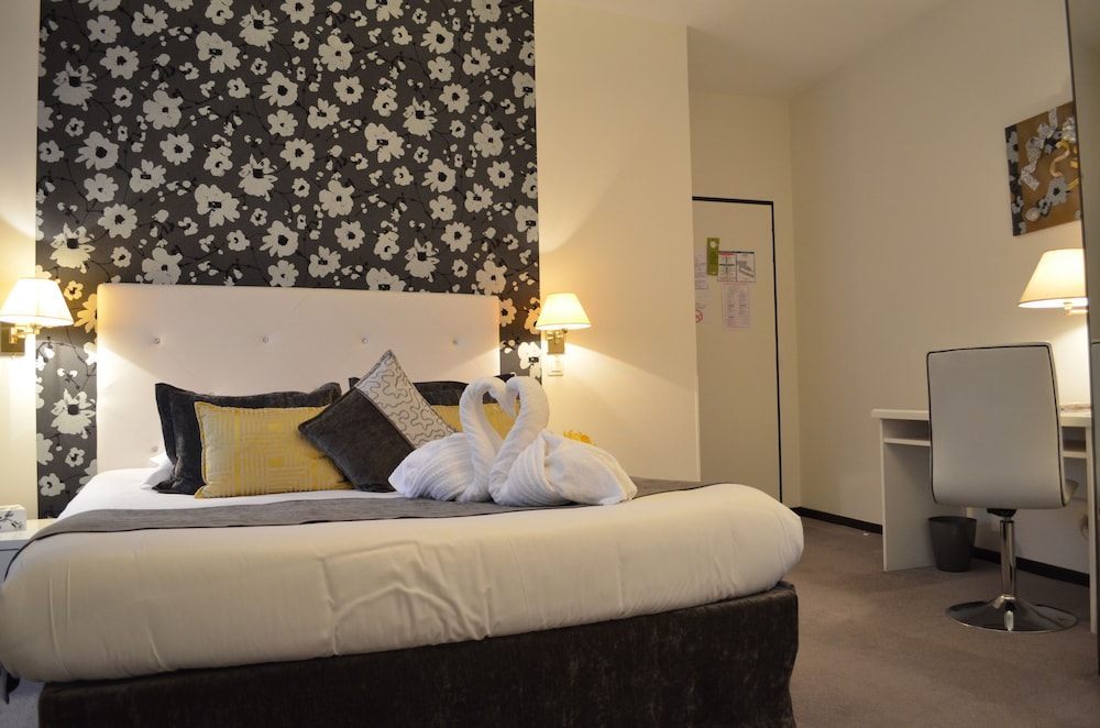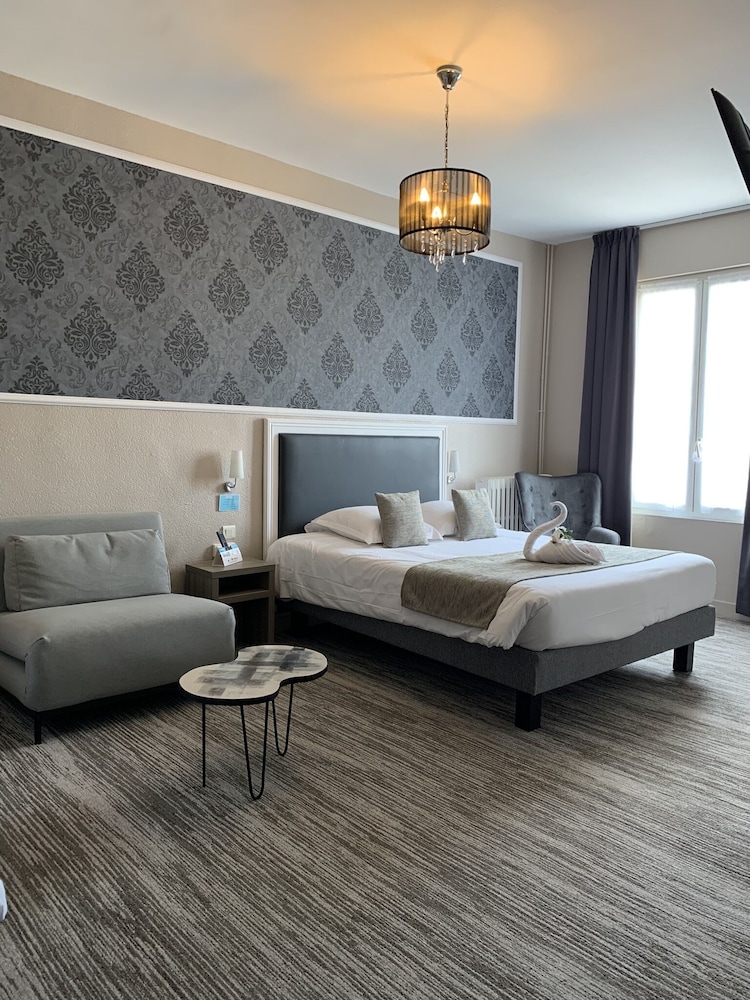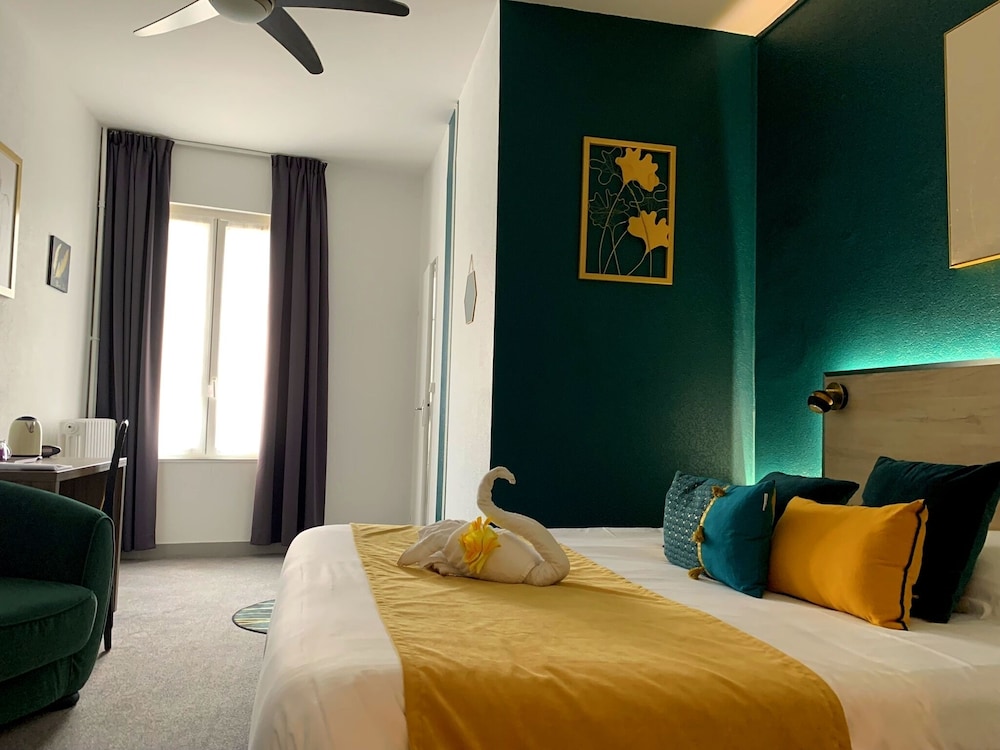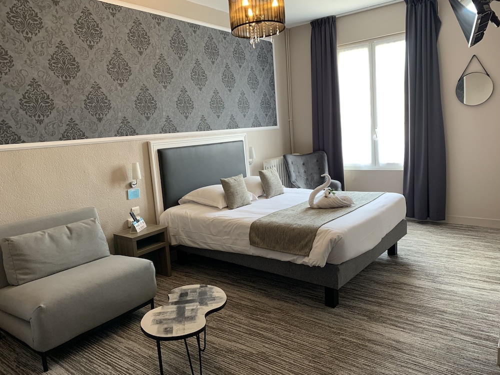 Très bel hôtel avec grand parking gratuit à proximité, proche des commerces. Chambre et salle d'eau très propre et confortable, volets plus rideaux des rangements un bureau et magnifique cigne en serviette c'est très accueillant. Personnel très aimable, dommage qu'il n'y ait pas de service restauration. Mais hôtel vraiment atypique même si il y a 3 etages sans ascenseur, pour préserver le patrimoine, je trouve merveilleux et vraiment historique. Préservons notre patrimoine pour savoir d'où nous venons, on peut se ressourcer.