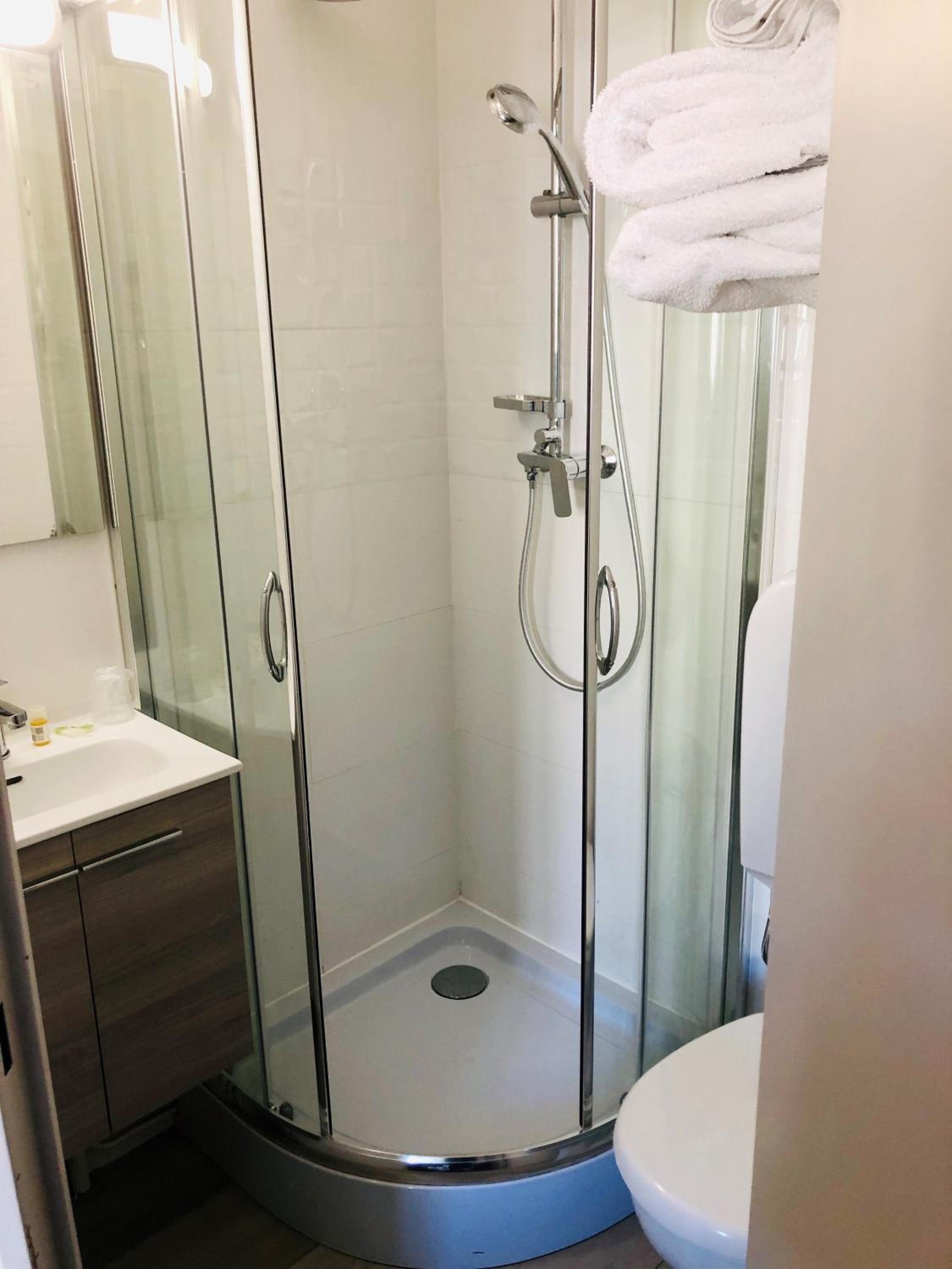 La pulizia della camera lascia un po a desiderare come anche gli spazi ridottissimi. Letto un po sfondato e box doccia senza le porte sostituite con un telo. Asciugameni a disposizione piccoli.