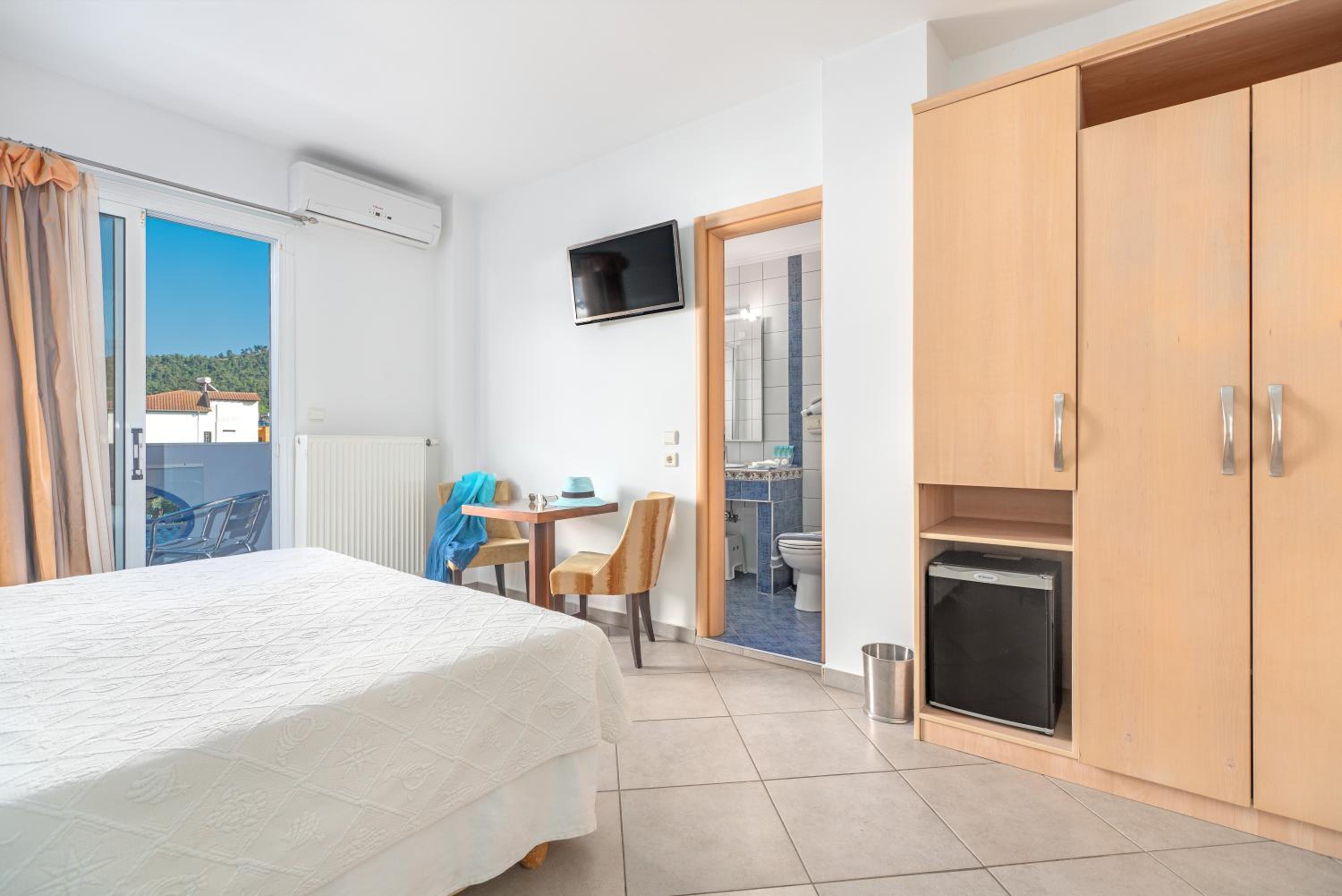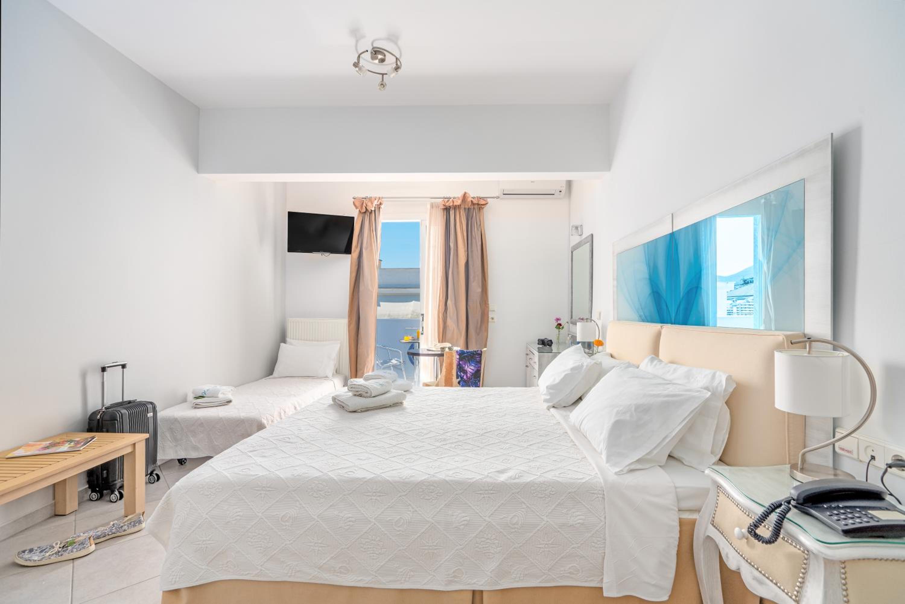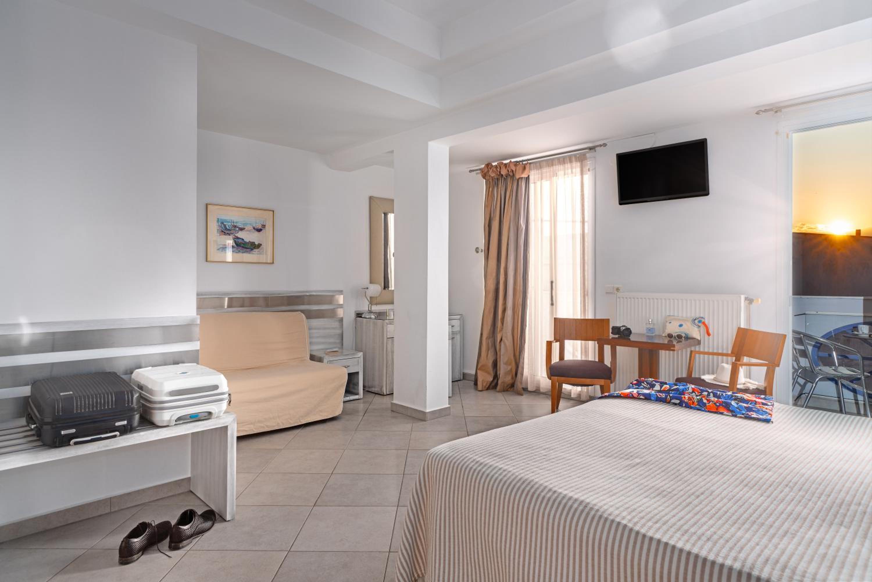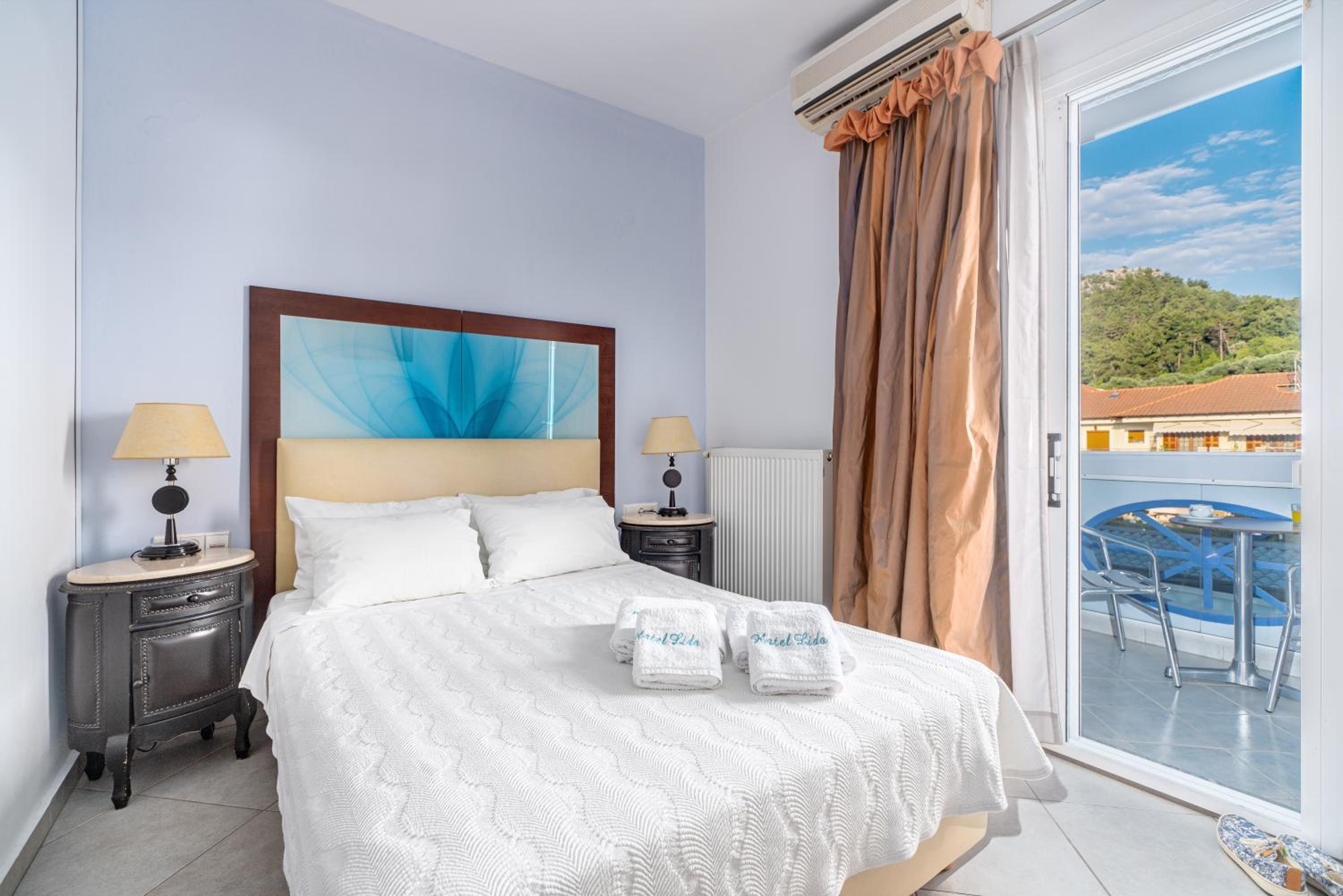 Sun Terrace and Stylish Rooms: Enjoy the large sun terrace with leather loungers, bright and spacious rooms with tasteful décor, and en suite bathrooms at Hotel Lido Thassos.
