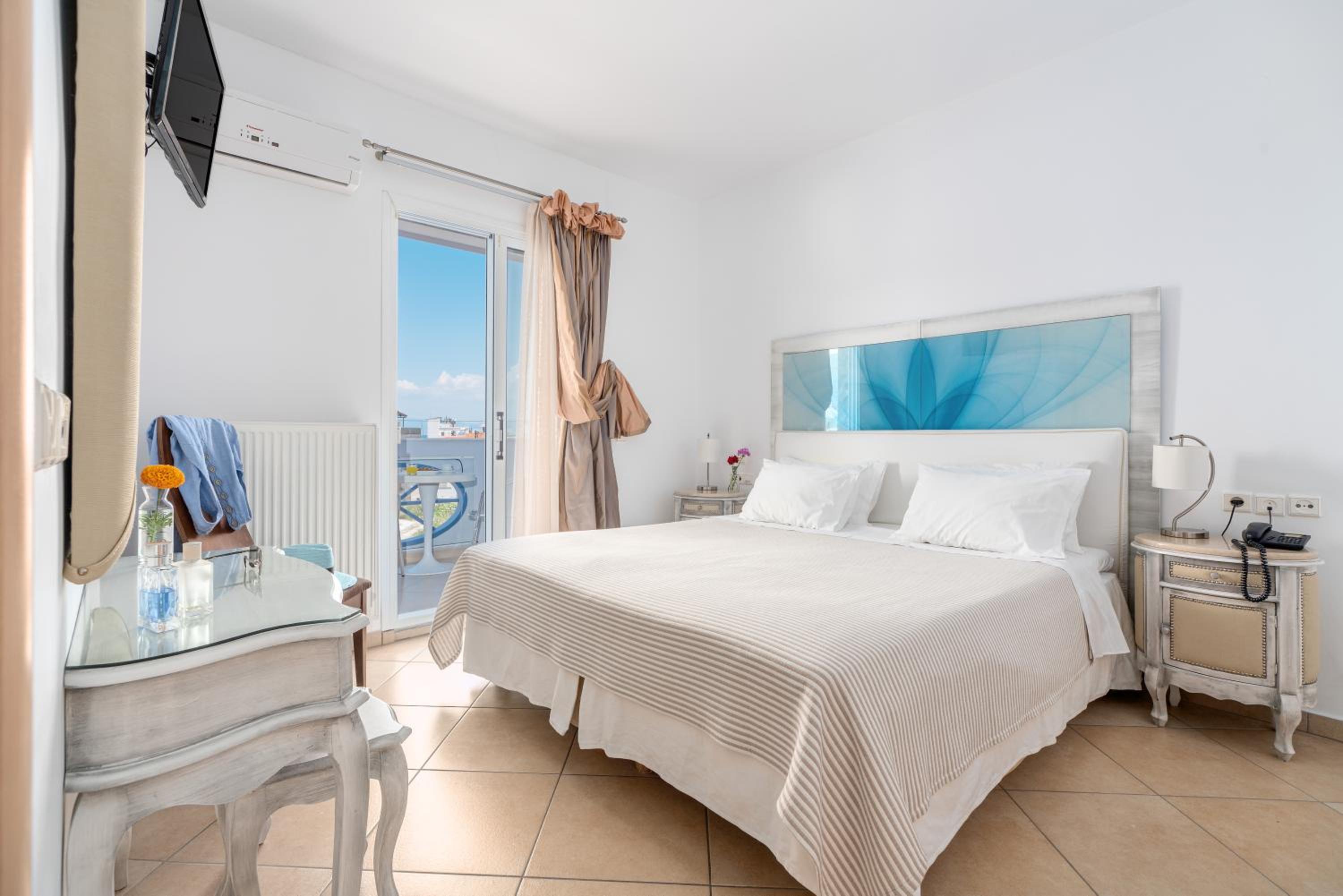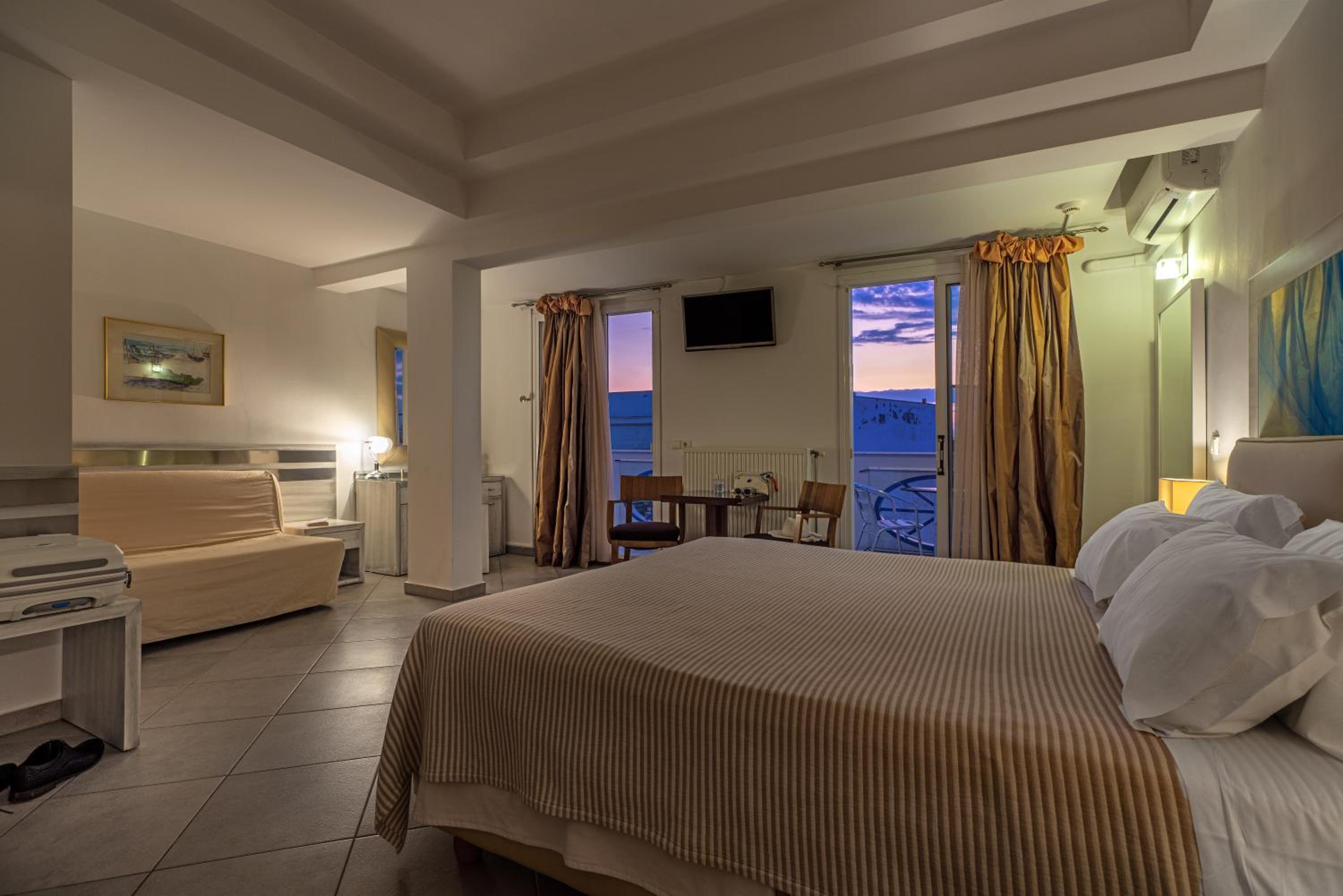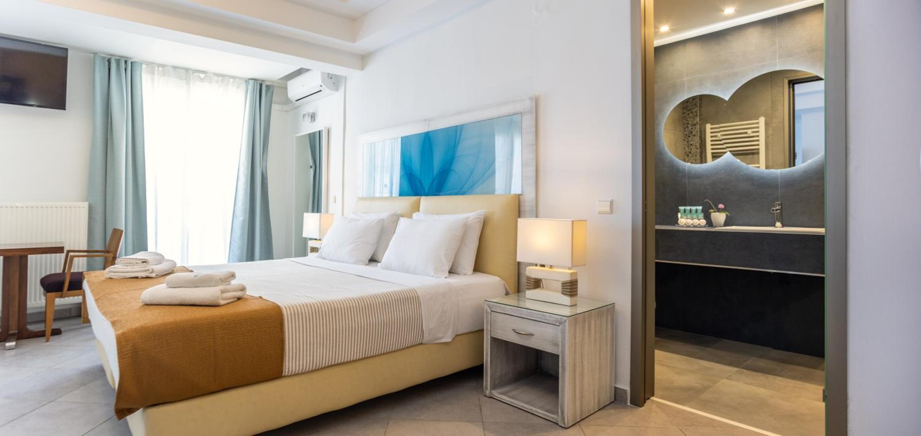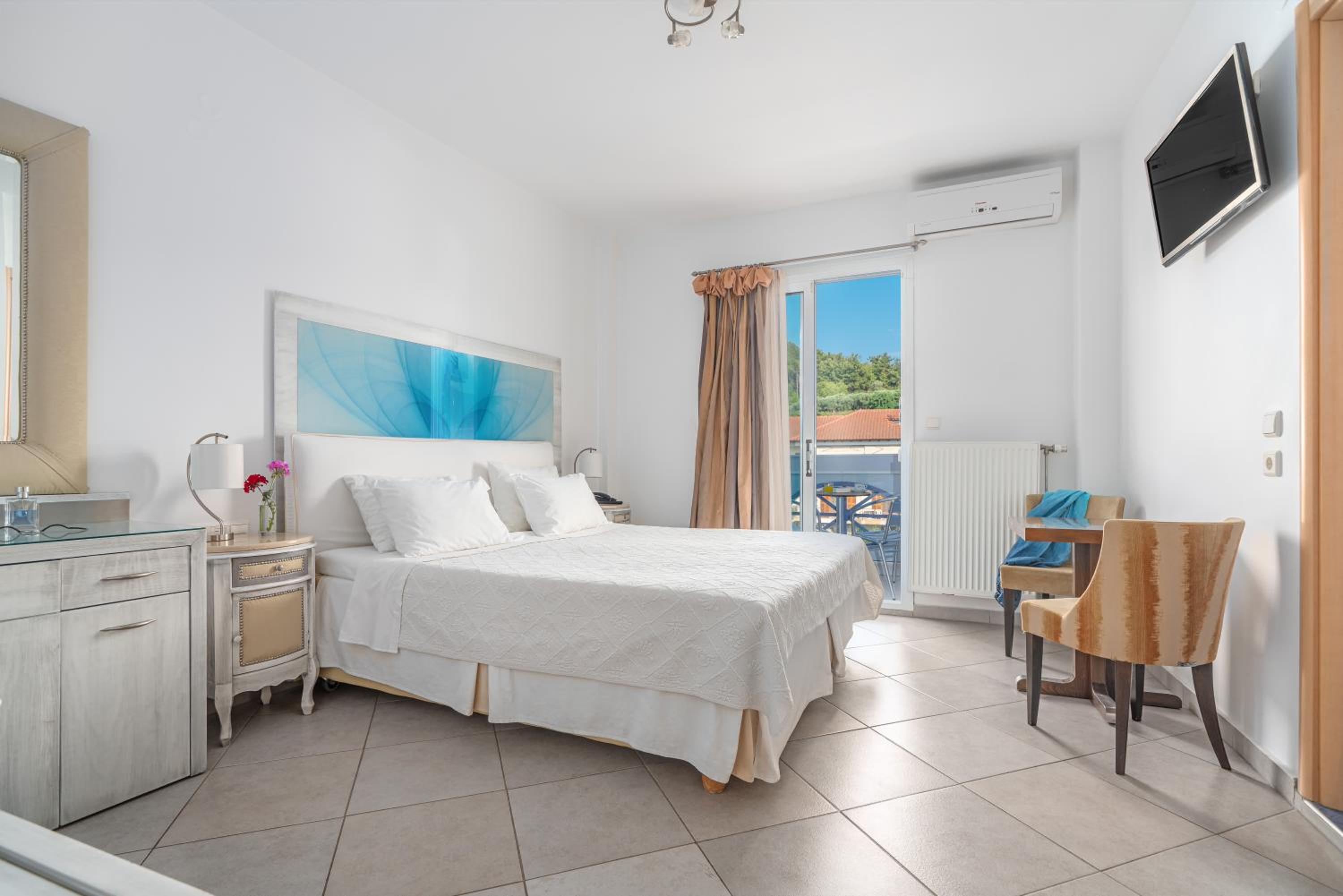 Sun Terrace and Stylish Rooms: Enjoy the large sun terrace with leather loungers, bright and spacious rooms with tasteful décor, and en suite bathrooms at Hotel Lido Thassos.