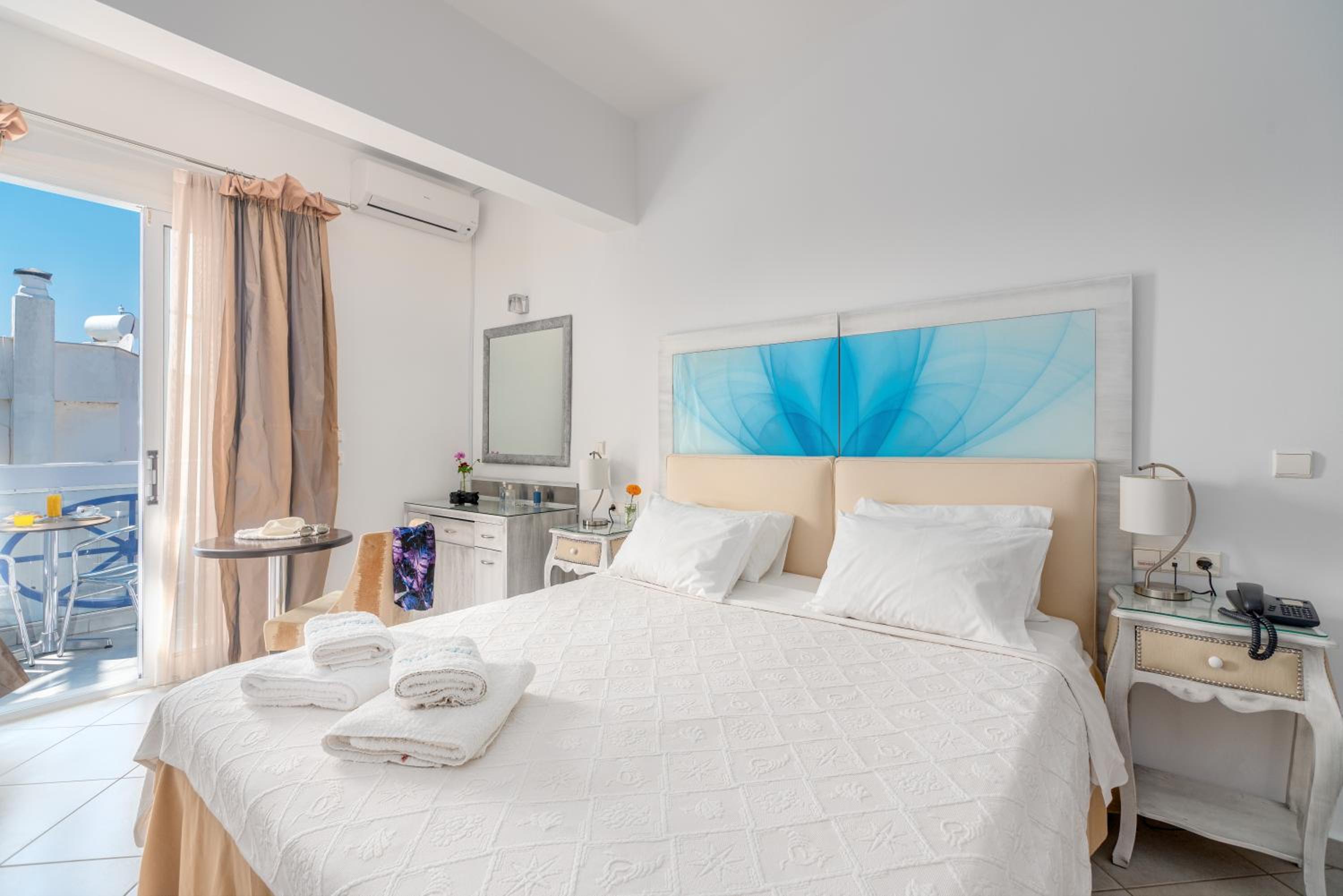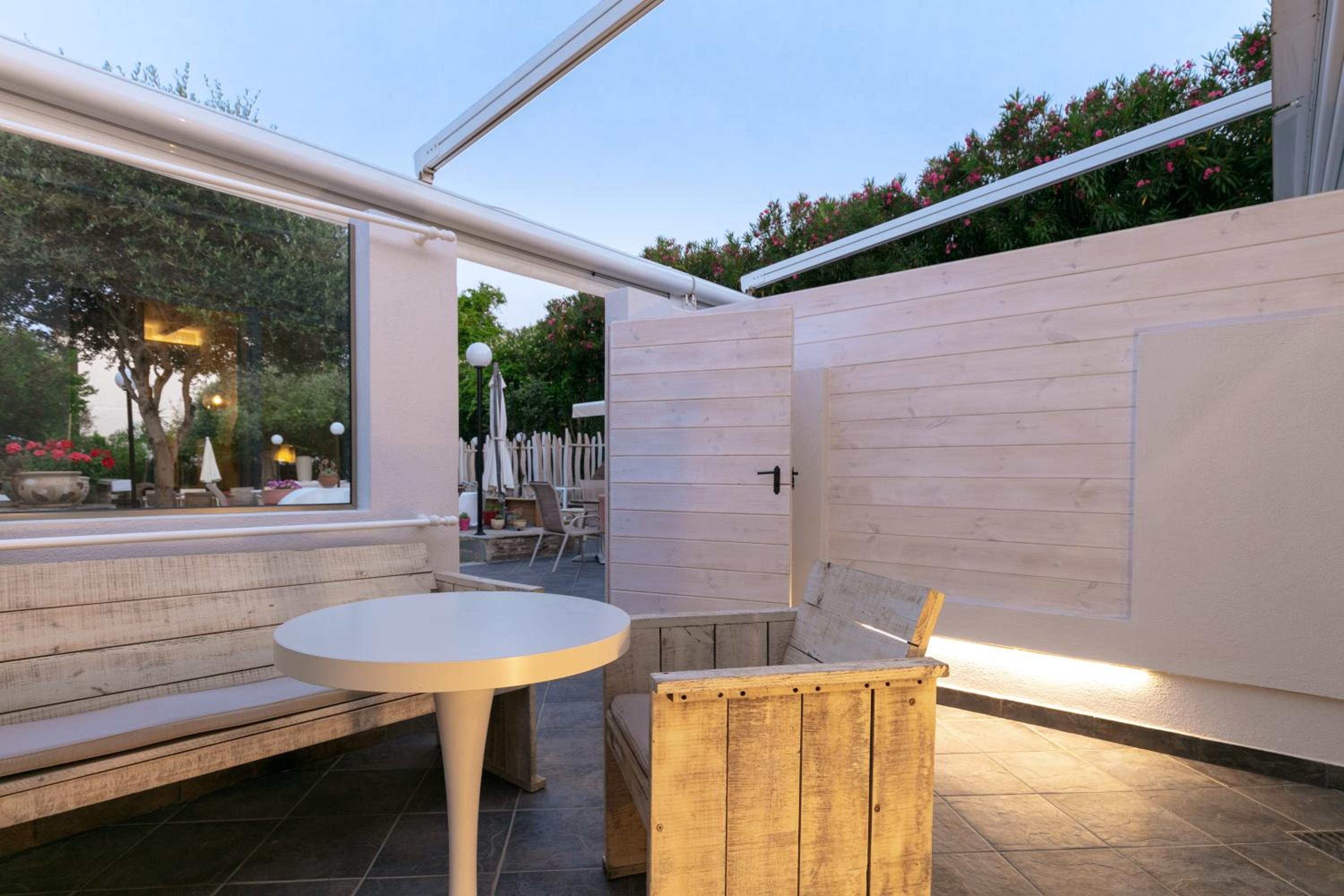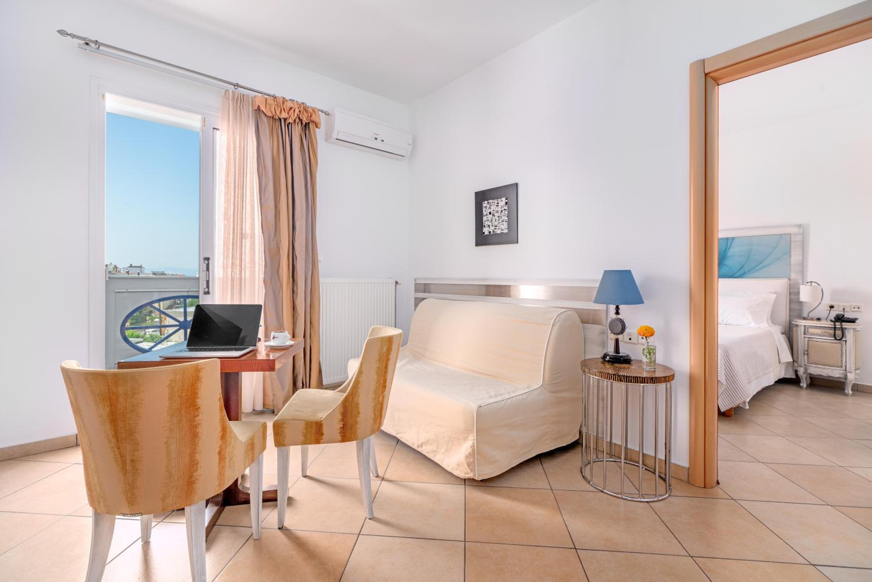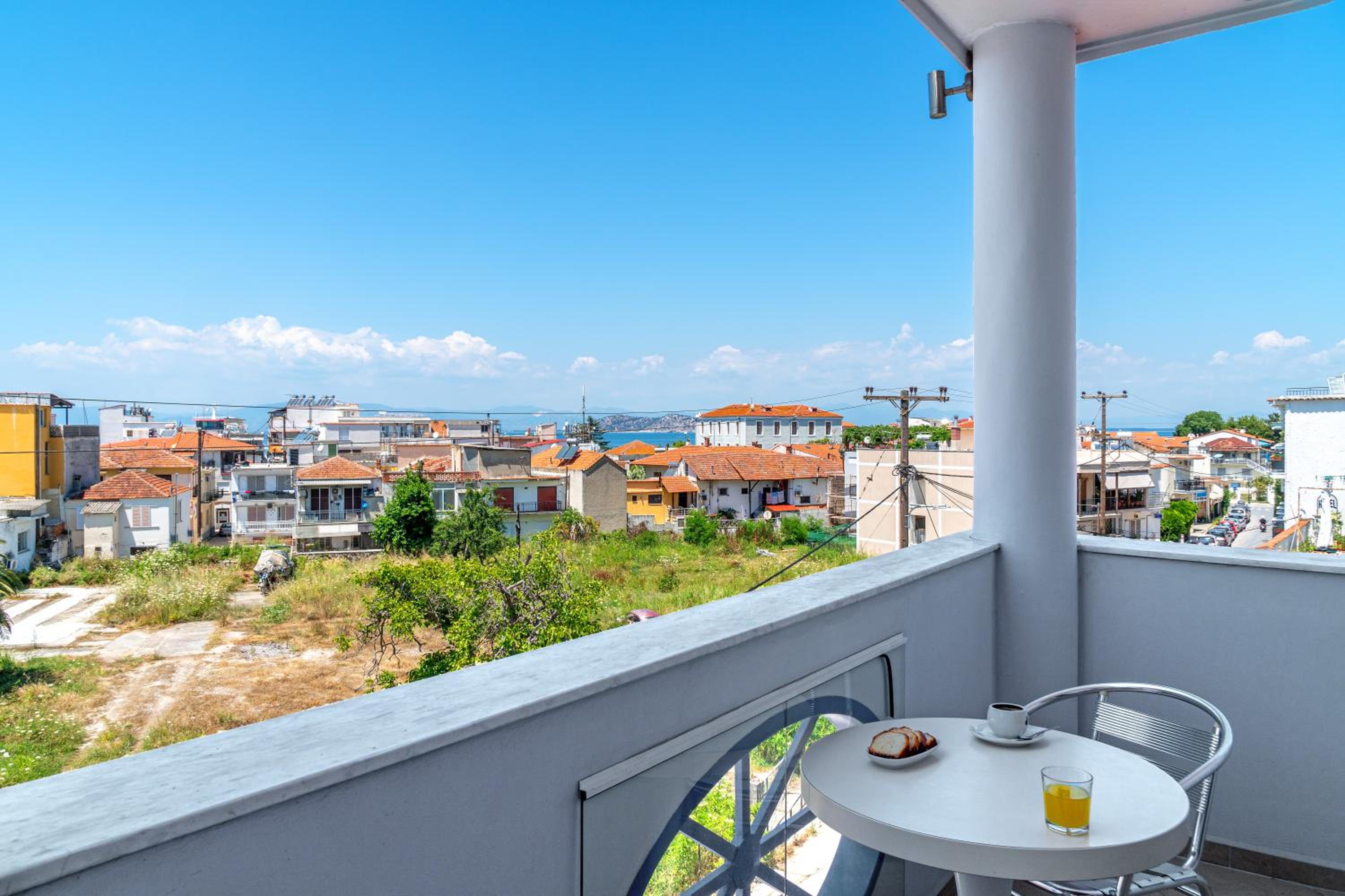 Sun Terrace and Stylish Rooms: Enjoy the large sun terrace with leather loungers, bright and spacious rooms with tasteful décor, and en suite bathrooms at Hotel Lido Thassos.