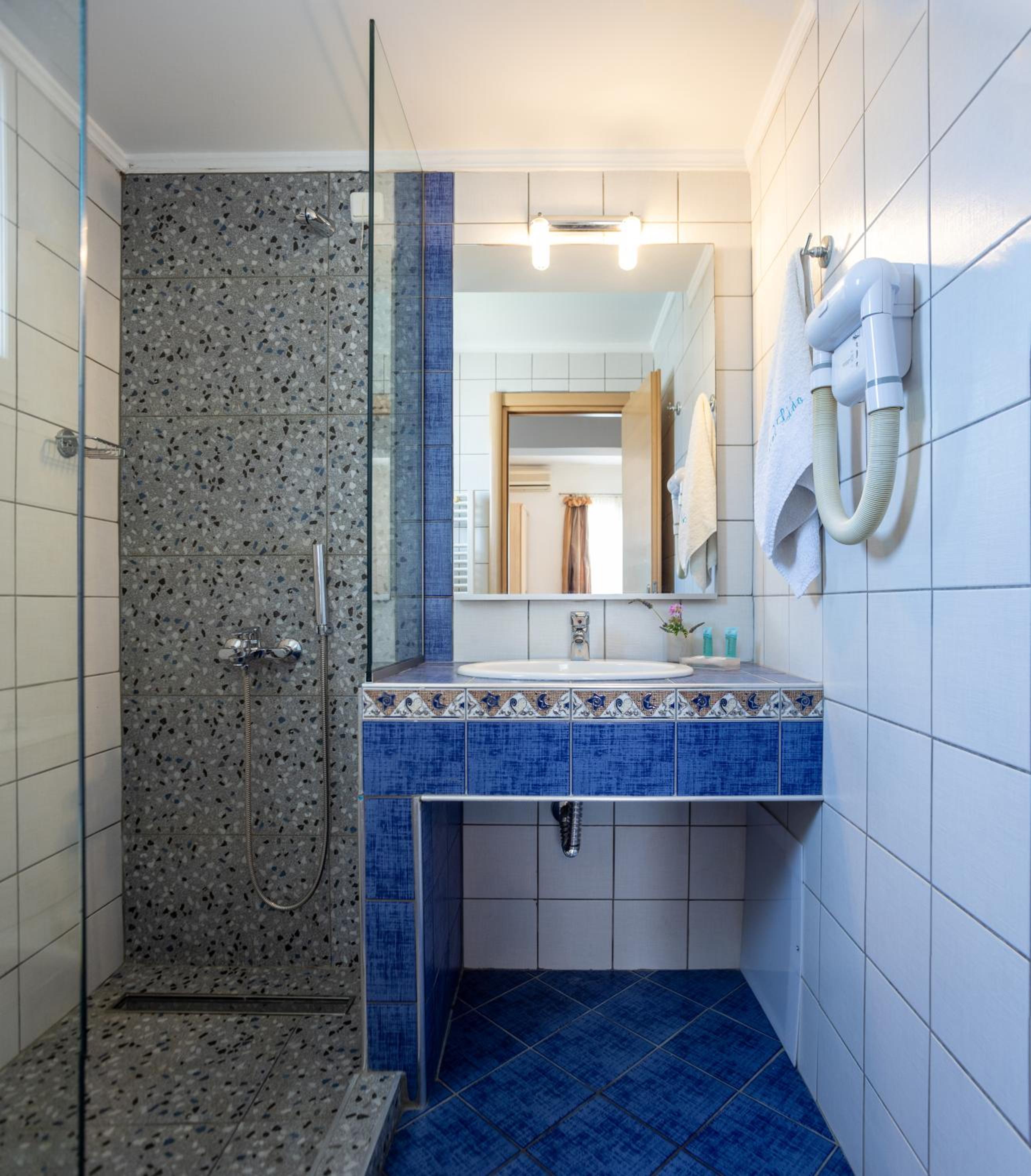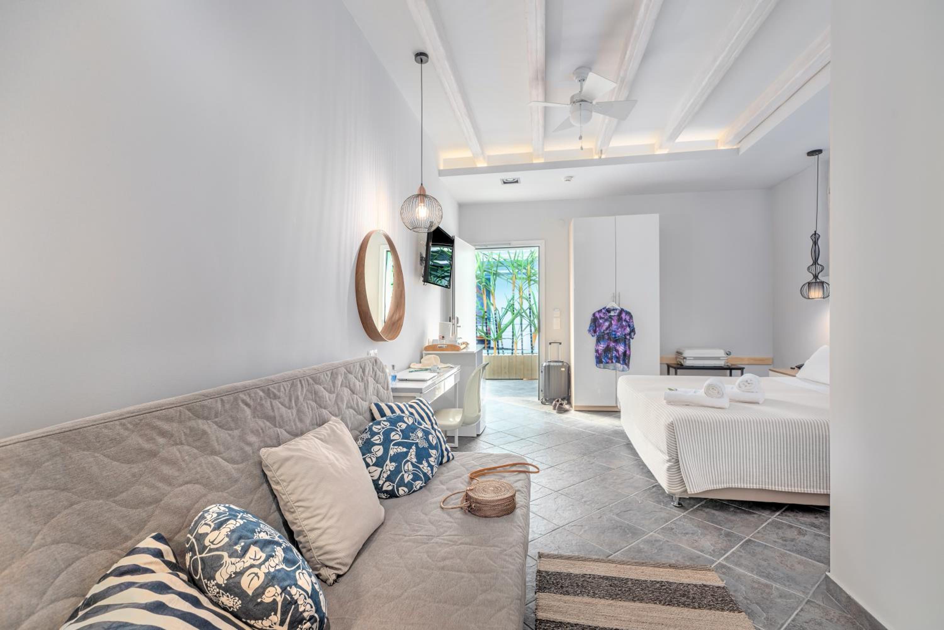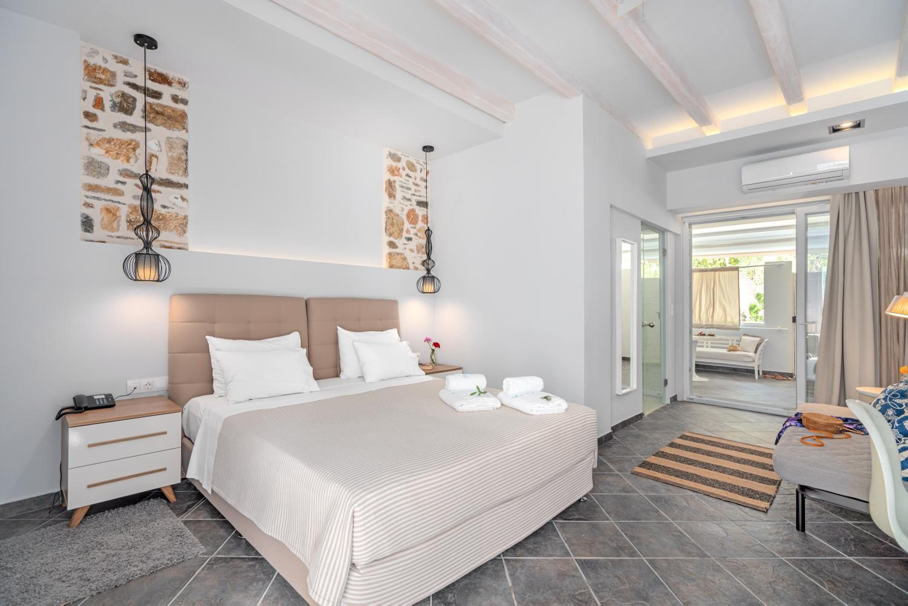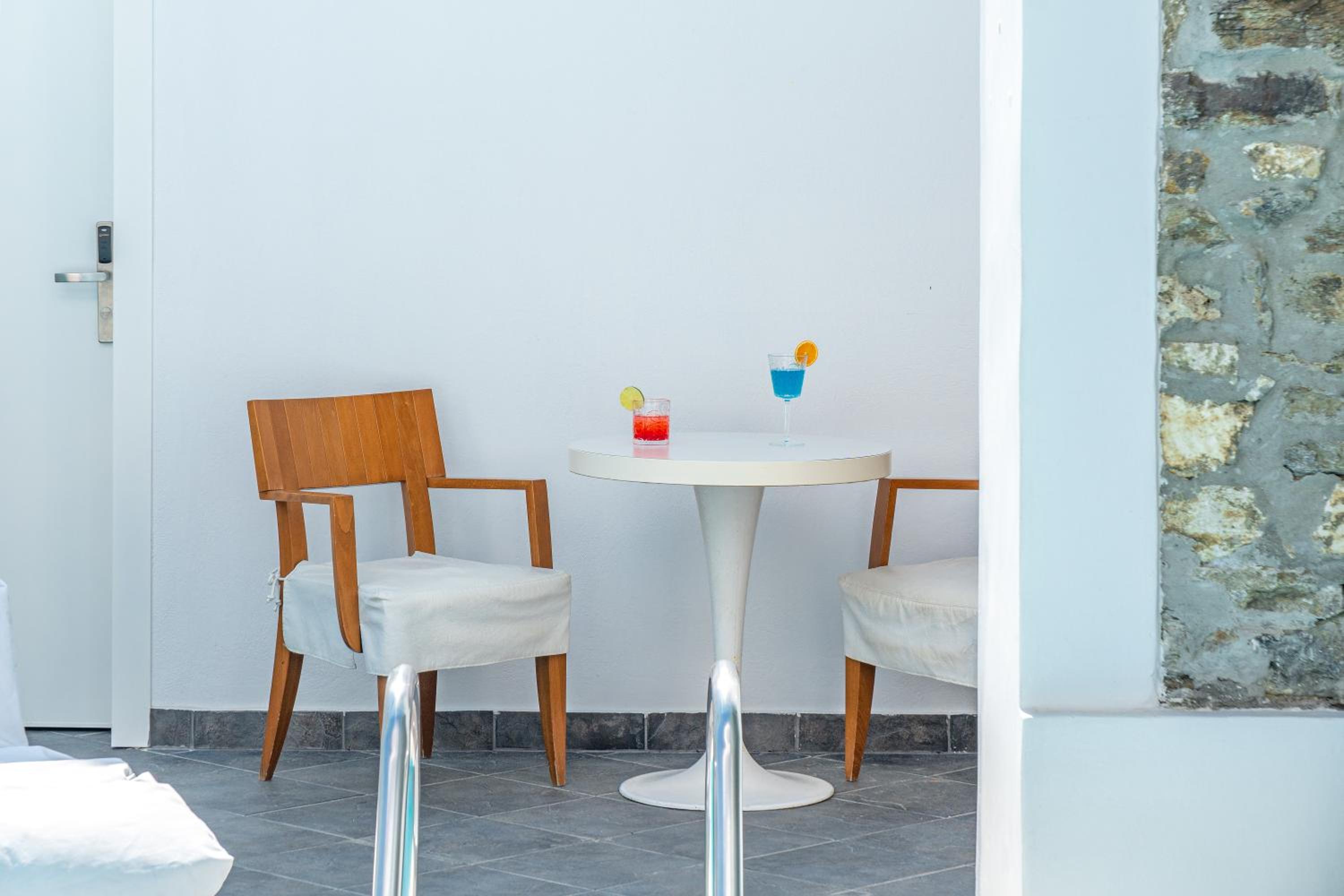 Sun Terrace and Stylish Rooms: Enjoy the large sun terrace with leather loungers, bright and spacious rooms with tasteful décor, and en suite bathrooms at Hotel Lido Thassos.