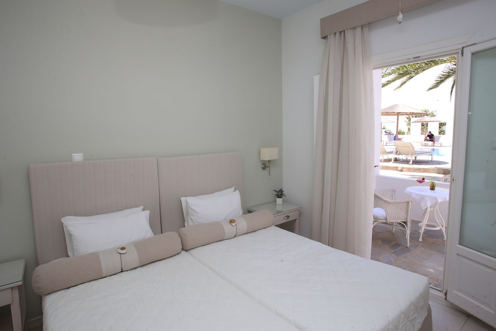 A fantastic hotel ,away from the madding crowd , with excellent service and very helpful staff . The breakfast was the best I experienced while travelling around the Greek islands . The sandy beach area by the side of hotel is also a plus . Although a vehicle would be good to travel the island I found the bus service good as one can see many villages and beach areas travelling to the main town .