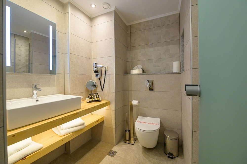 Our room was fine with a walk in shower as requested by our tour company . Beds & pillows were very comfortable, possibly the best ones on our whole tour of staying in 7 different hotels .