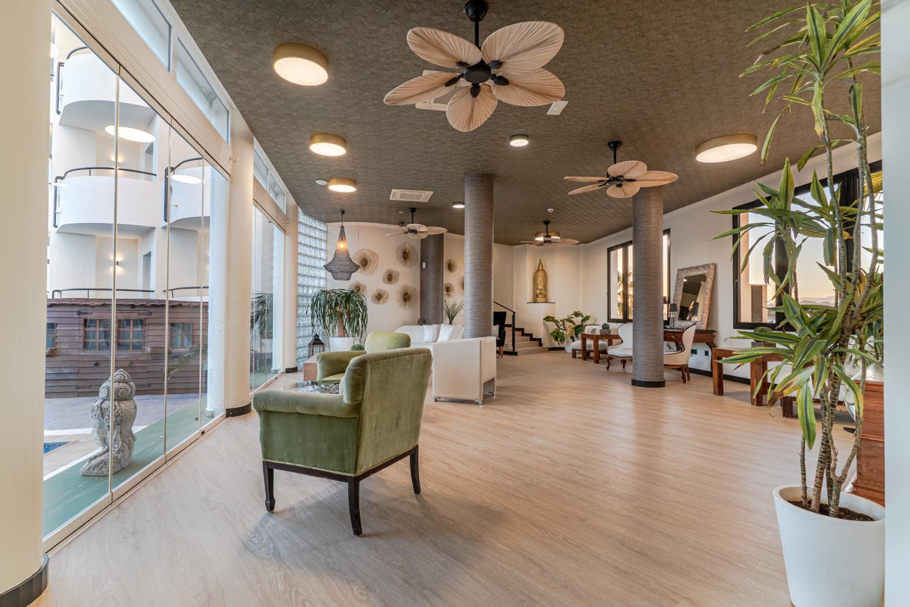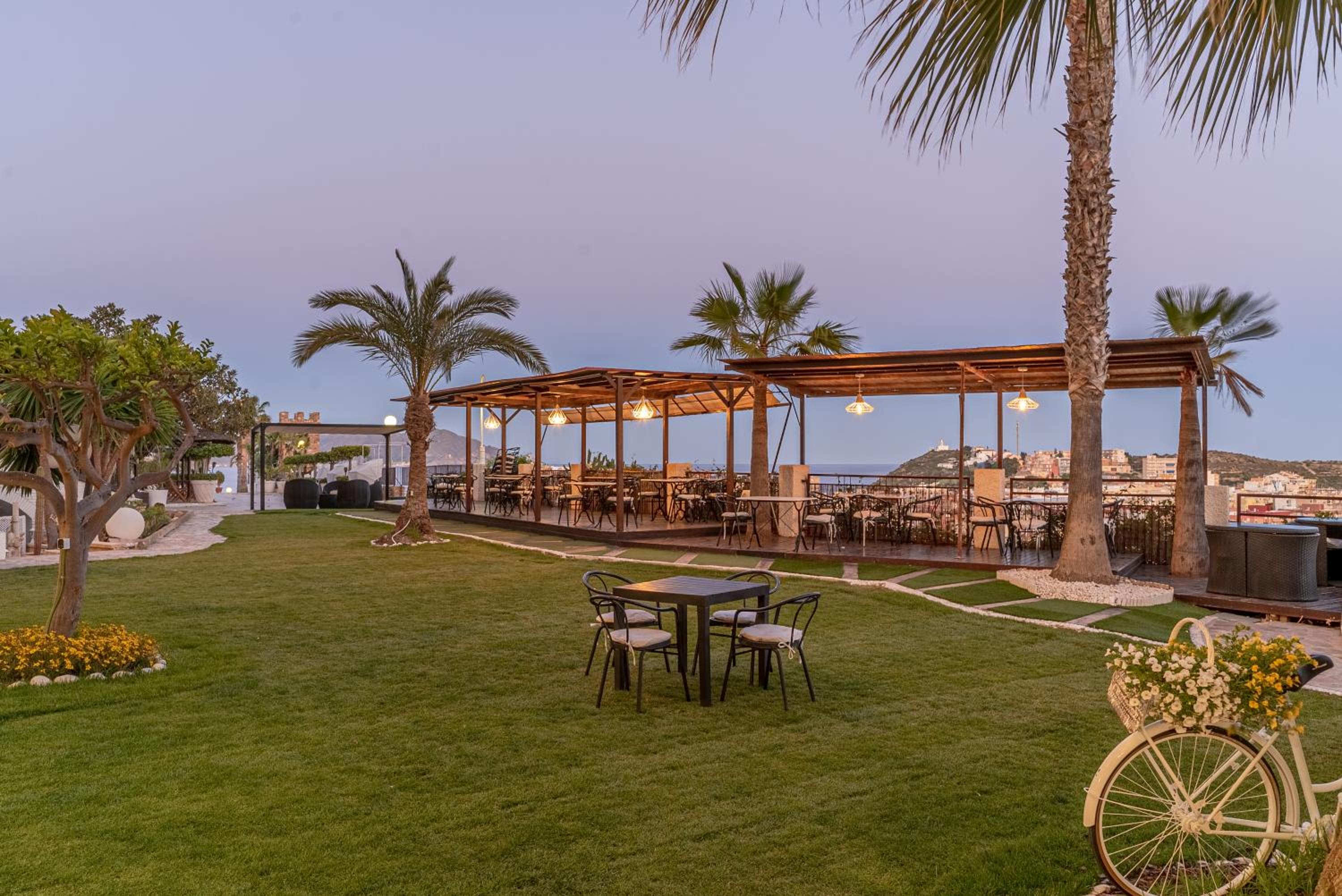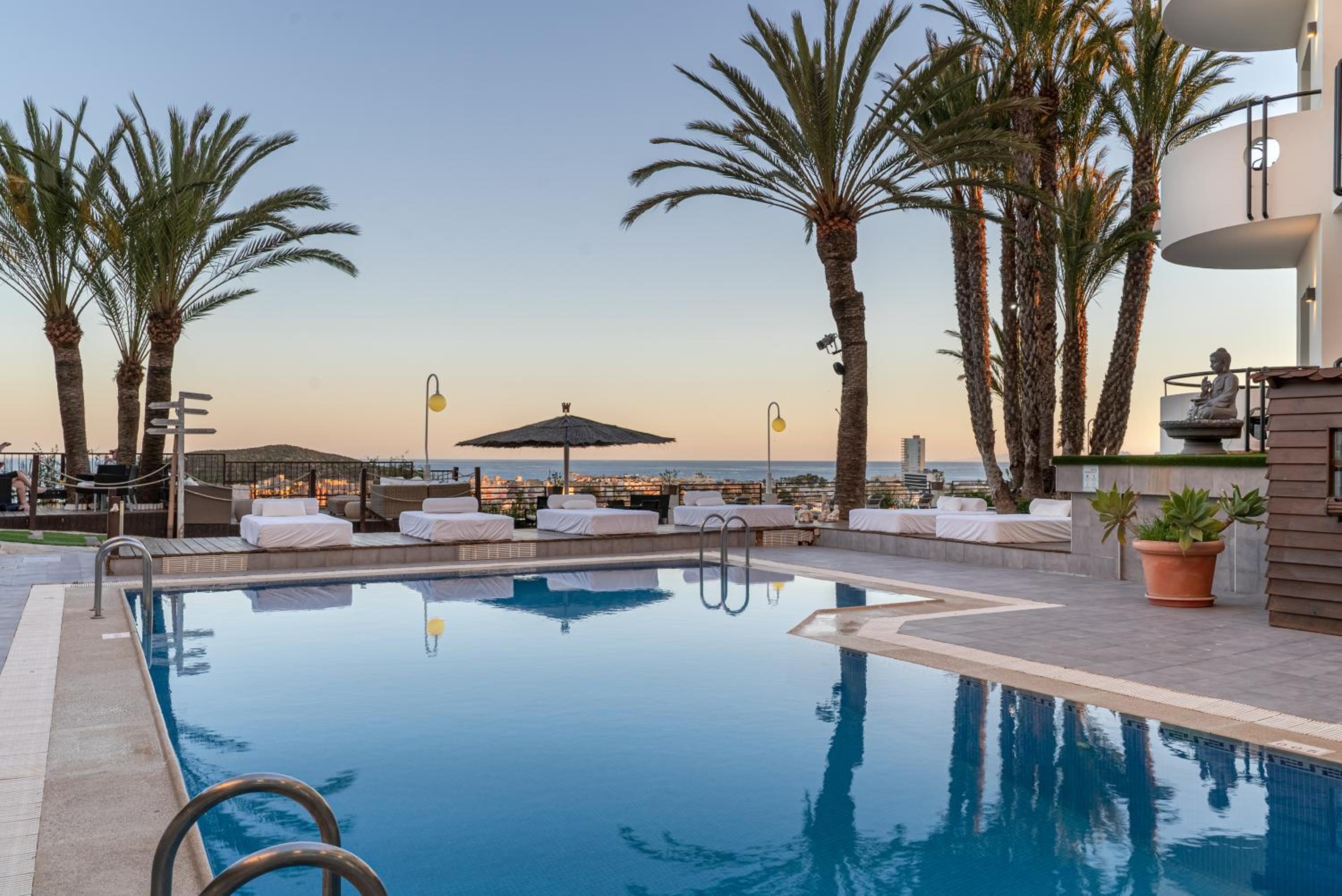 La zona chill out, piscina y restaurante en la terraza.