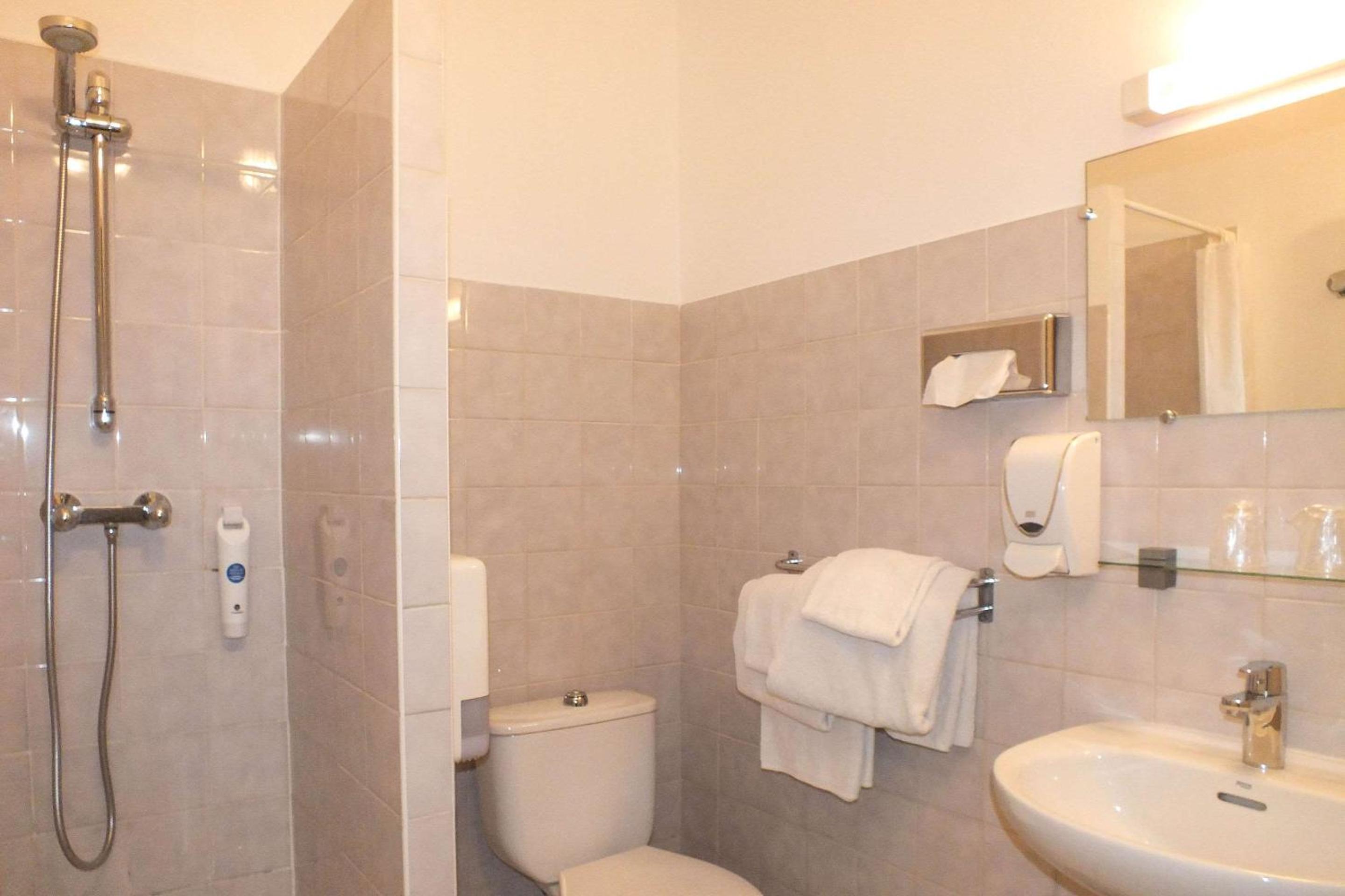 Pas de savon ni gel douche. Rideau de douche déchiré. Pas de mousseur sur le robinet lavabo.