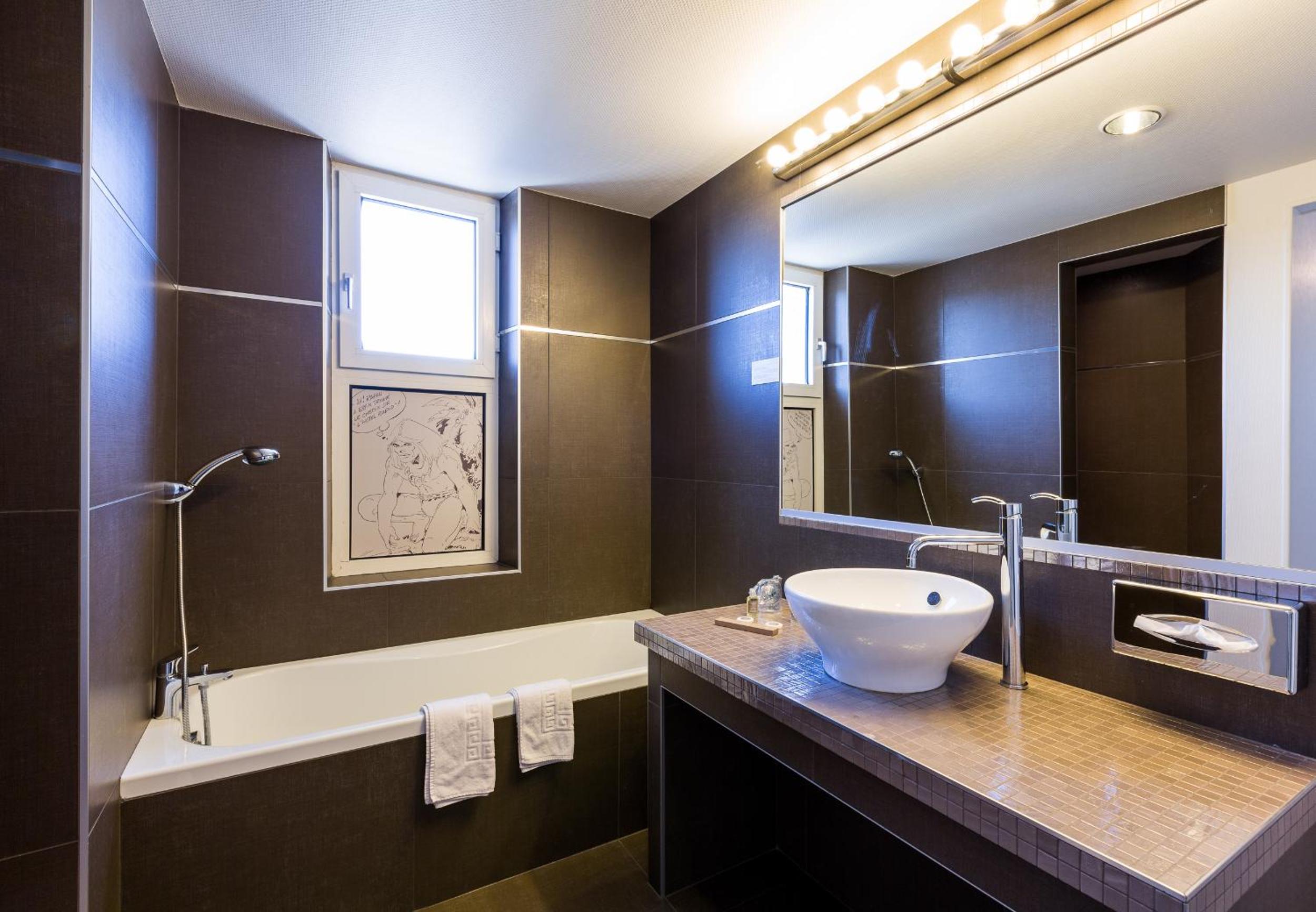 Le style art déco de l'hôtel, son emplacement, le parking mis a disposition et le calme.