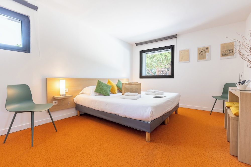 A savoir que toutes les chambres donnent du même côté (côté mer et route). Nous avions une chambre donnant sur la pinède ( traduction : chambre au 1er étage avec balcon donnant sur les arbres et juste au dessus du parking).