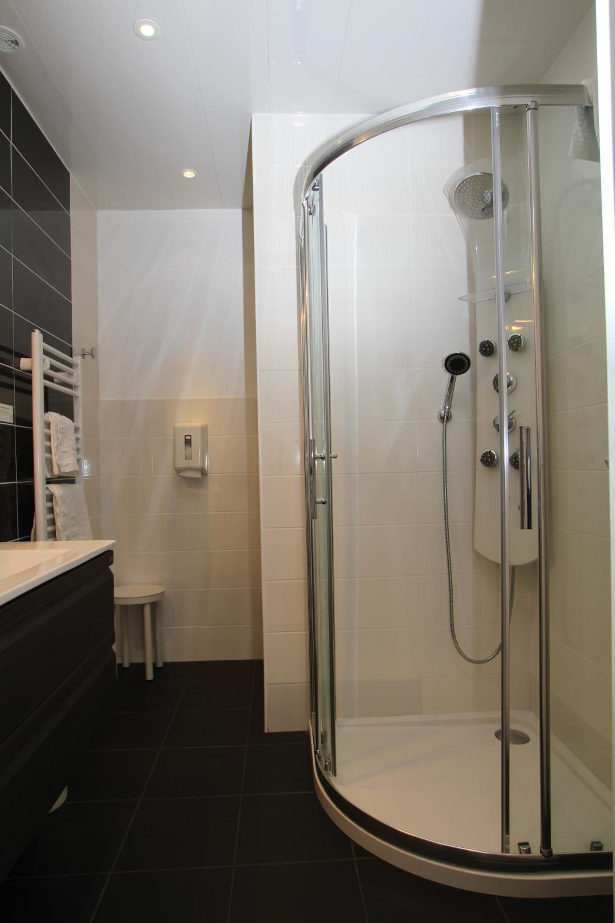 Each room at the hotel is equipped with modern amenities, including a flat-screen TV with Canal+ channels and a private bathroom. The unique decor and parquet floors add a touch of elegance to the cozy accommodations.