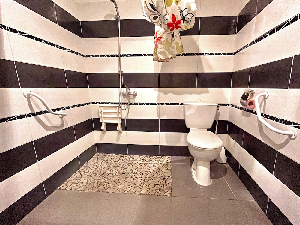 Salle de bain insuffisamment équipée : porte savon, tapis de sol, prise électrique