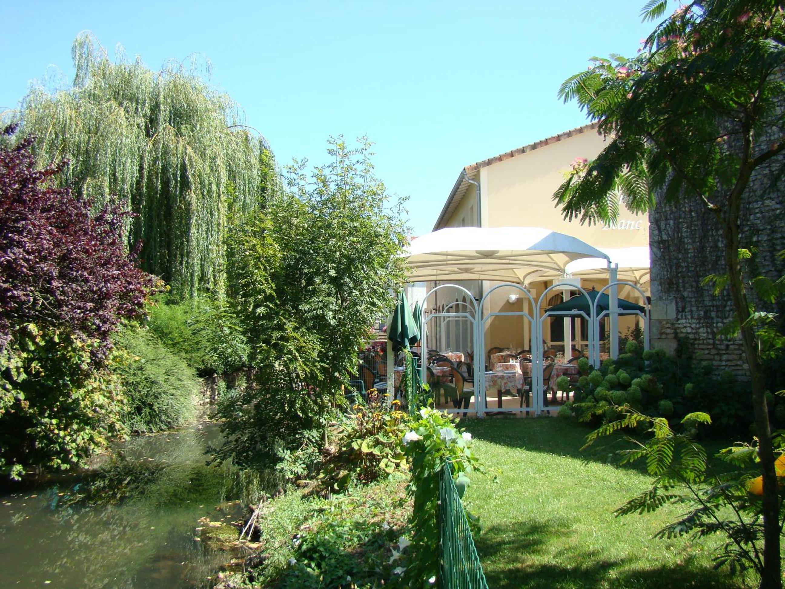 Logis Le Cheval Blanc et Le Clovis in Vouillé offers a serene terrace and a cozy bar for guests to unwind and enjoy their stay.