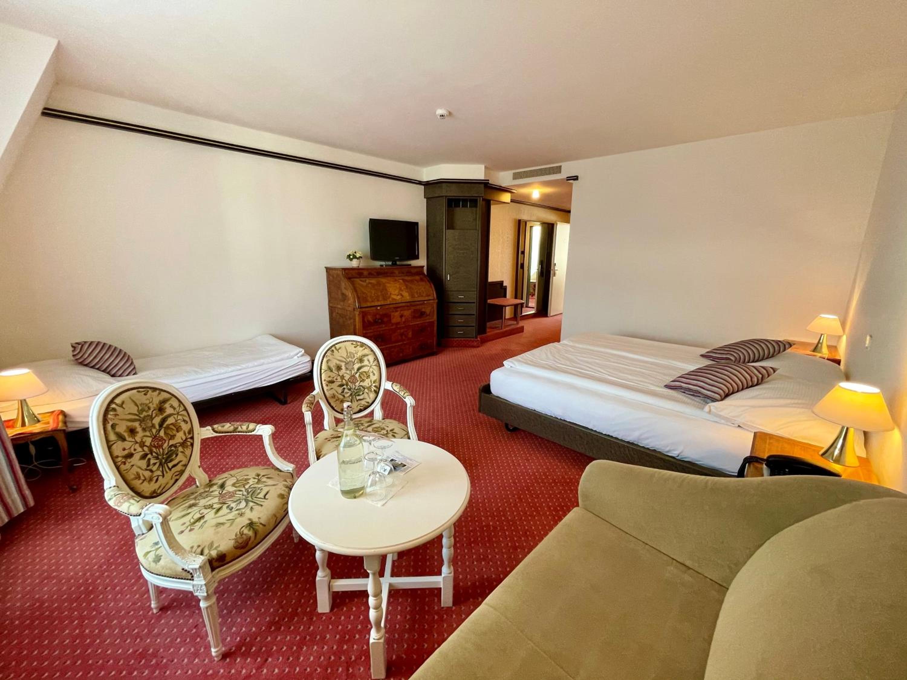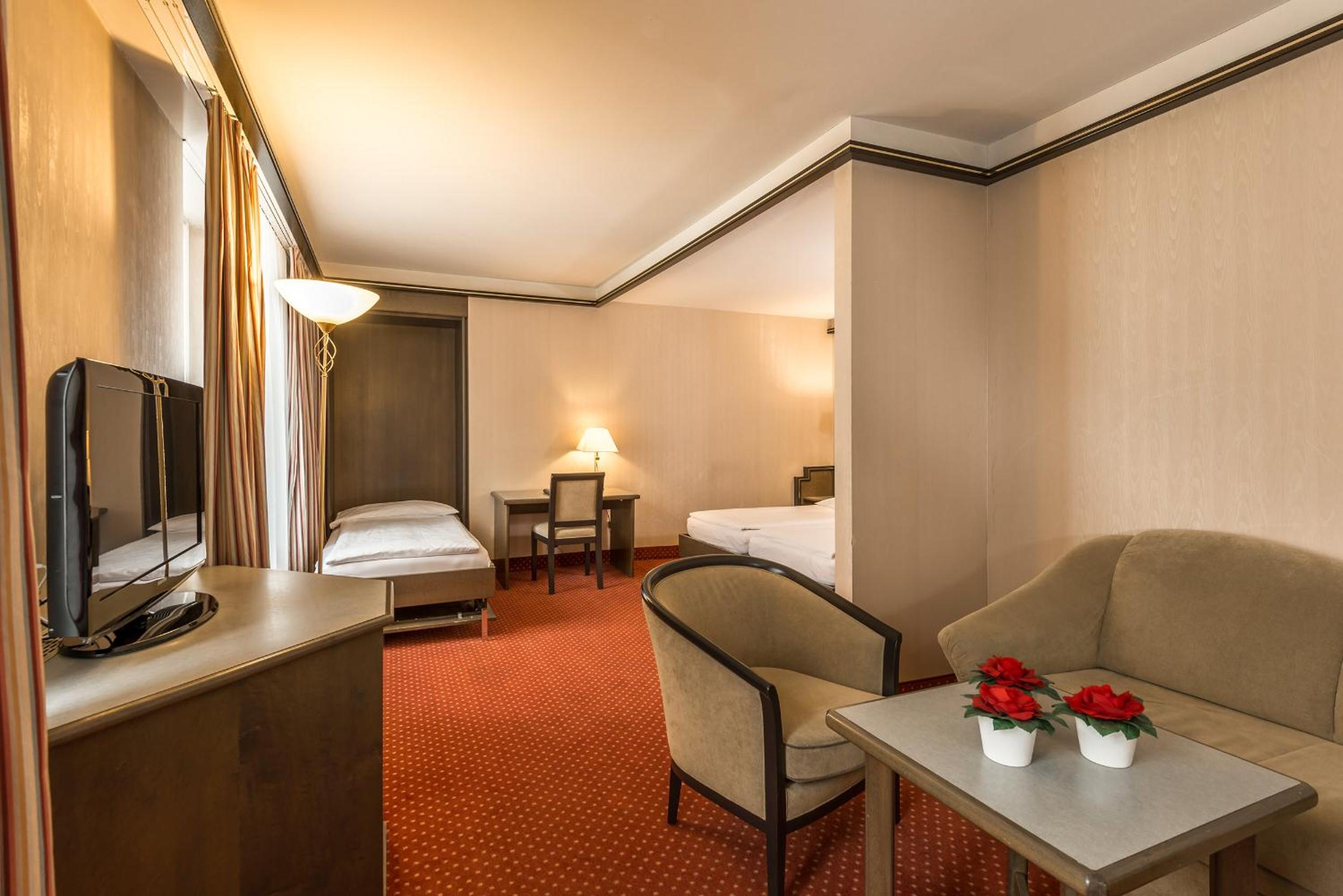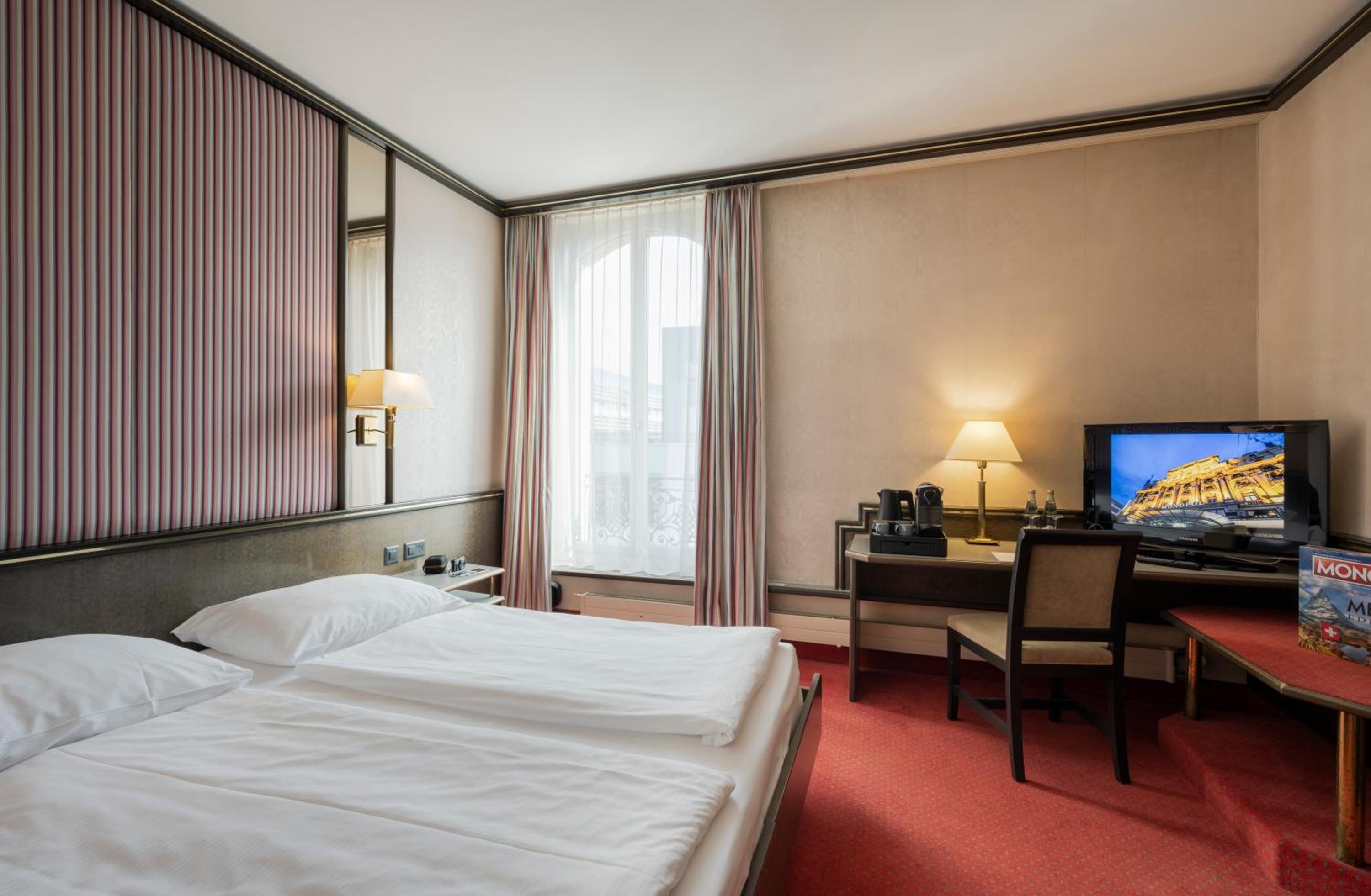 The spacious, non-smoking rooms at Hotel Monopol are well-equipped with modern amenities including a small fridge, a safe, and a TV with 74 satellite channels. Additionally, the Suite Lounge & Bar on the 7th floor provides a cozy spot to enjoy a drink while soaking in breathtaking views of the city, lake, and mountains.