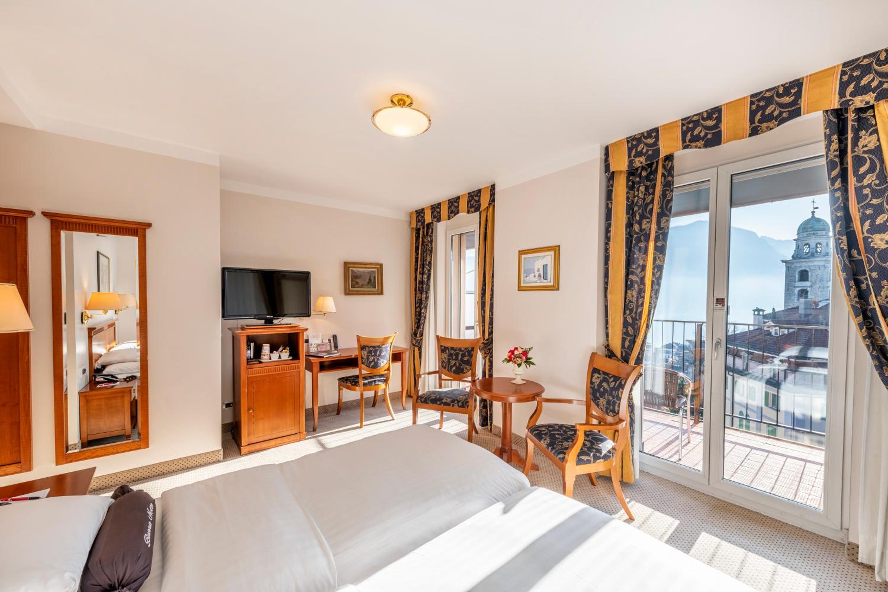 Nestled halfway up a hill, the hotel provides serene rooms with picturesque views of Monte Bré or the charming town below.